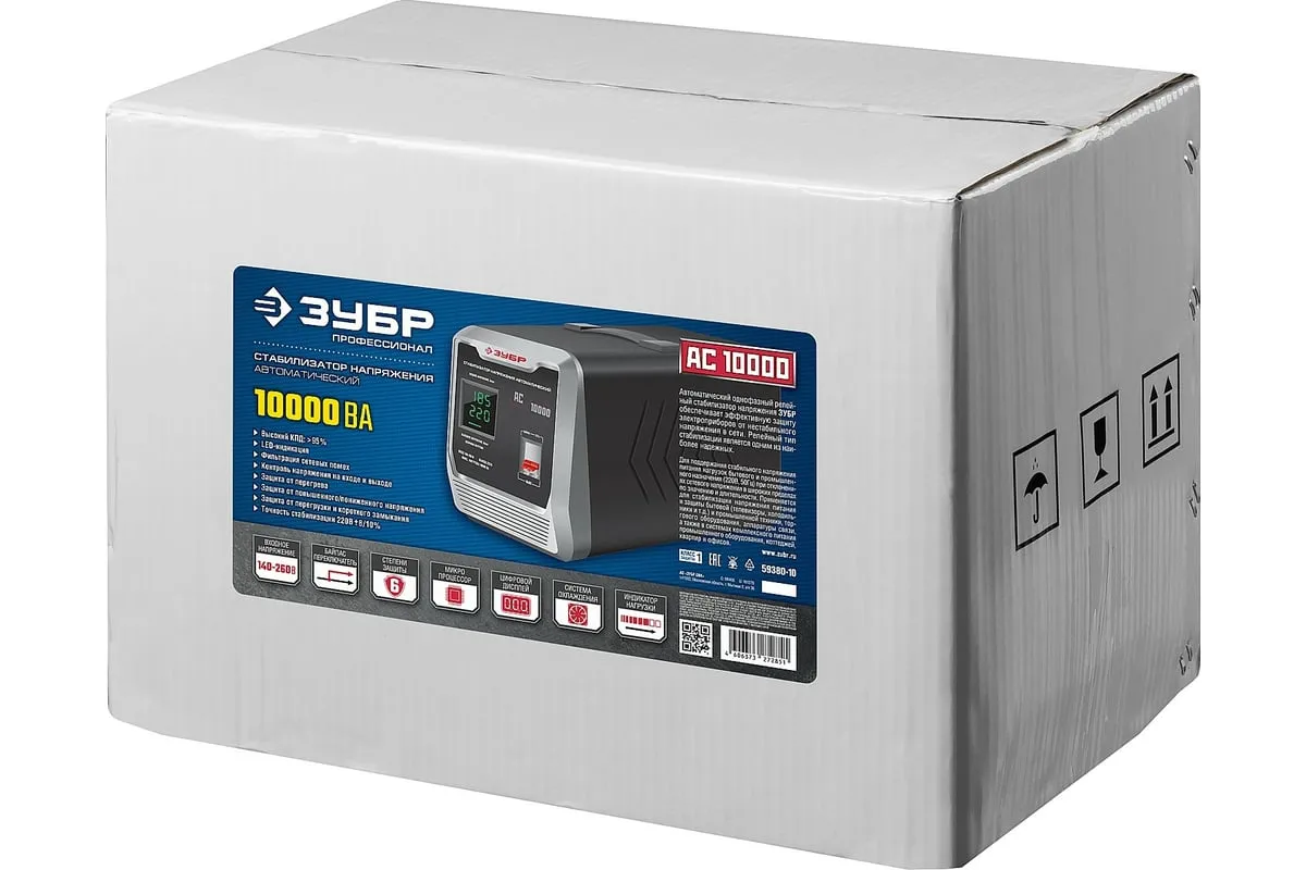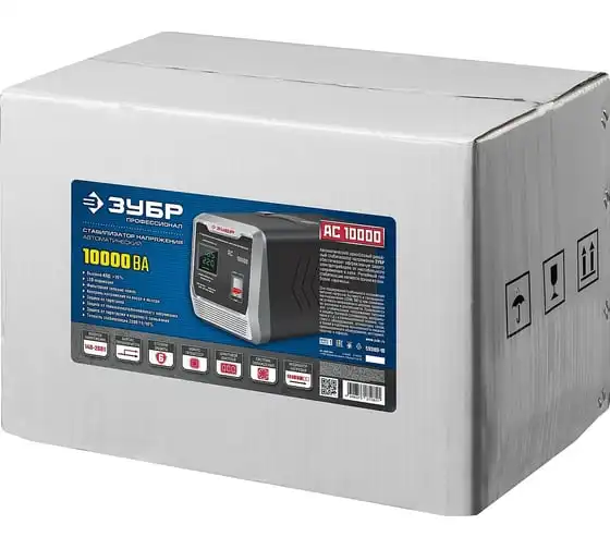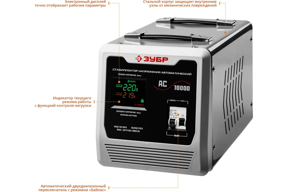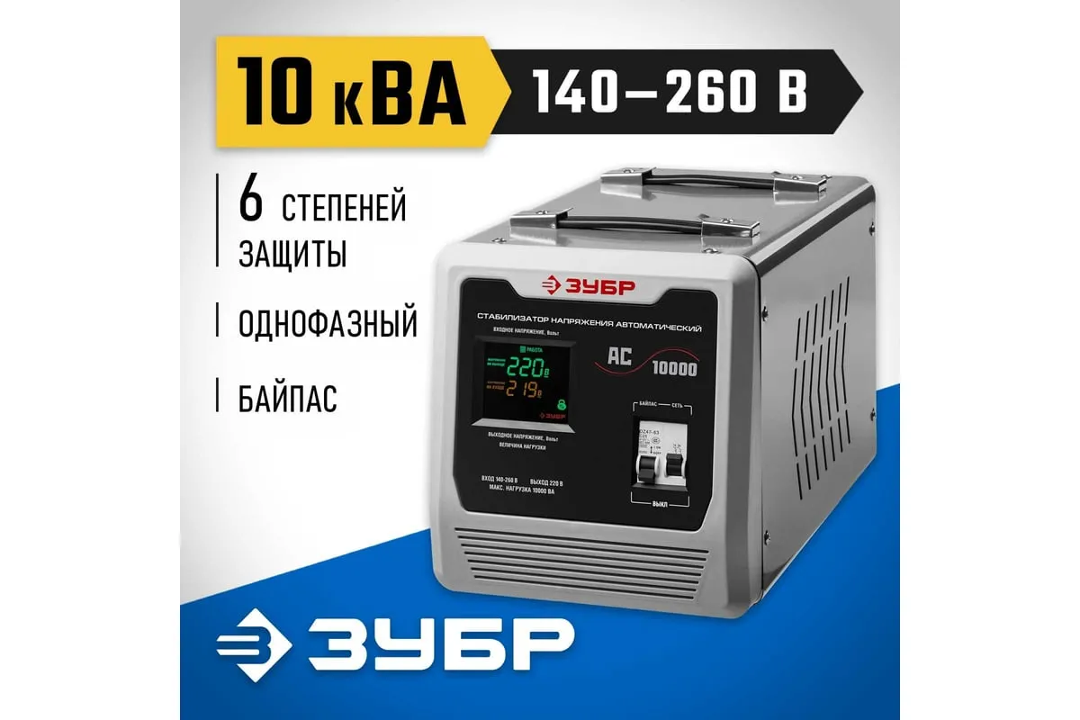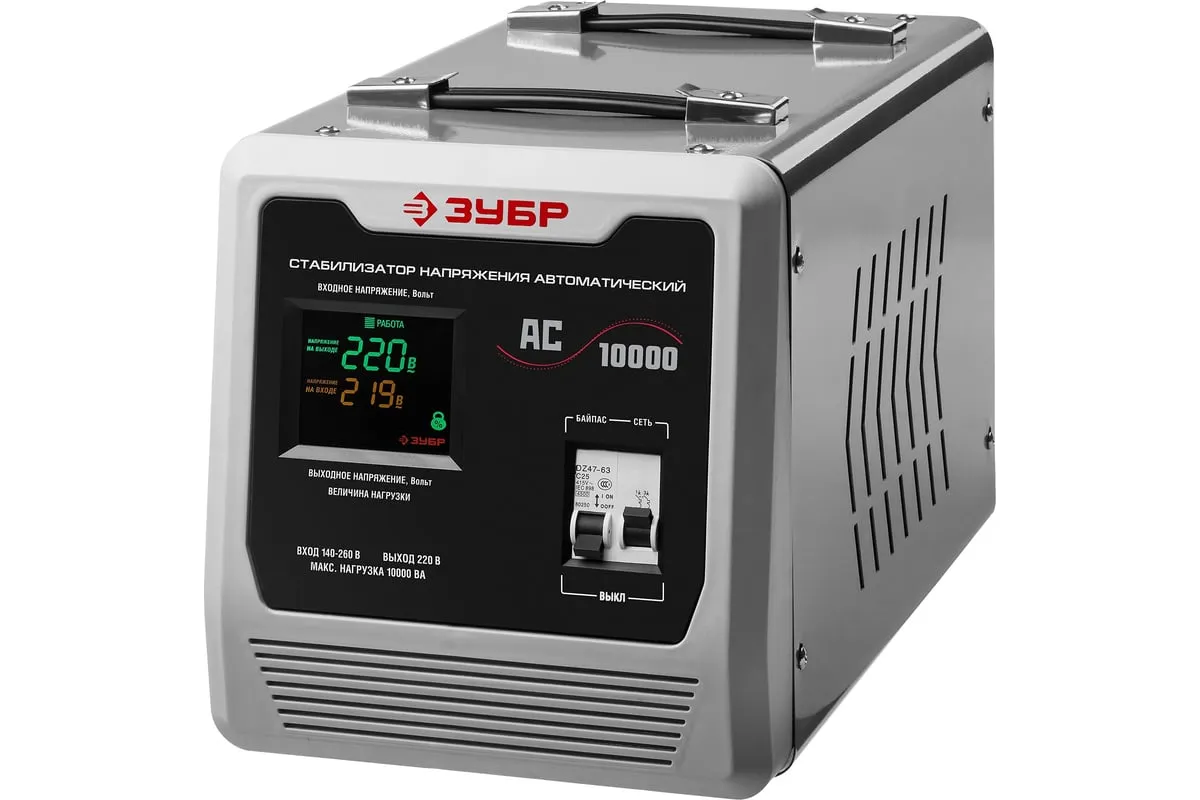 Автоматический стабилизатор с цифровой индикацией АСН-10000-1-Ц ПРОФ. Зубр 59380-10 используется для защиты торгового и промышленного оборудования, систем освещения, водоснабжения и разного рода бытовых приборов от перепадов напряжения и перегрузки в сети. Релейный тип стабилизаторов отличаетсябыстрой реакциейи хорошо подходит длячастых скачковнапряжения. Для наглядной работы устройства данная модель оборудованацифровым дисплеем.