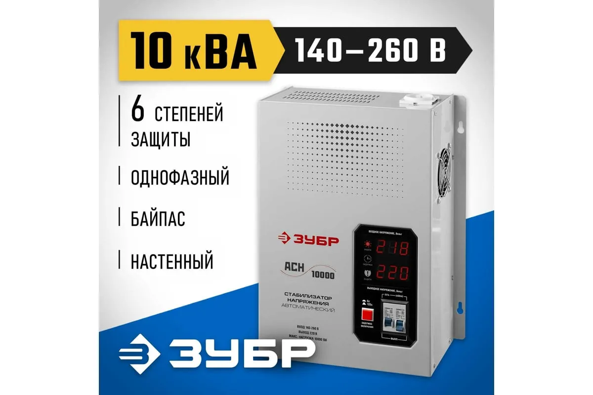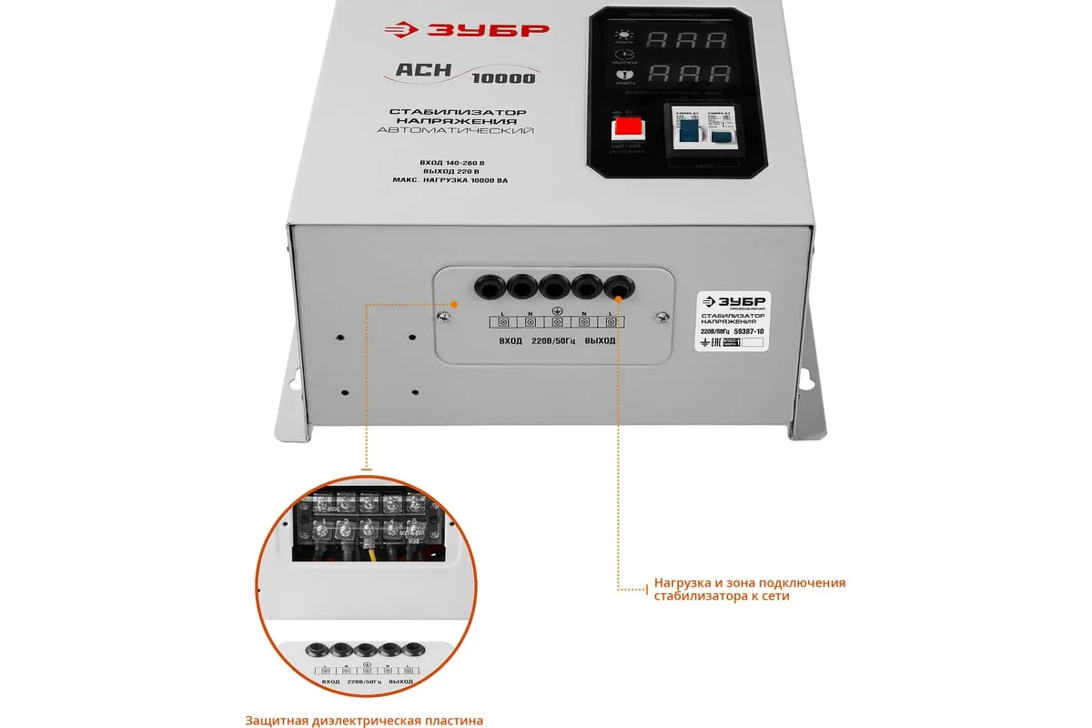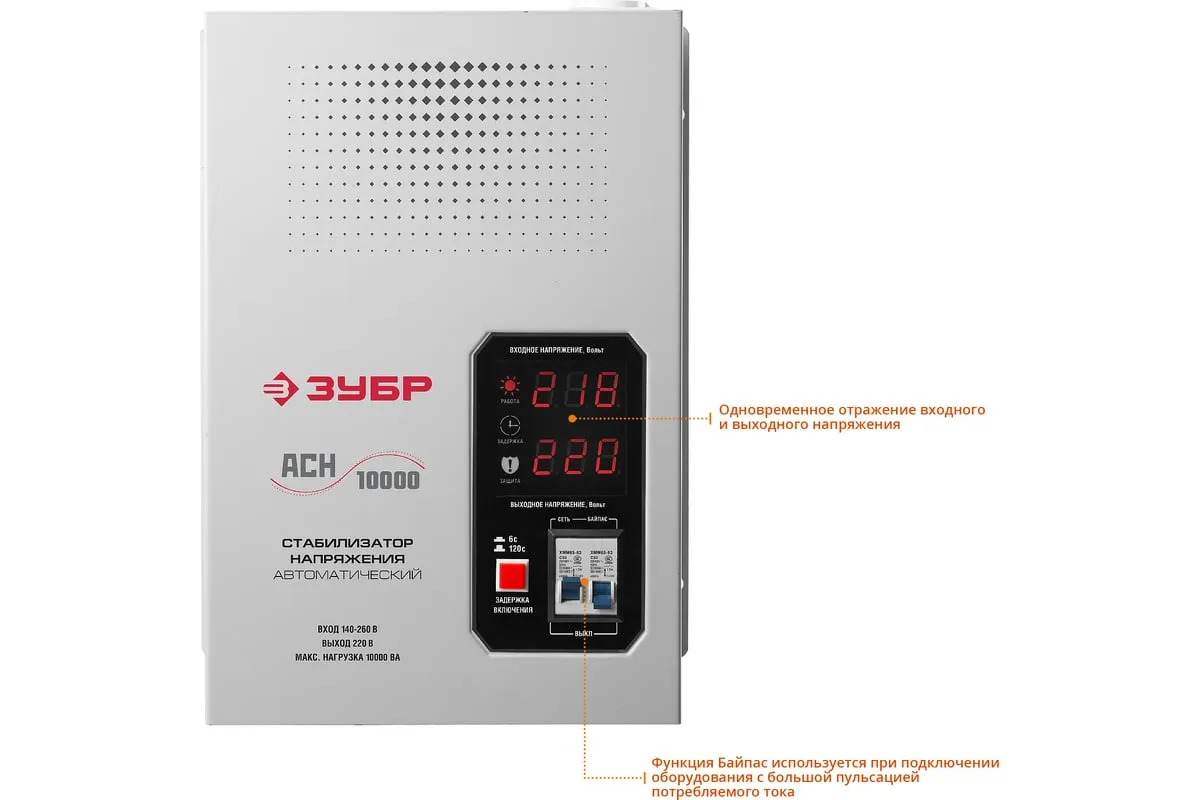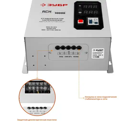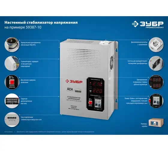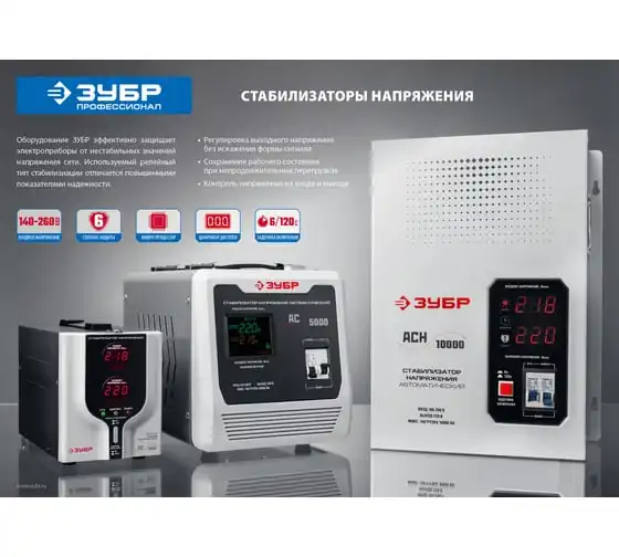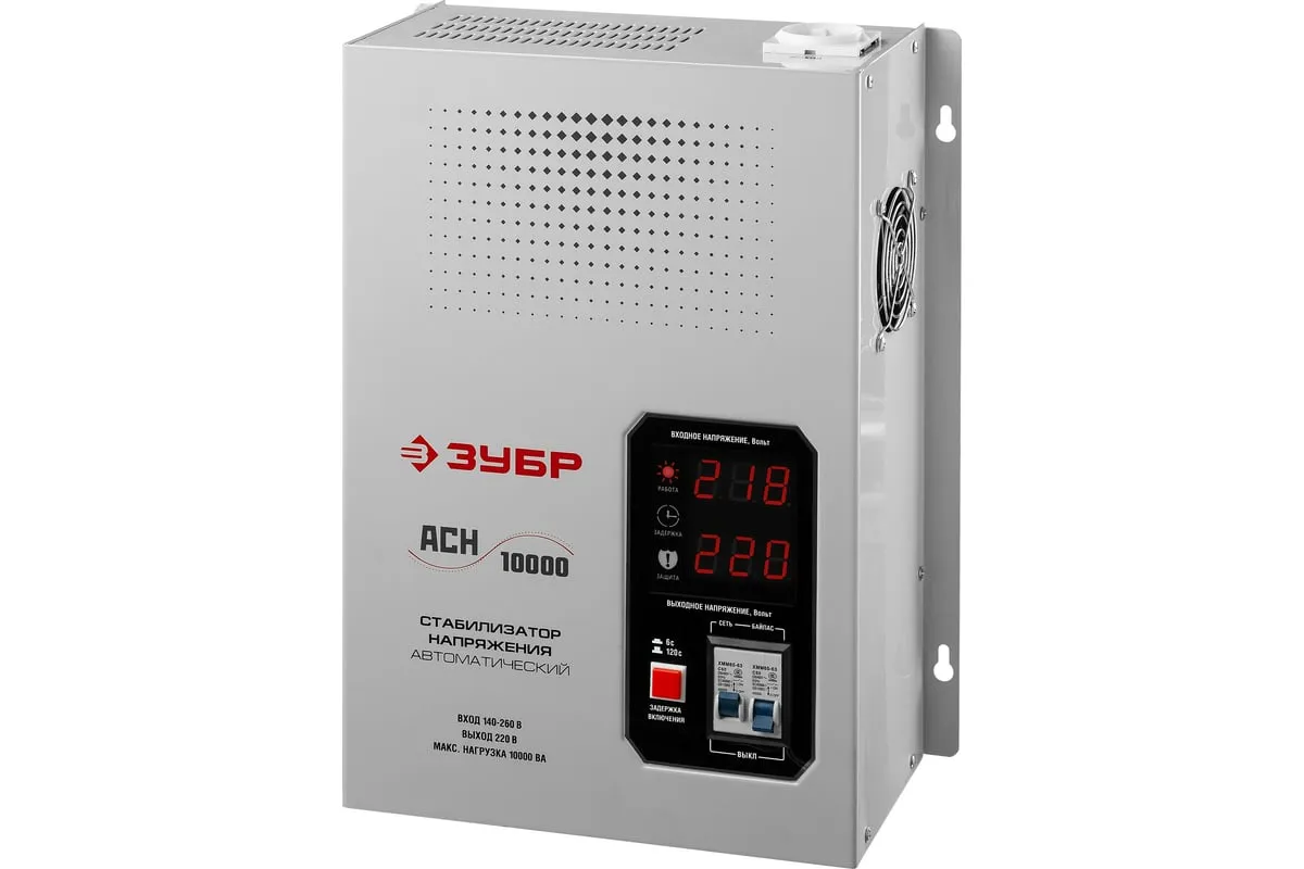 Автоматический стабилизатор с цифровой индикацией Зубр Профессионал АСН-10000-1-ЦН 59387-10 применяется для быстрого и эффективного выравнивания сетевого напряжения для защиты оборудования и бытовых приборов. Аппарат относится к релейному типу и является надежным в эксплуатации. Есть светодиодная индикация и цифровой дисплей