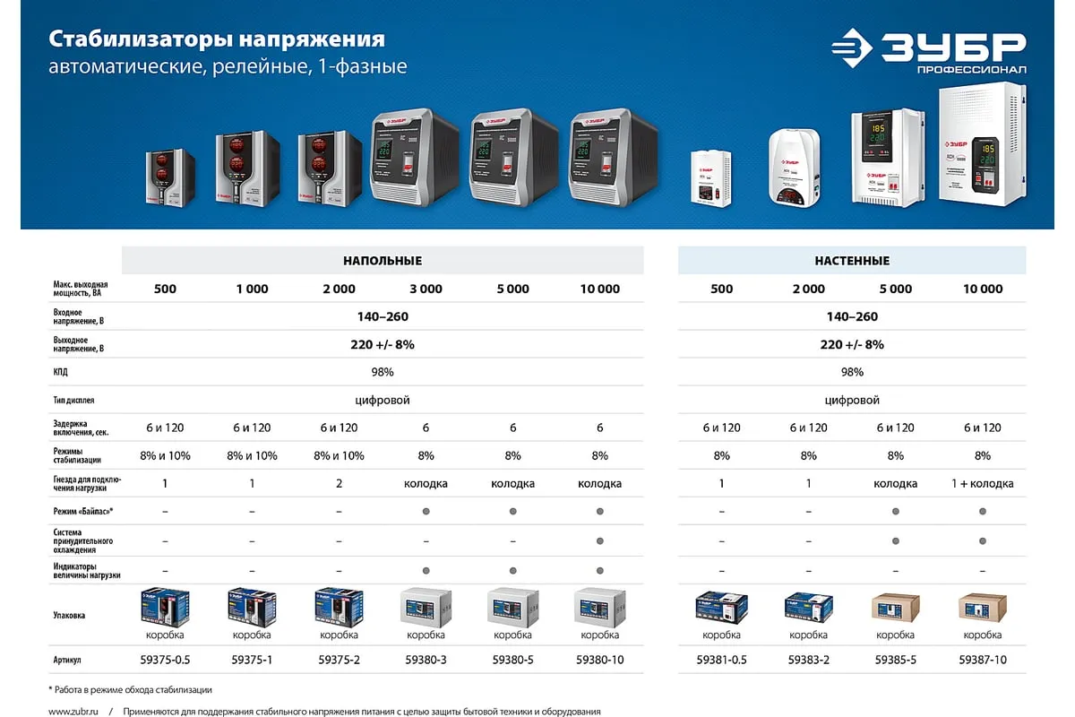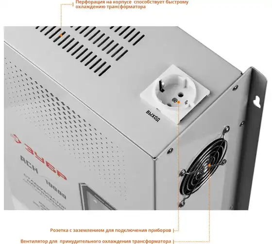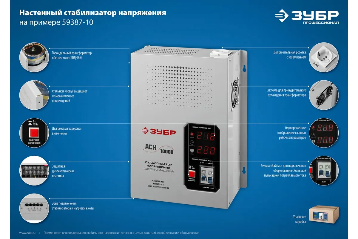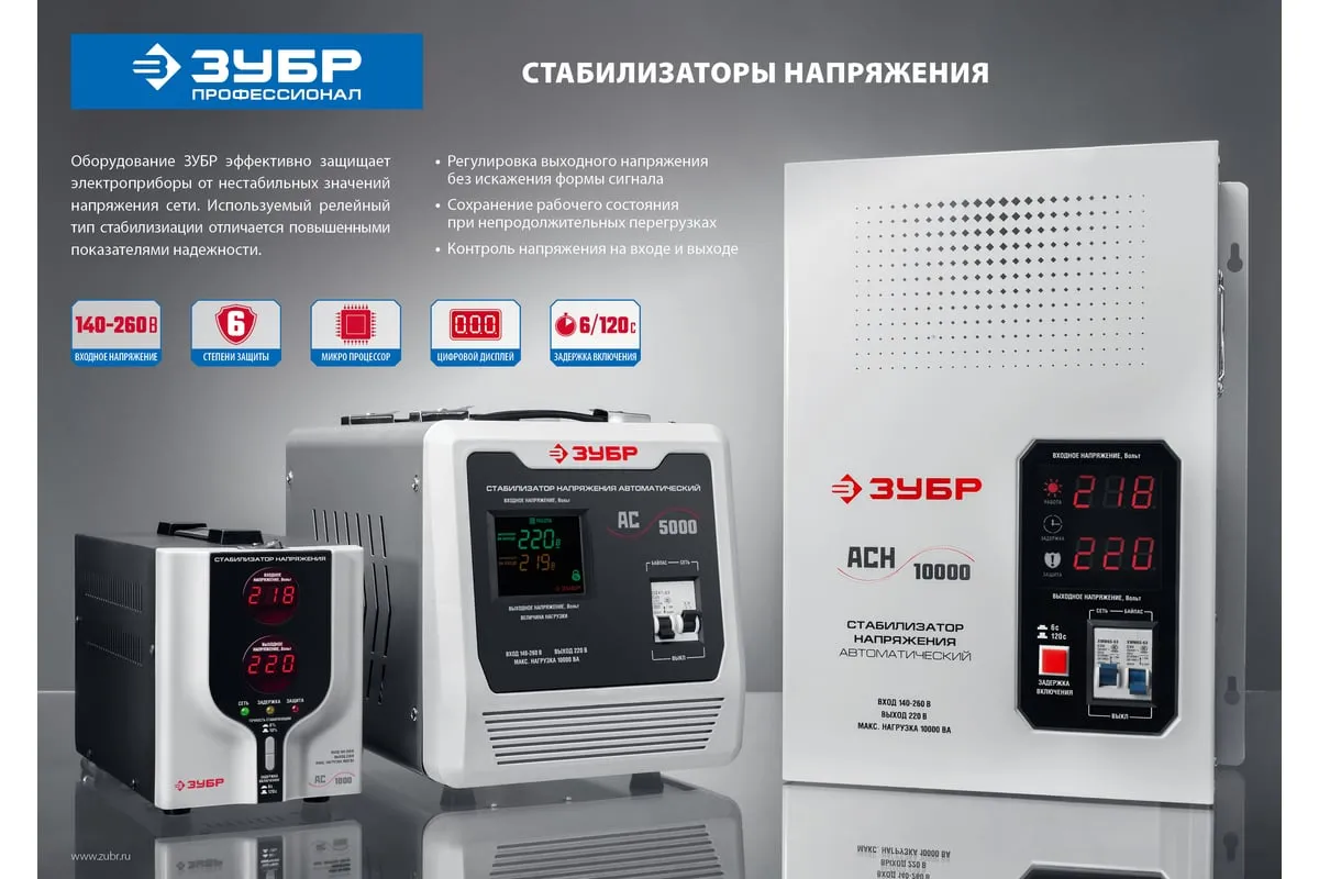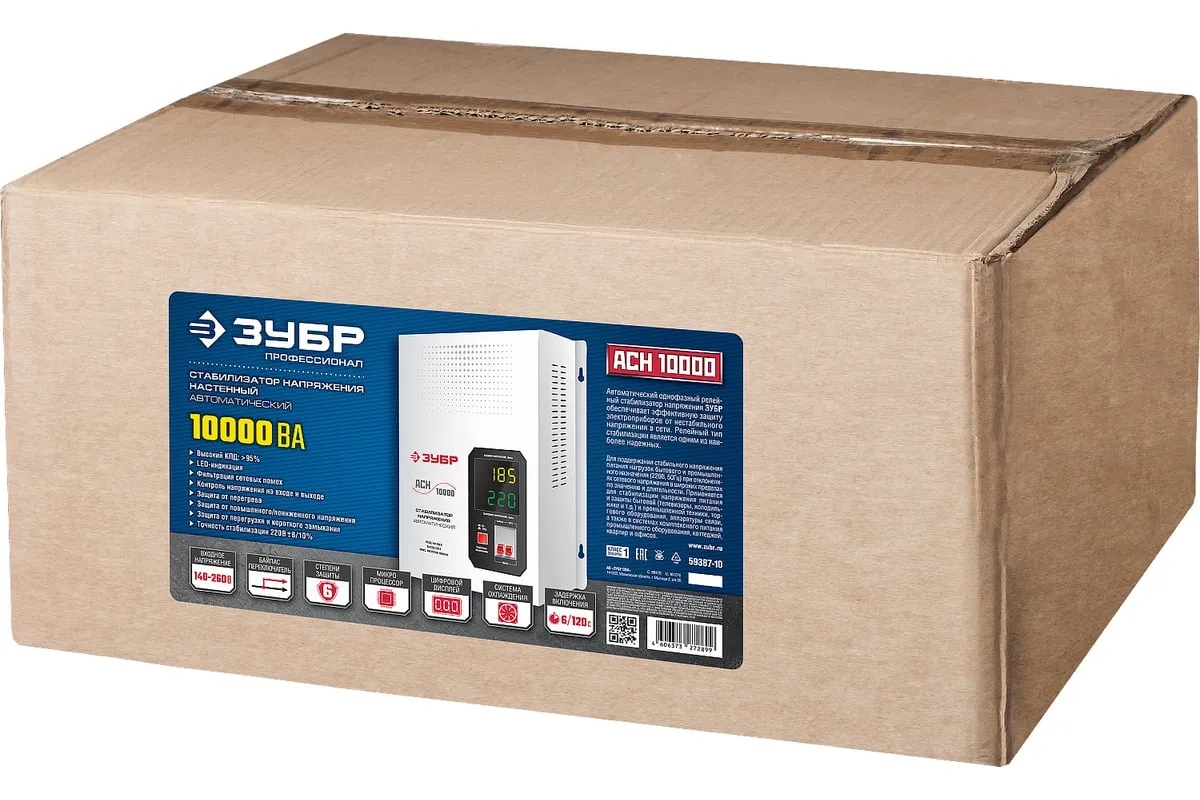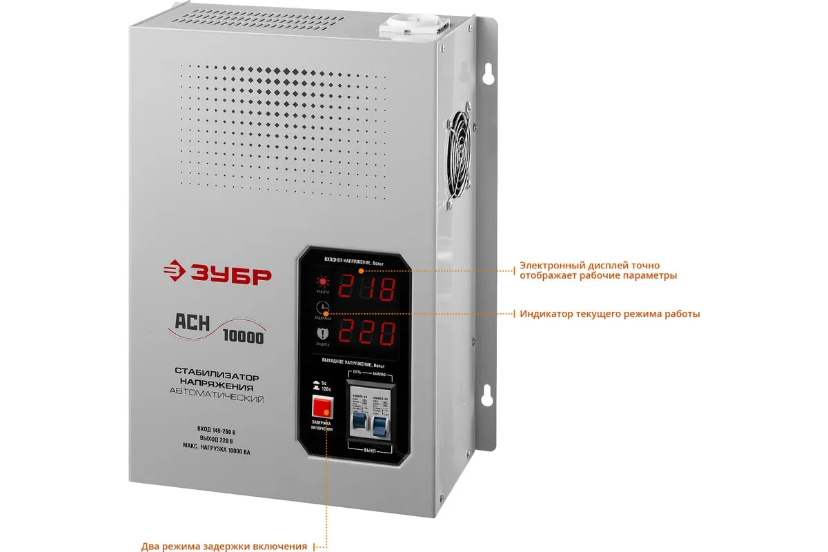 Автоматический стабилизатор с цифровой индикацией Зубр Профессионал АСН-10000-1-ЦН 59387-10 применяется для быстрого и эффективного выравнивания сетевого напряжения для защиты оборудования и бытовых приборов. Аппарат относится к релейному типу и является надежным в эксплуатации. Есть светодиодная индикация и цифровой дисплей