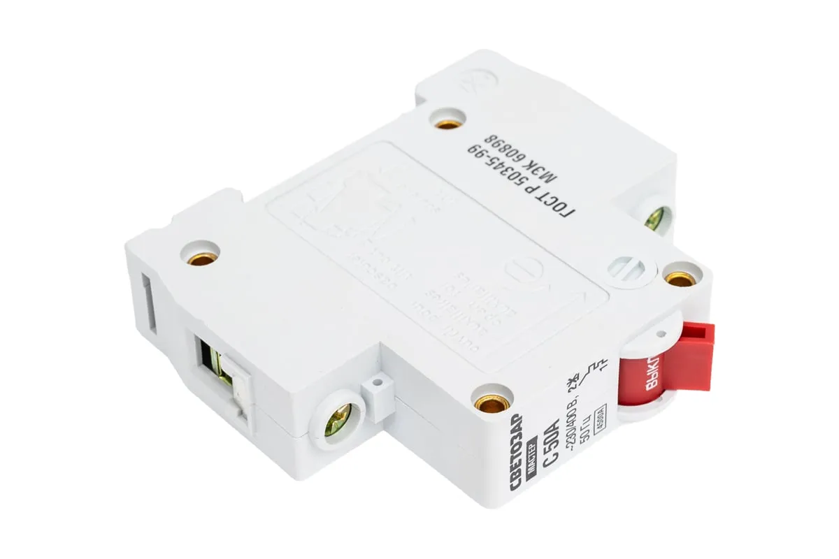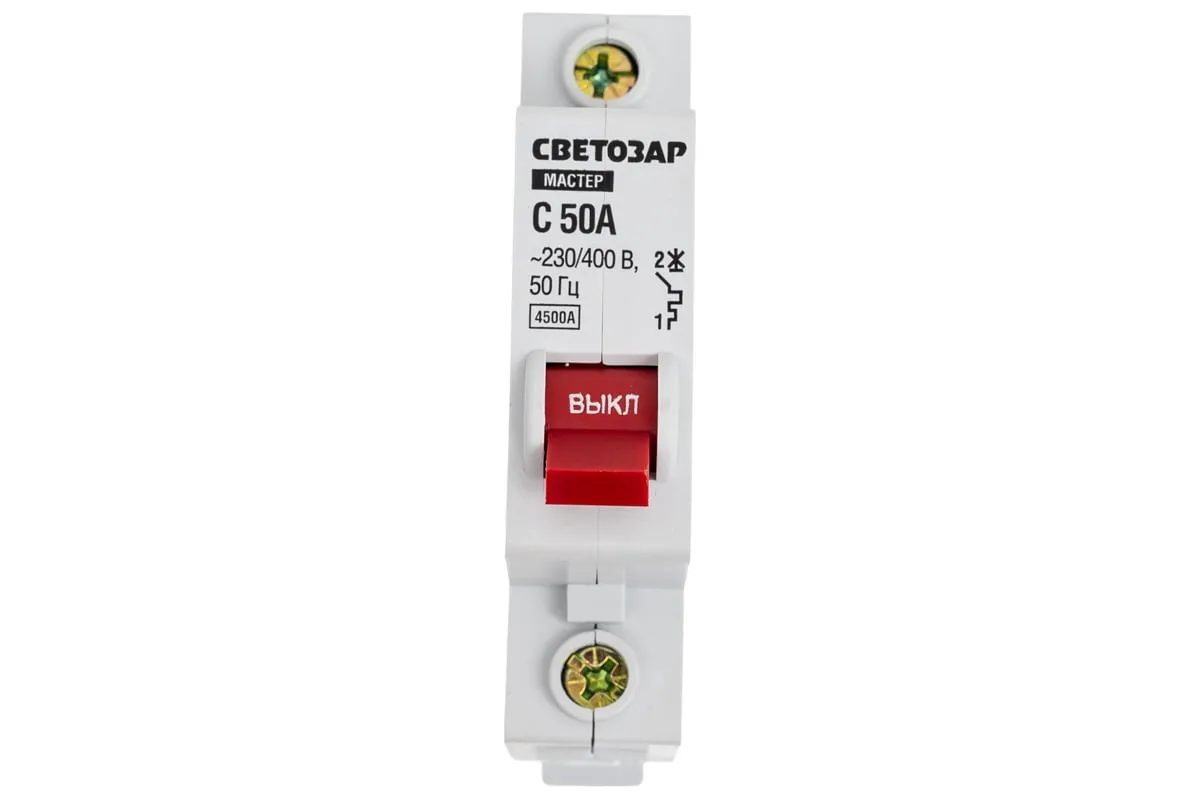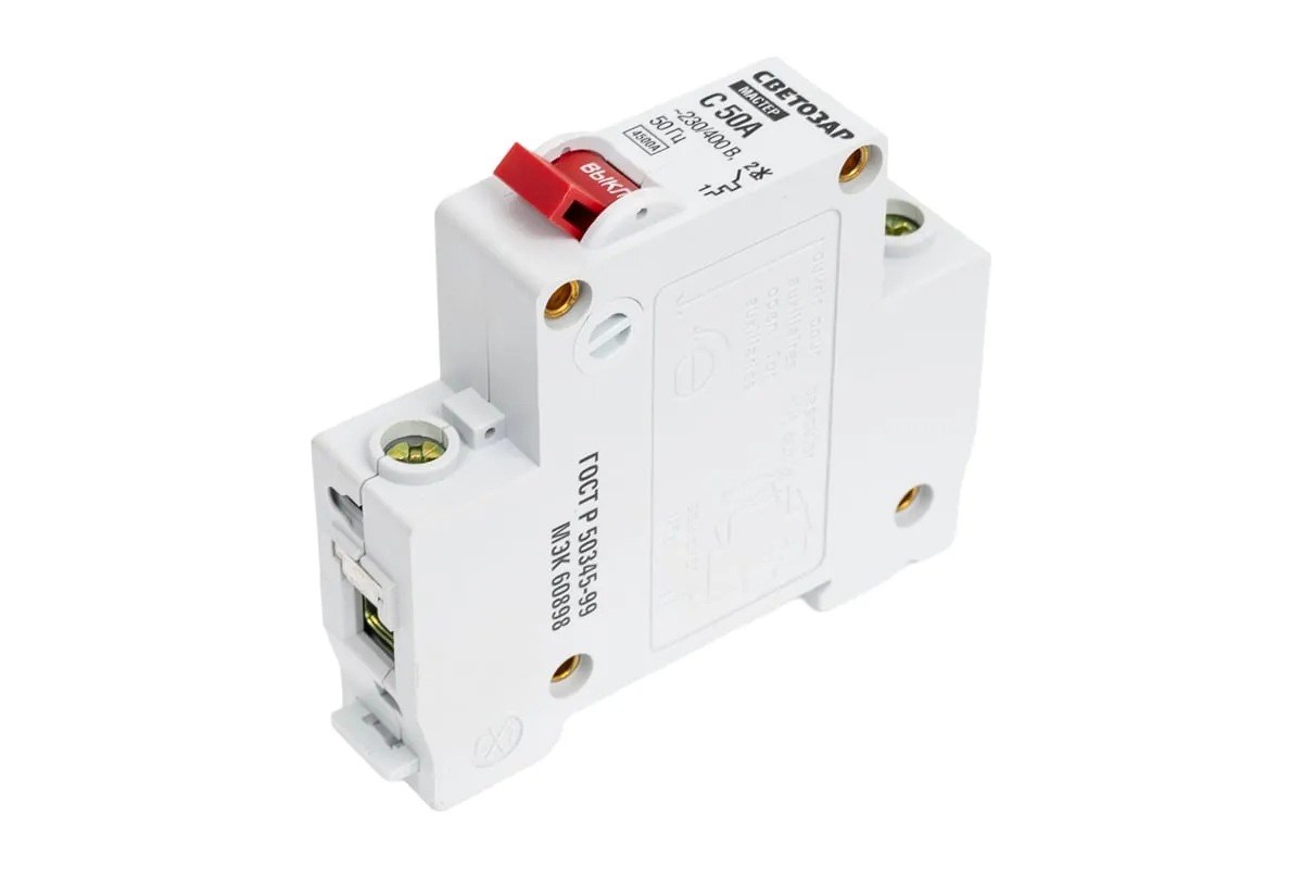 Автоматический выключатель СВЕТОЗАР, 1-полюсный, тип расцепления С, 50 A, 230 / 400 В 49060-50-C обеспечивает надежную защиту электрического оборудования. В случае 5-10 кратном повышении номинальной силы тока выключатель срабатывает, что предотвращает поломку бытовых электрических приборов. Выключатель выполнен из термостойкого пластика, что исключат возможно возгорания.