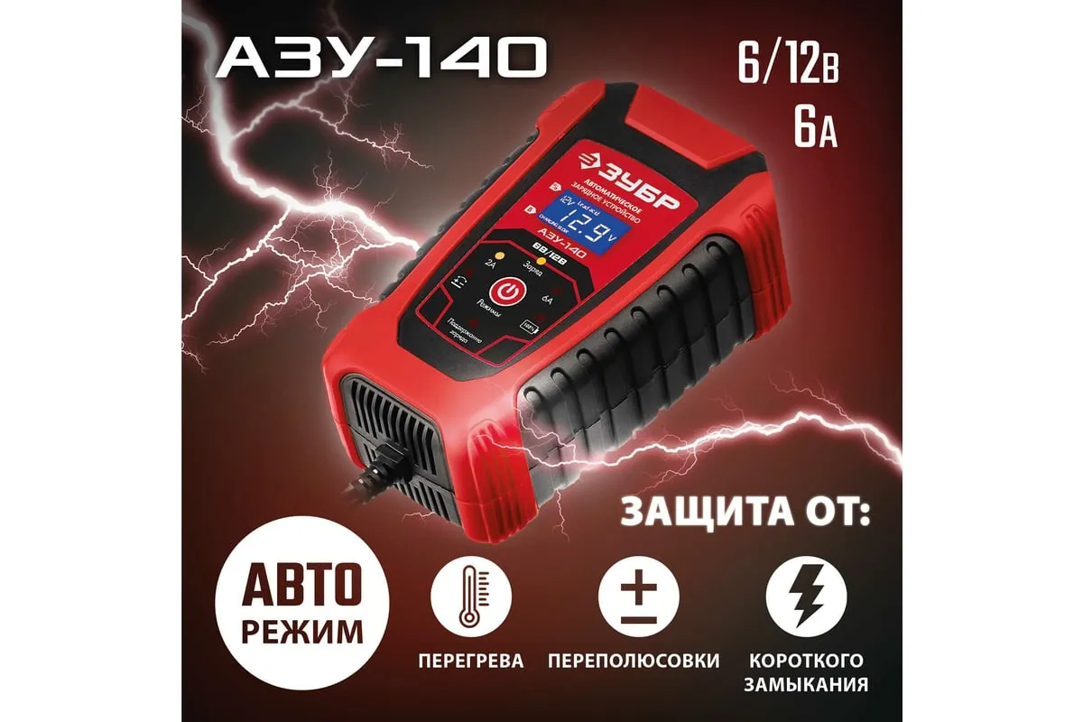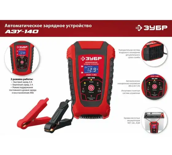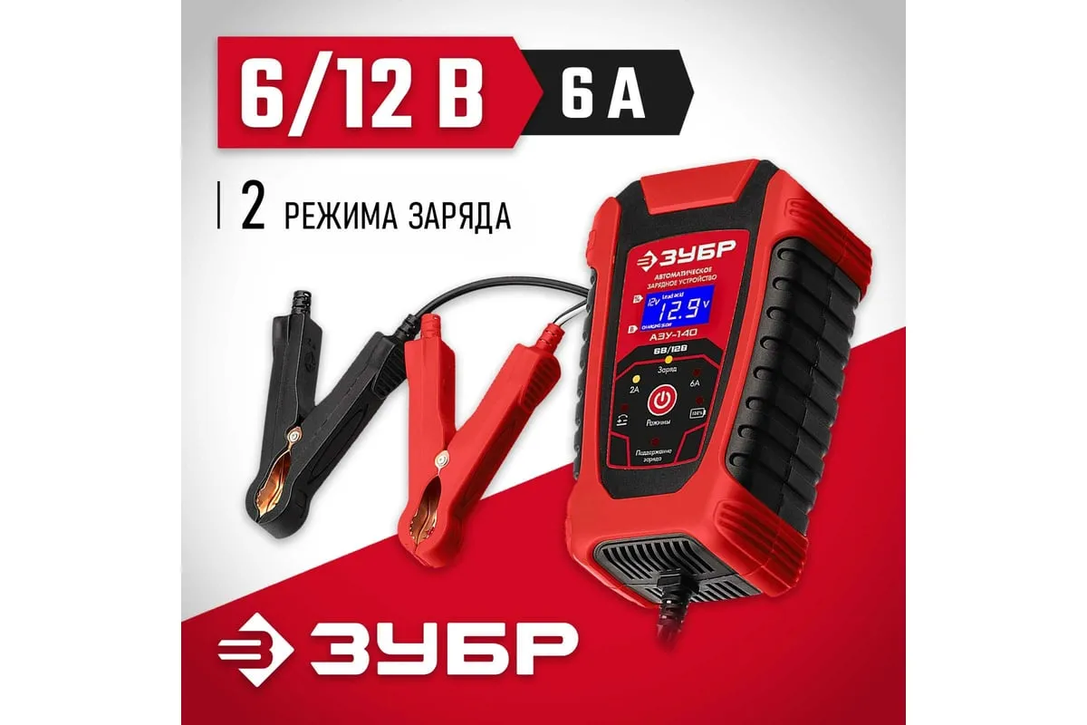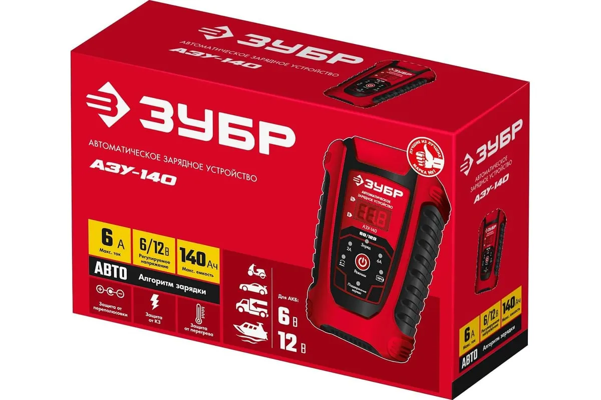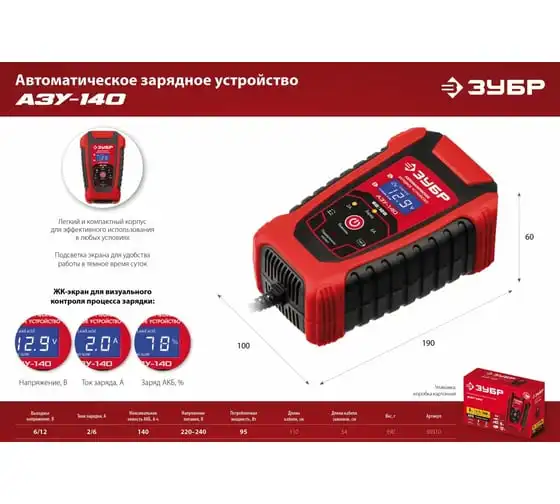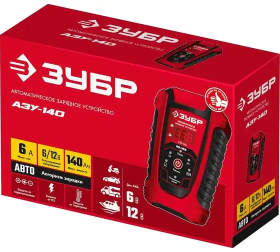 Автоматическое зарядное устройство ЗУБР АЗУ-140 6/12 В, 6А 59310 предназначено для зарядки аккумуляторных батарей легковых и грузовых автомобилей, мотоциклов, снегоходов, катеров (лодок), газонокосилок, тракторов, гидроциклов и т.д. Устройство управляется с помощью микропроцессора, обладает высокой эффективностью и имеет защиту от ошибок, которые может допустить пользователь. Оборудование ЗУБР создано на основе современных материалов и передовых технологий. Высокие стандарты качества и профессиональный подход, обеспечивают надежность и удобство использования изделия на протяжении всего срока службы.