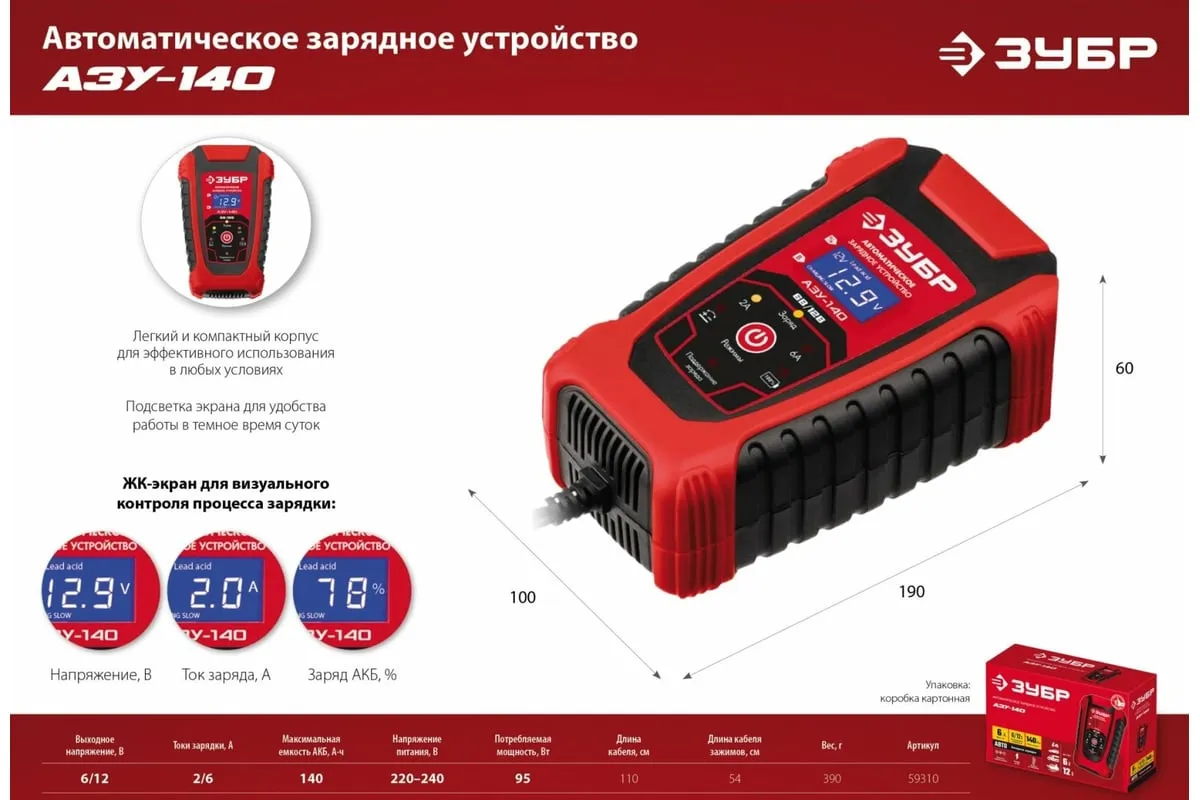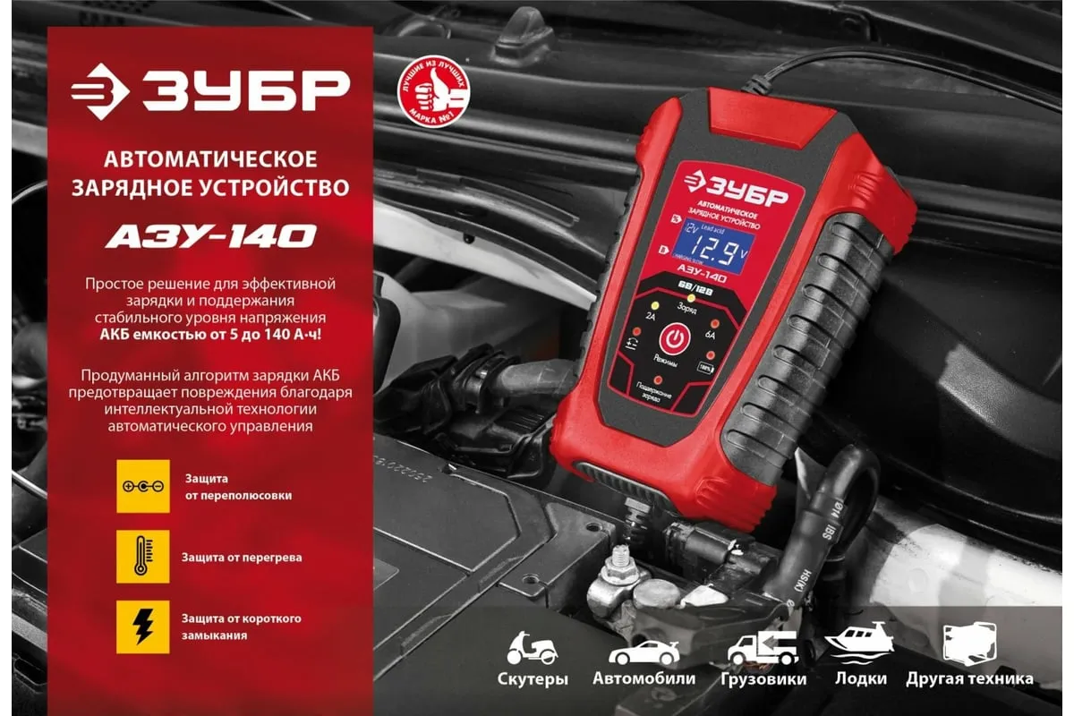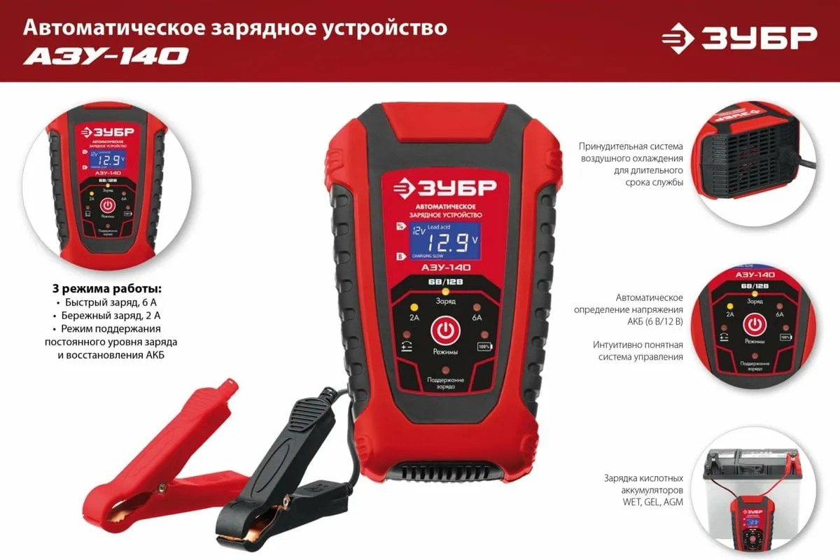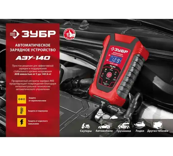 Автоматическое зарядное устройство ЗУБР АЗУ-140 6/12 В, 6А 59310 предназначено для зарядки аккумуляторных батарей легковых и грузовых автомобилей, мотоциклов, снегоходов, катеров (лодок), газонокосилок, тракторов, гидроциклов и т.д. Устройство управляется с помощью микропроцессора, обладает высокой эффективностью и имеет защиту от ошибок, которые может допустить пользователь. Оборудование ЗУБР создано на основе современных материалов и передовых технологий. Высокие стандарты качества и профессиональный подход, обеспечивают надежность и удобство использования изделия на протяжении всего срока службы.