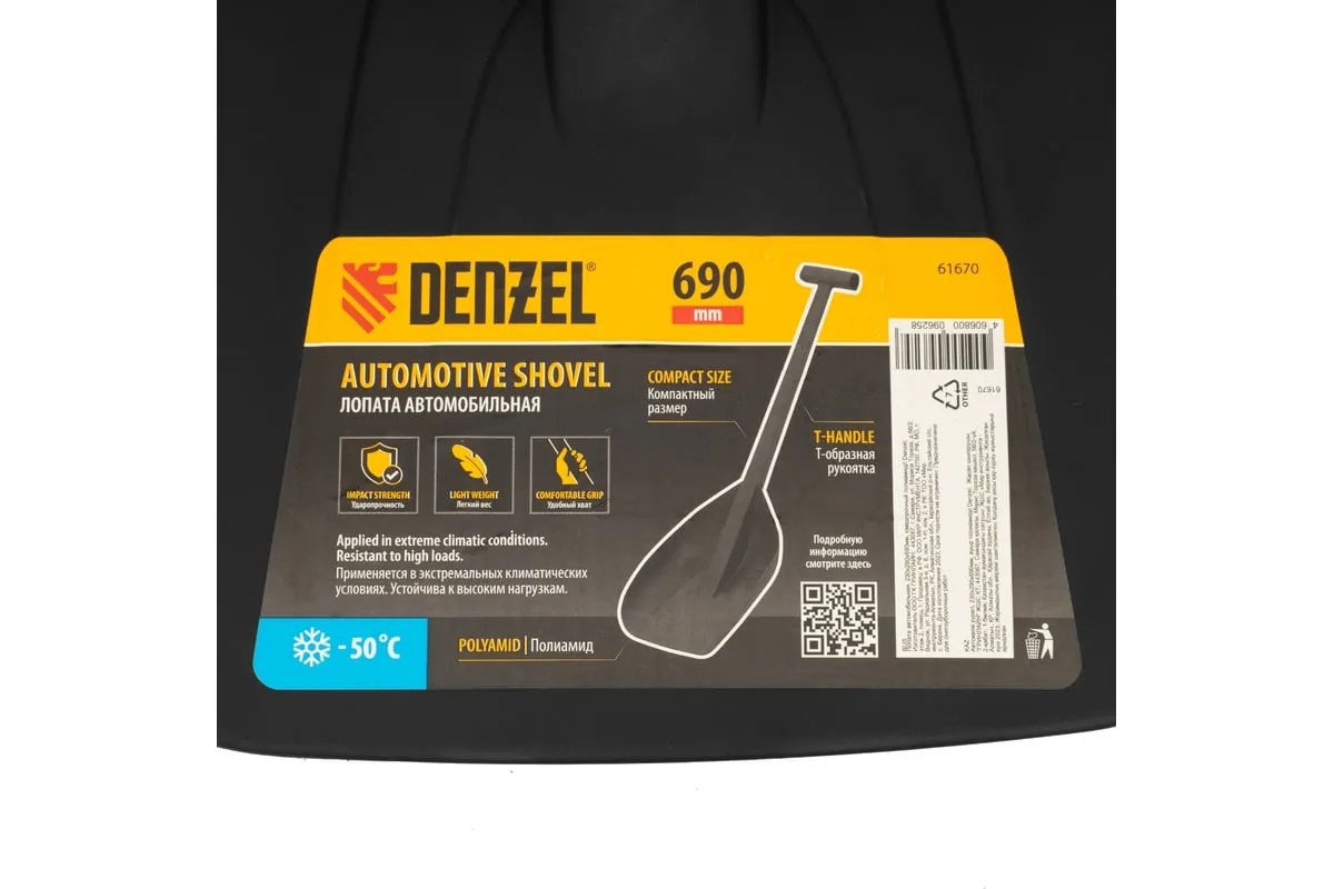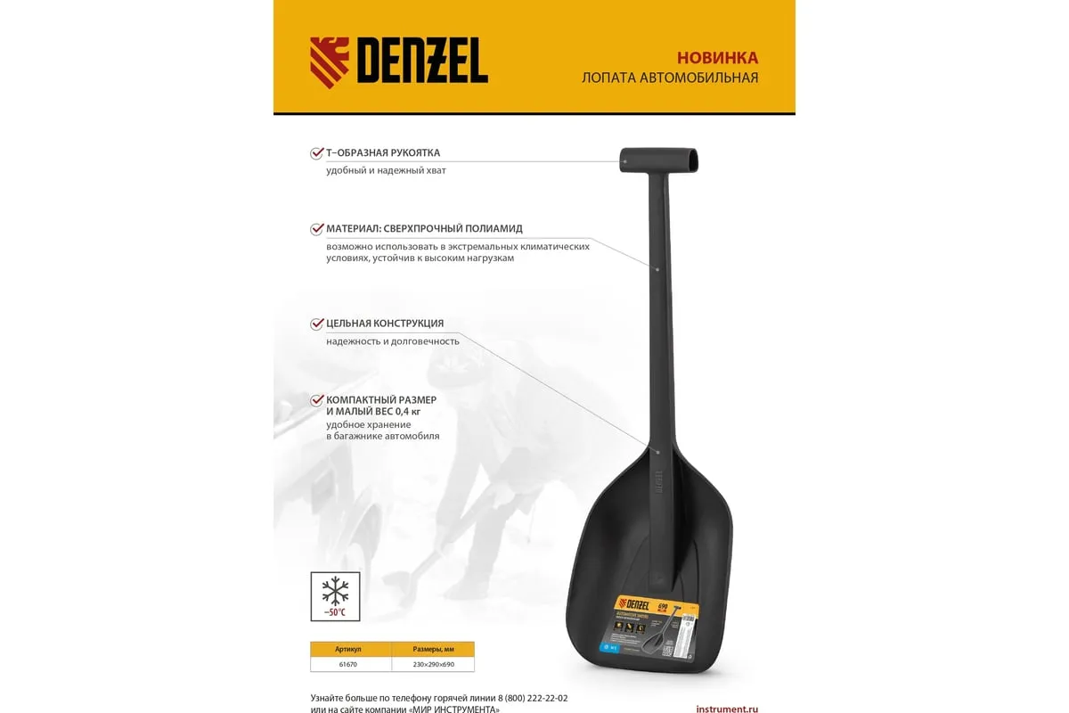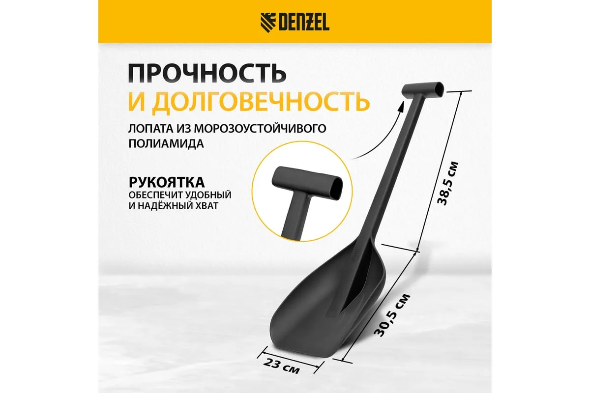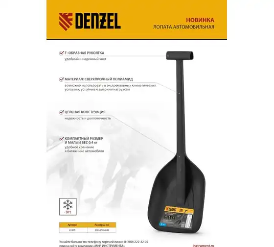 Автомобильная лопата Denzel 61670 размером 230 х 290 х 690 мм изготовлена из сверхпрочного полиамида и применяется в экстремальных климатических условиях. Поможет освободить машину, попавшую в снежный или песчаный занос. Лопата выдерживает температуру от -50 до +50 °C и устойчива к высоким нагрузкам.