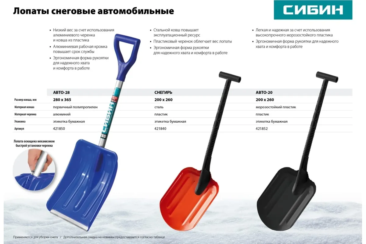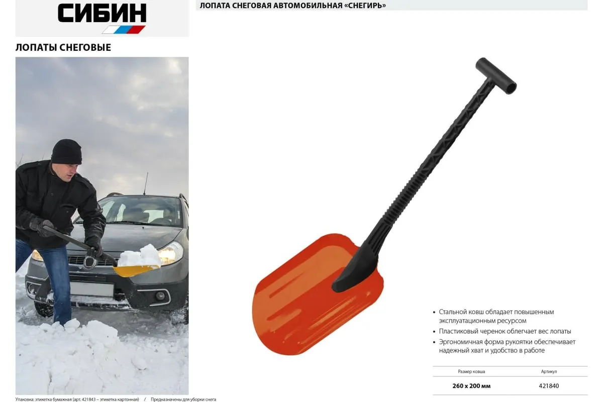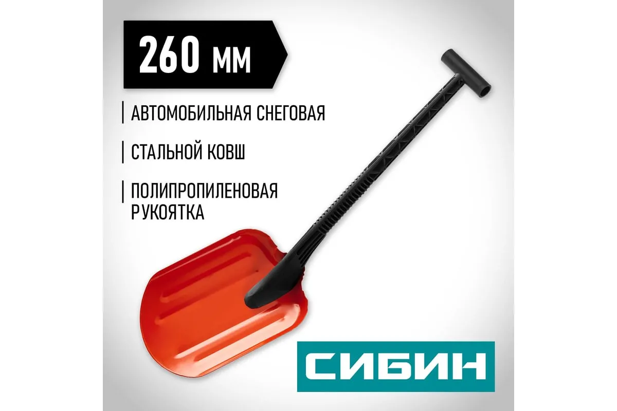 Автомобильная снеговая лопата СИБИН Снегирь сталь, пластиковая рукоятка, 260 мм 421840 подойдет для быстрого удаления плотного снега возле машины. Металл окрашен и устойчив к воздействию зимних химикатов и влаги.