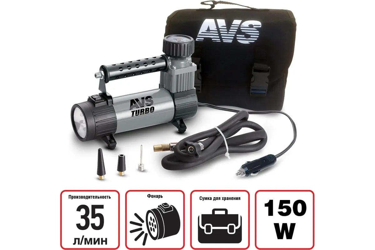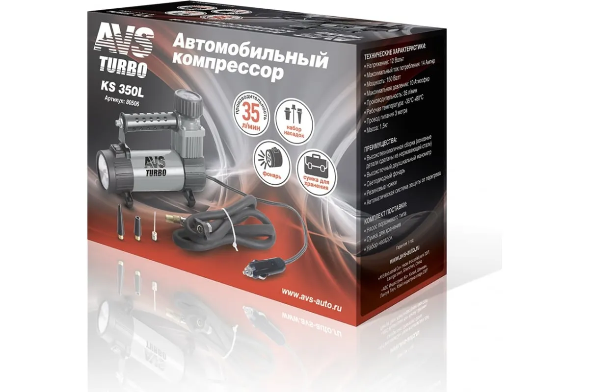 Автомобильный компрессор AVS KS350L 80506 незаменим в дороге и в загородных поездках. Используется для накачки надувных изделий.