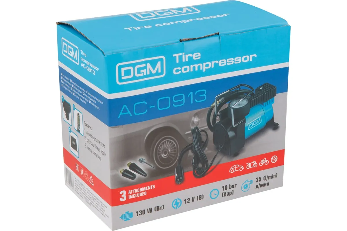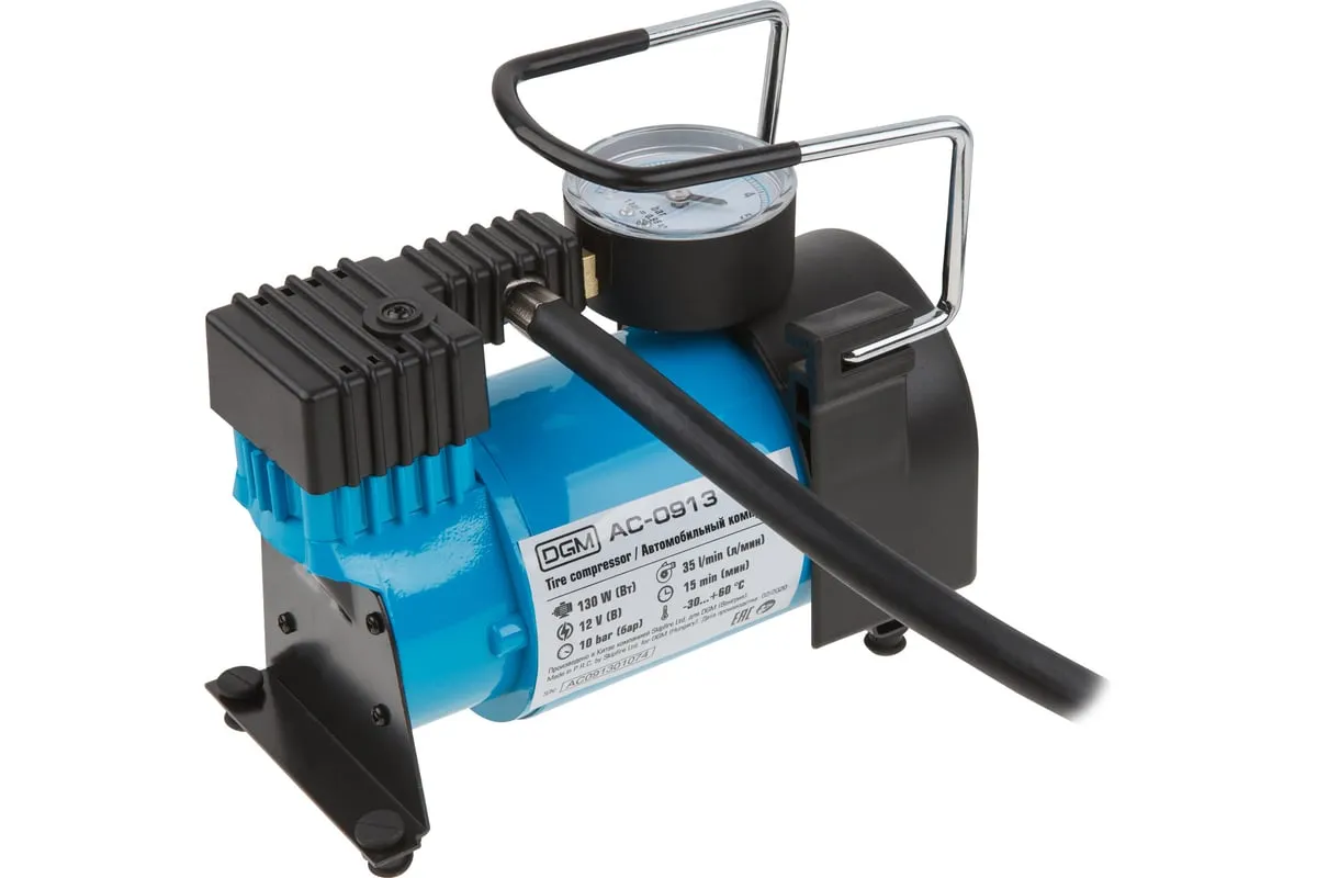 Автомобильный компрессор DGM AC-0913 имеет 100% медную обмотку двигателя. Подшипники высокого класса точности. Резиновые амортизаторы для низкого уровня шума и вибрации. Накручивающийся ниппель. Рабочая температура От +30 до -15