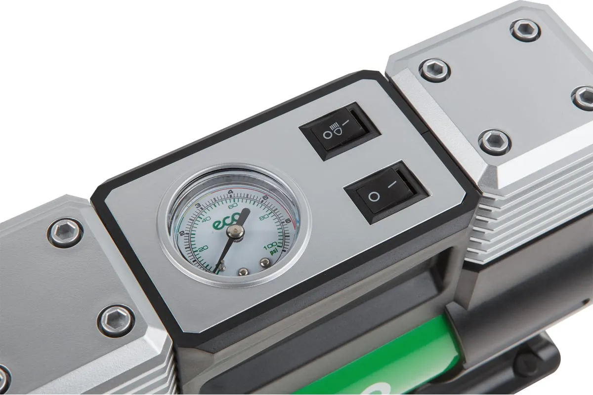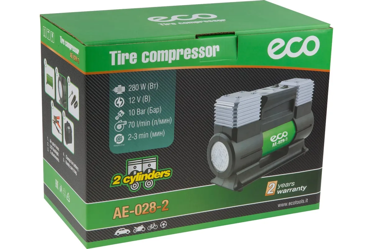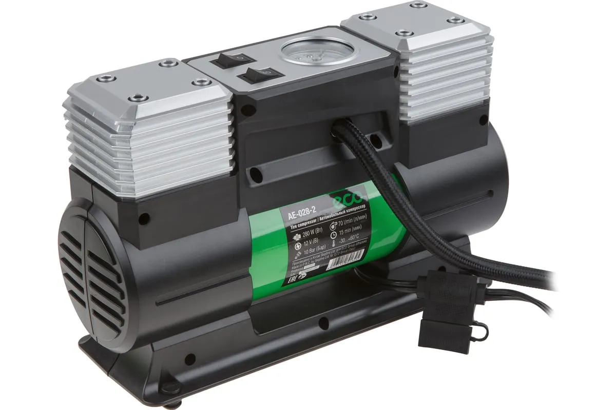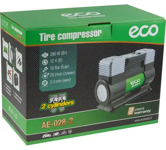 Автомобильный компрессор ECO AE-028-2 - двухцилиндровый производительный насос. Мощный двигатель со 100% медной обмоткой и большим статором обеспечивает гарантированно высокий ресурс устройства и быстроту работы.