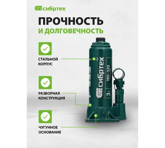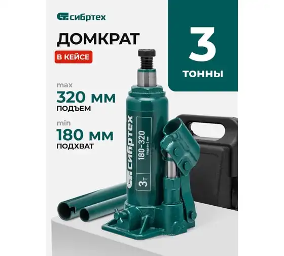 Домкрат гидравлический бутылочный СИБРТЕХ 3 т, 180-320 мм, кейс 50813