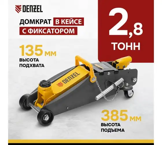 Гидравлический подкатной домкрат Denzel с фиксатором, 2,8 т, 135-385 мм, в кейсе 51156