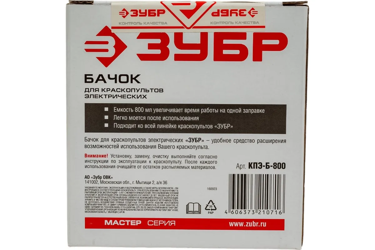 Бачок "МАСТЕР" Зубр КПЭ-Б-800 применяется совместно с электрическими краскопультами Зубр моделей КПЭ-100, ЗКПЭ-120, КПЭ-350, КПЭ-500, КПЭ-650, КПЭ-750. Способствует увеличению время работы краскопульта на одной заправке.