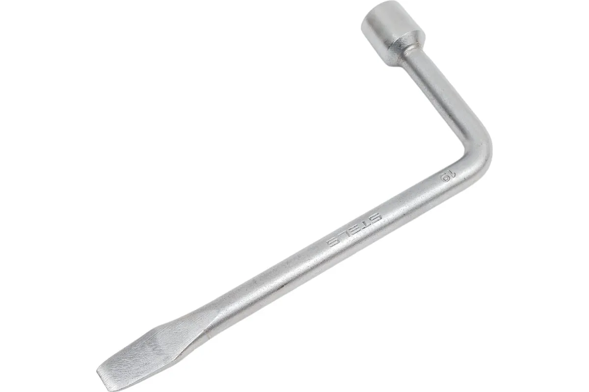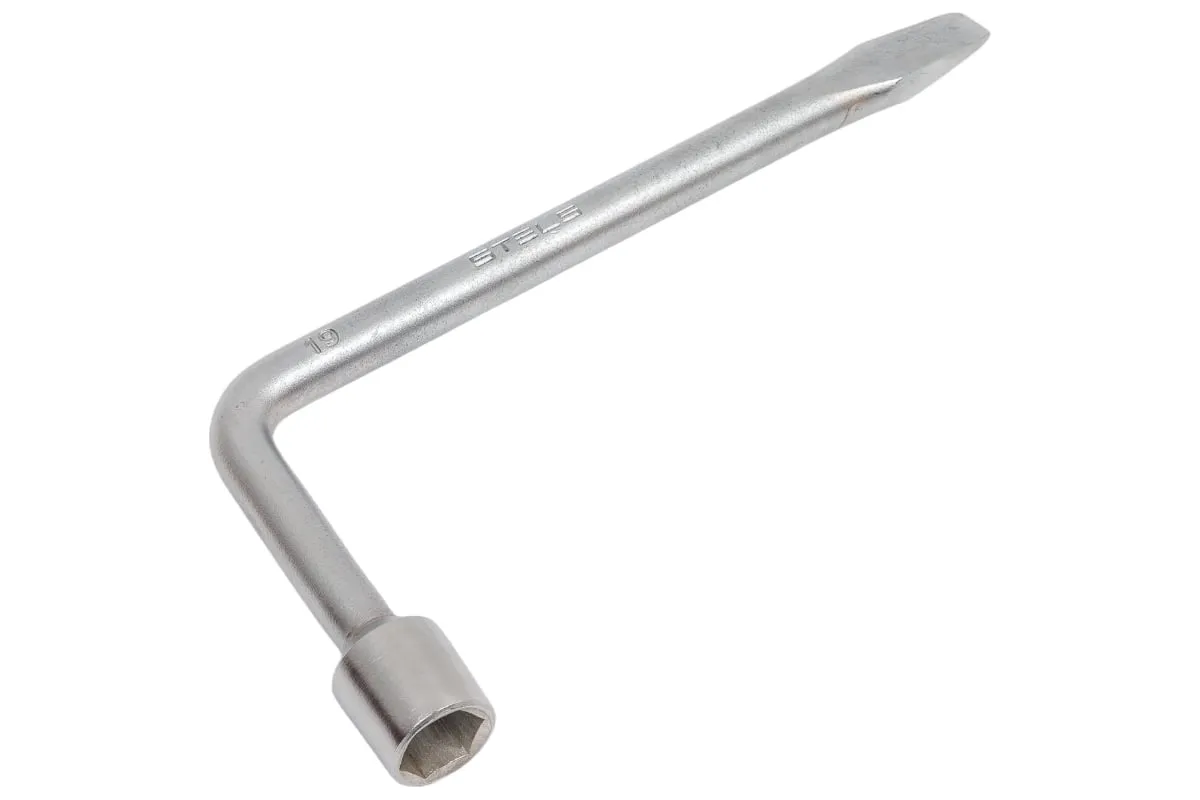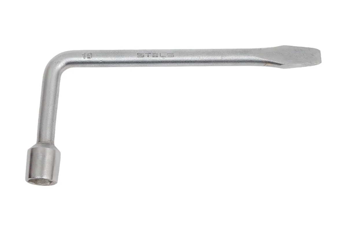 Баллонный ключ, 19 мм STELS 14224 — автомобильный инструмент для монтажа и демонтажа колес. Изделие изготовлено из высокопрочной углеродистой стали и способно выдерживать значительные нагрузки. Г-образная форма ключа увеличивает крутящий момент и делает работу пользователя более простой и удобной. Несъемная торцевая головка с шестигранным профилем расположена под углом к ручке ключа.