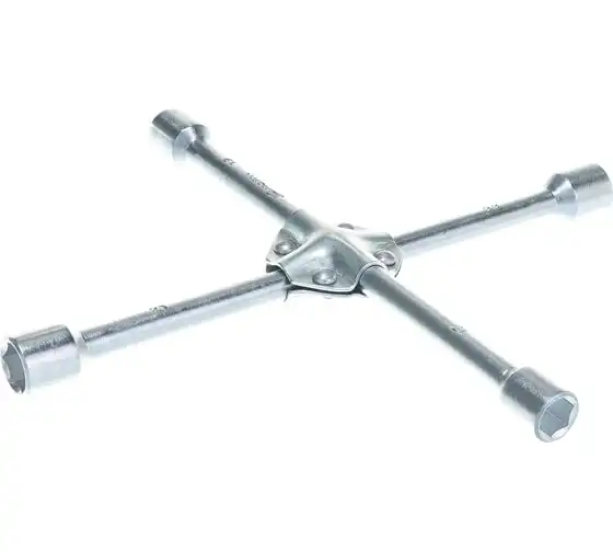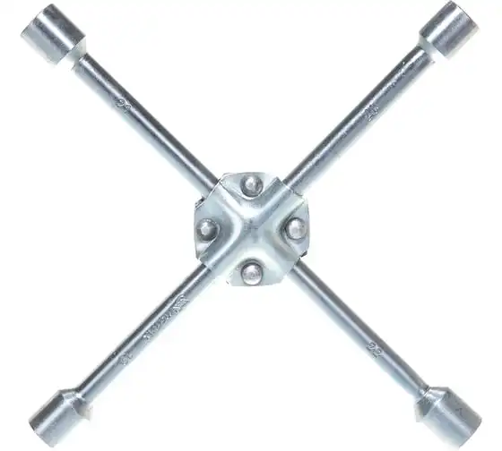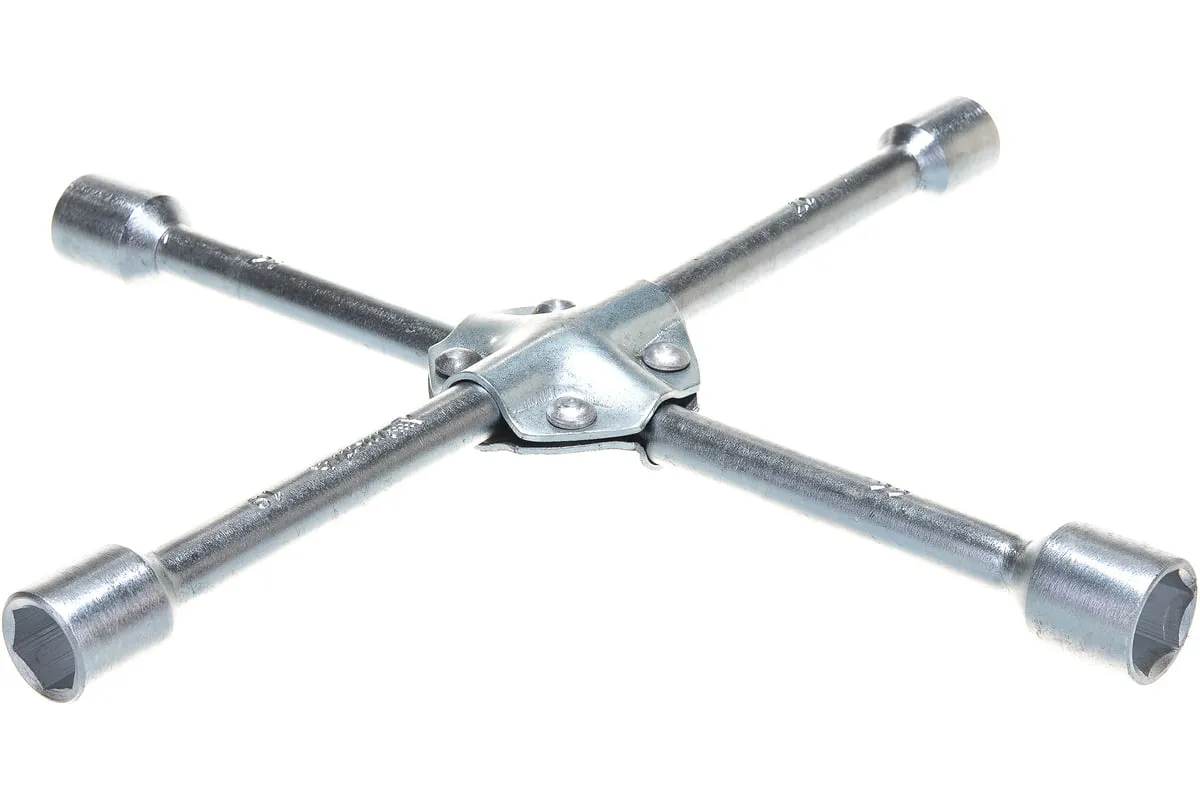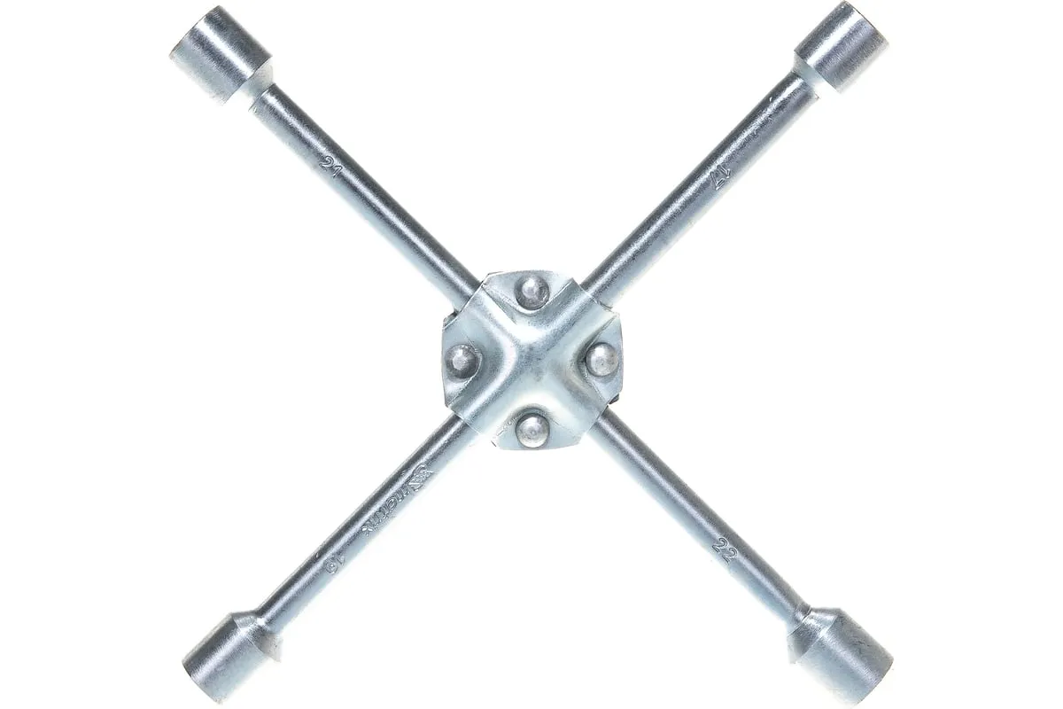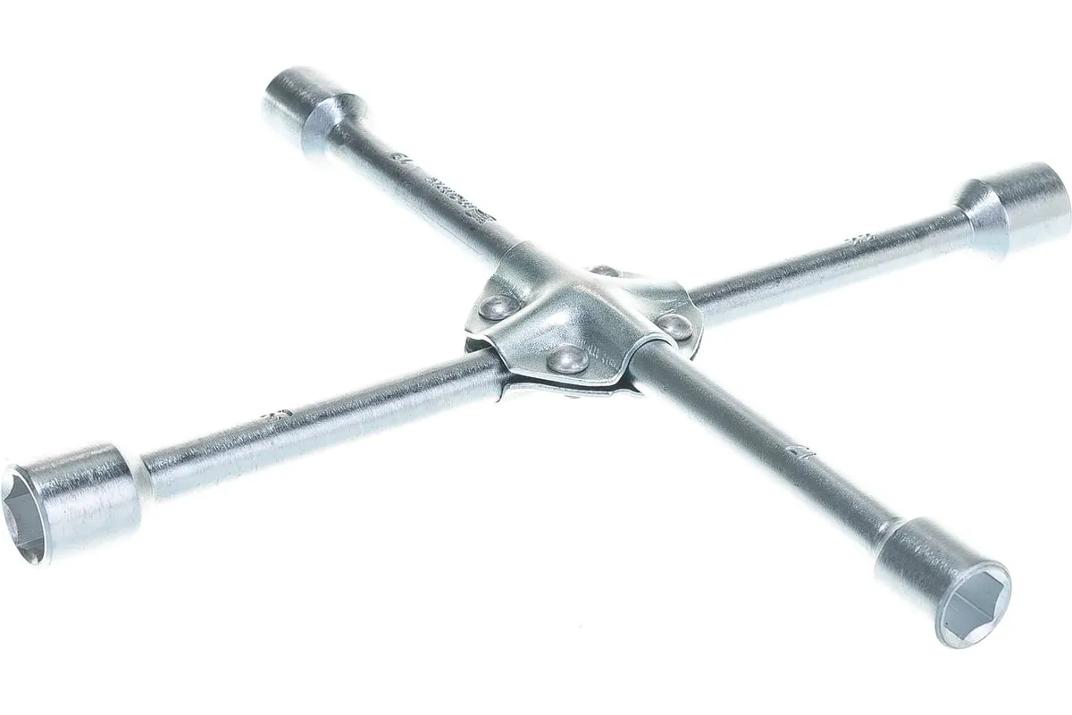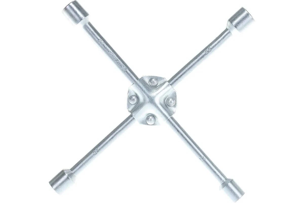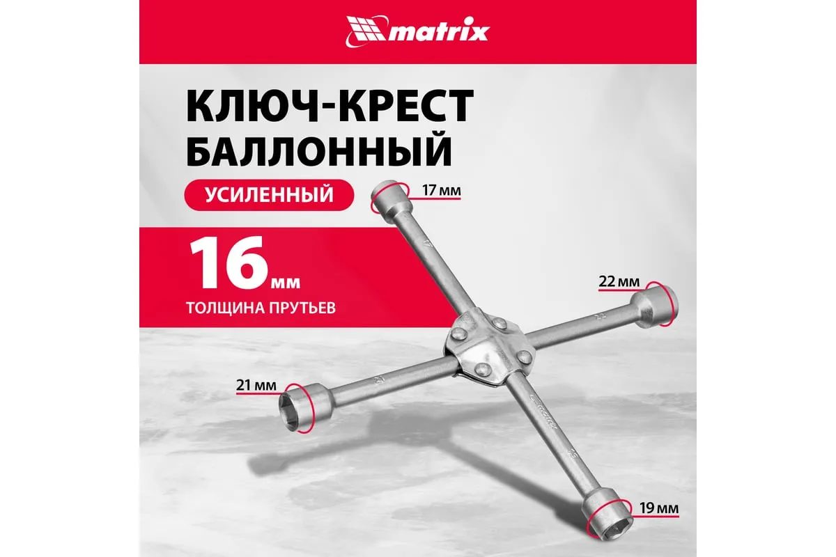 Баллонный ключ-крест MATRIX PROFESSIONAL, 14244, 17х19х21х22 мм представляет собой специализированный инструмент. Он необходим при замене колес автомобиля для вкручивания и выкручивания соединительных болтов. Ключ-крест изготавливается из углеродистой стали и имеет 4 несъемные торцевые головки с 6-гранным зевом. Ключ имеет утолщенный диаметр прута.