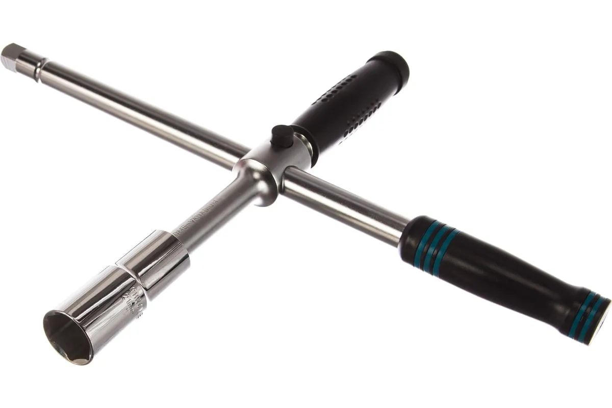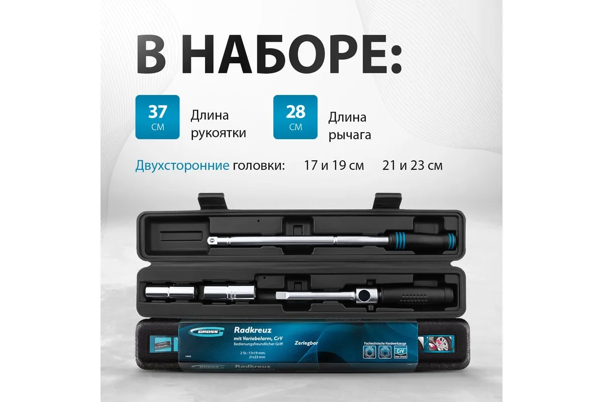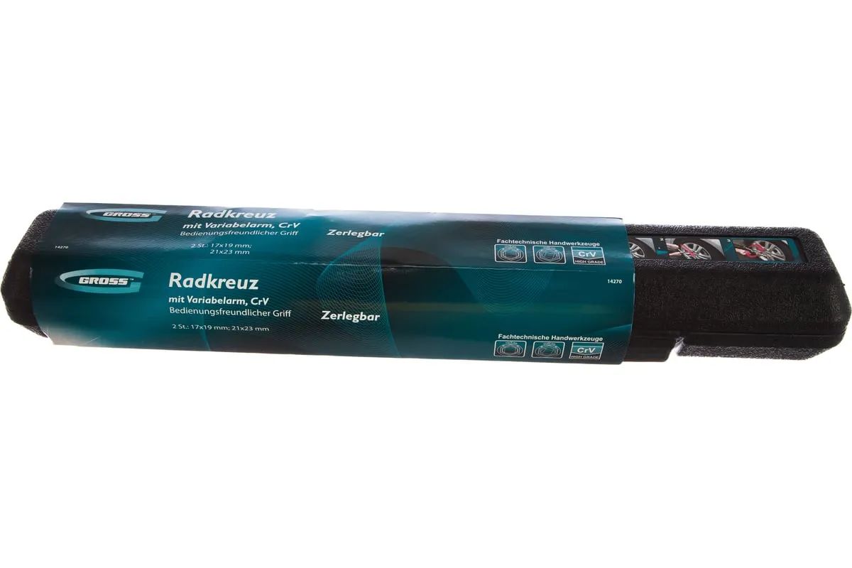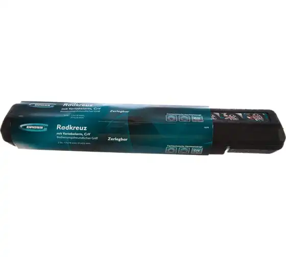 Баллонный ключ-крест с изменяющимся рычагом GROSS 14270 - это стальной ключ с присоединительным квадратом 1/2, который используется для монтажа и демонтажа резьбовых соединений, например, при замене автомобильных колес. Он сделан из хромованадиевой стали.