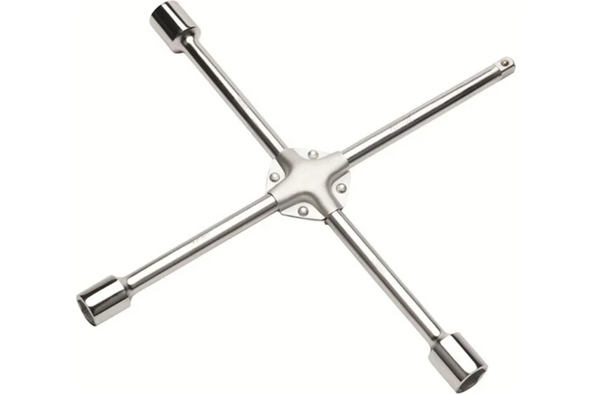 Баллонный крестообразный ключ изготовлен из высокопрочной стали и предназначен для отворачивания колесных болтов размером 17 мм, 19 мм и 21 мм. Инструмент также имеет квадратный разъем 1/2" для присоединения головок других размеров. Рекомендуется для профессионального использования.