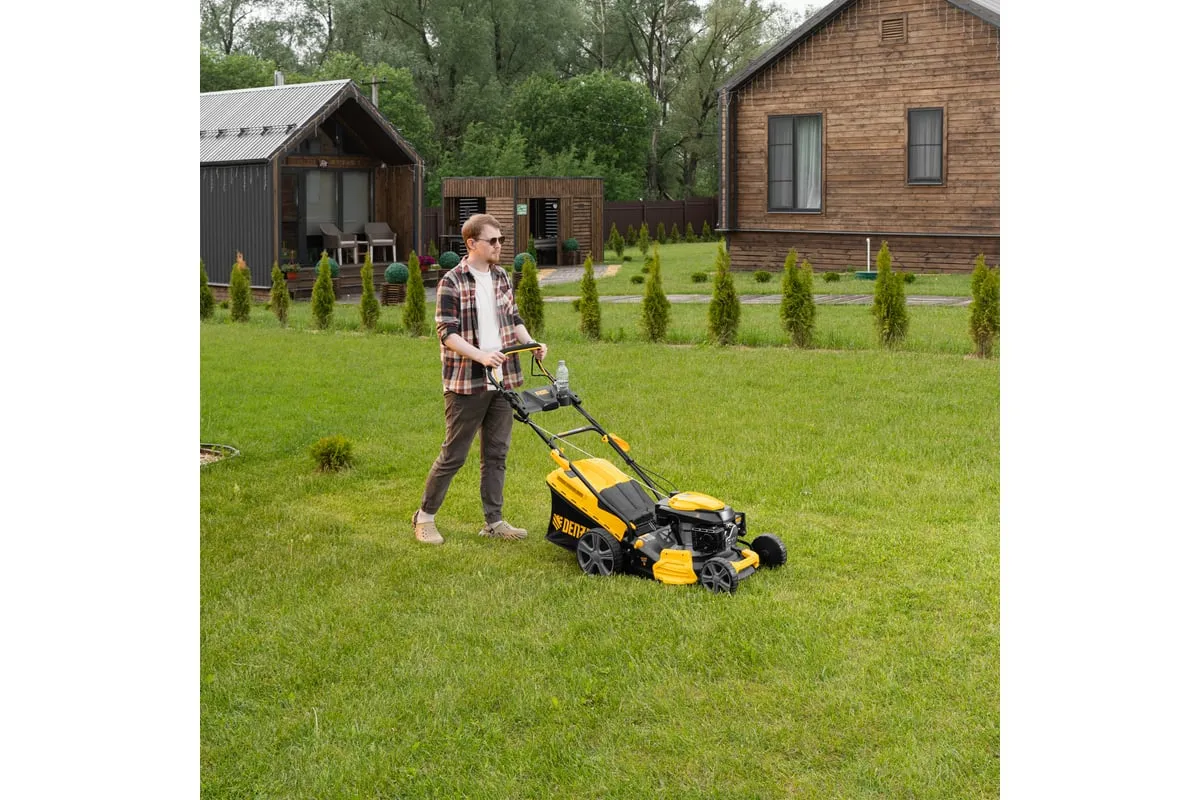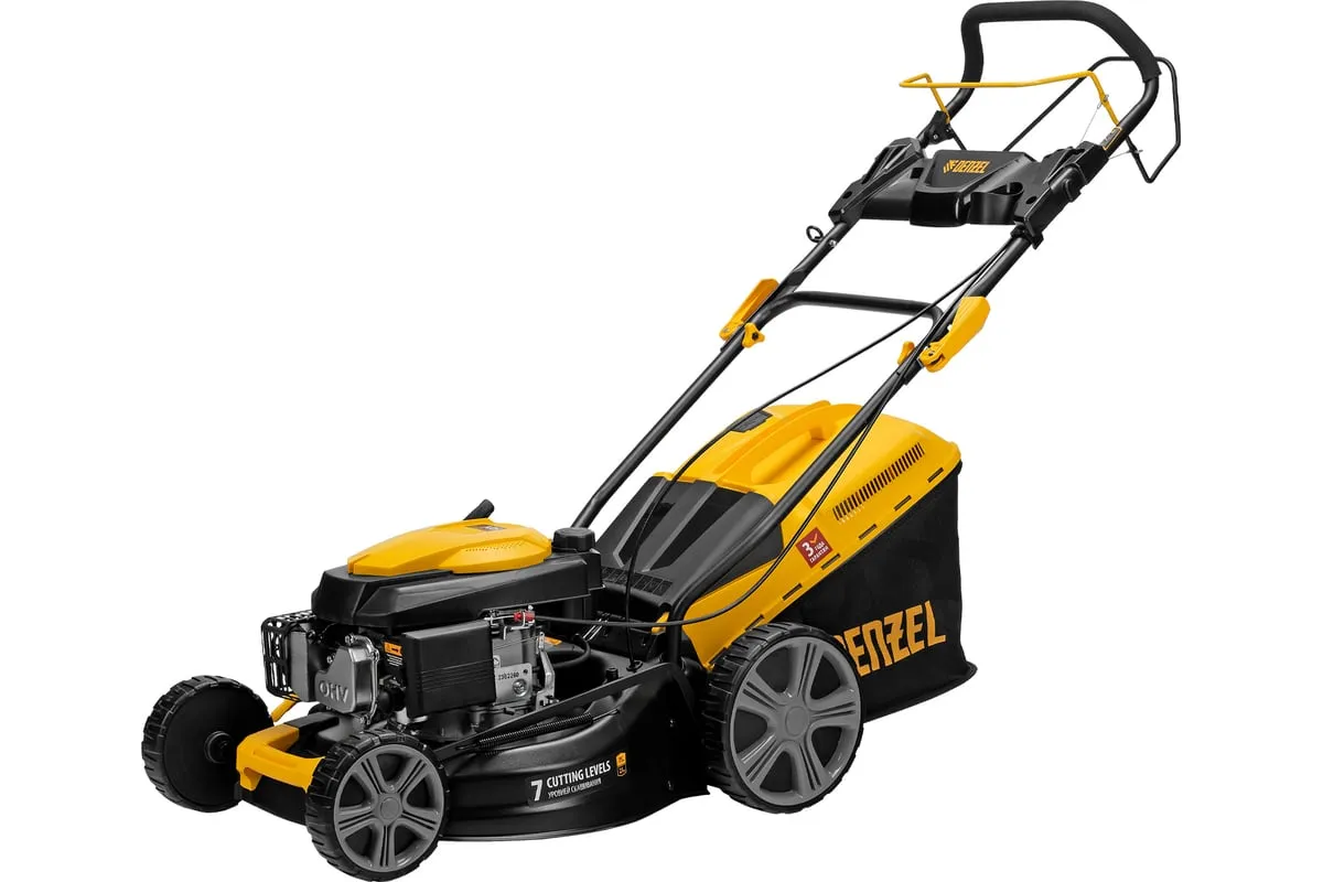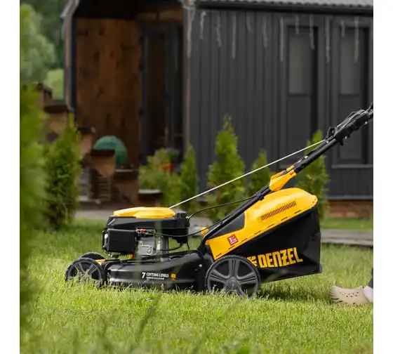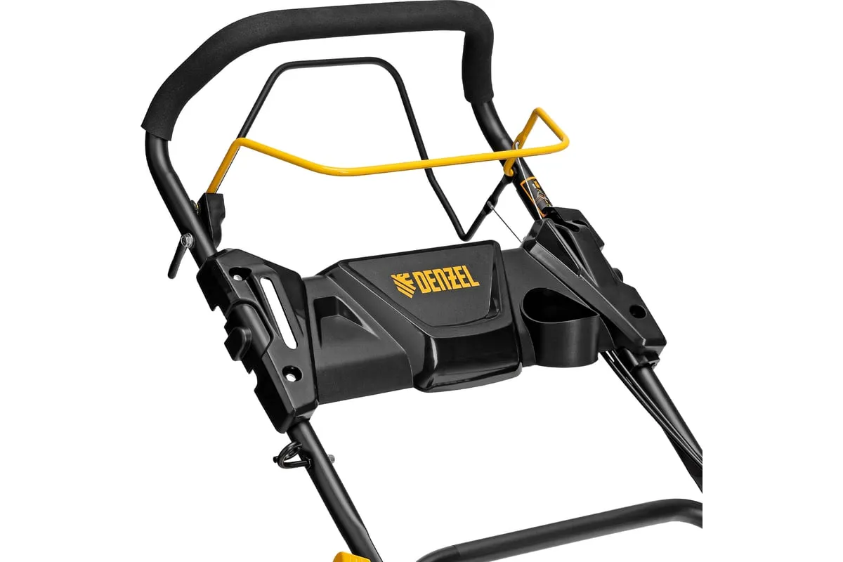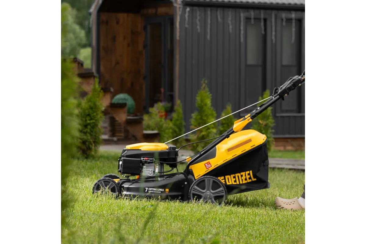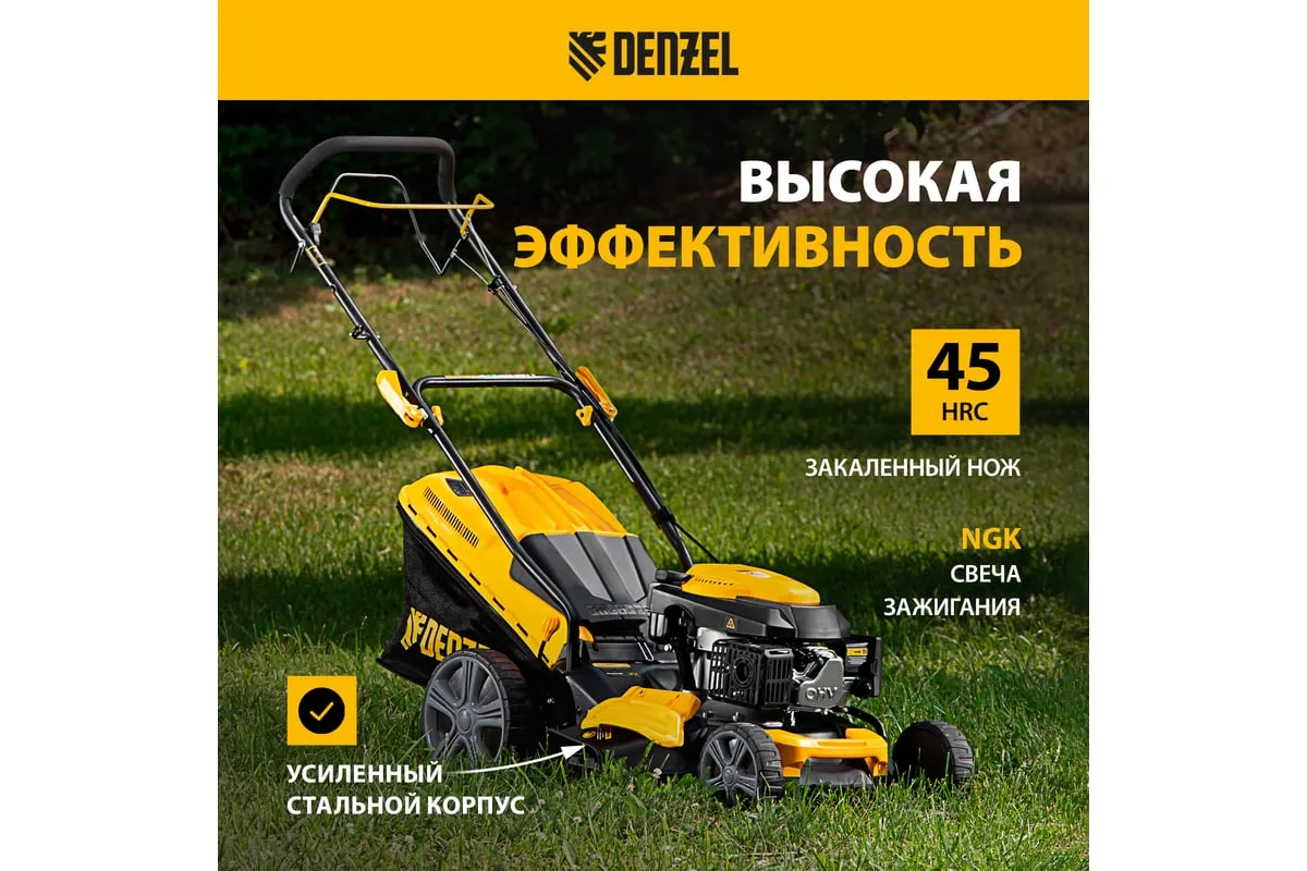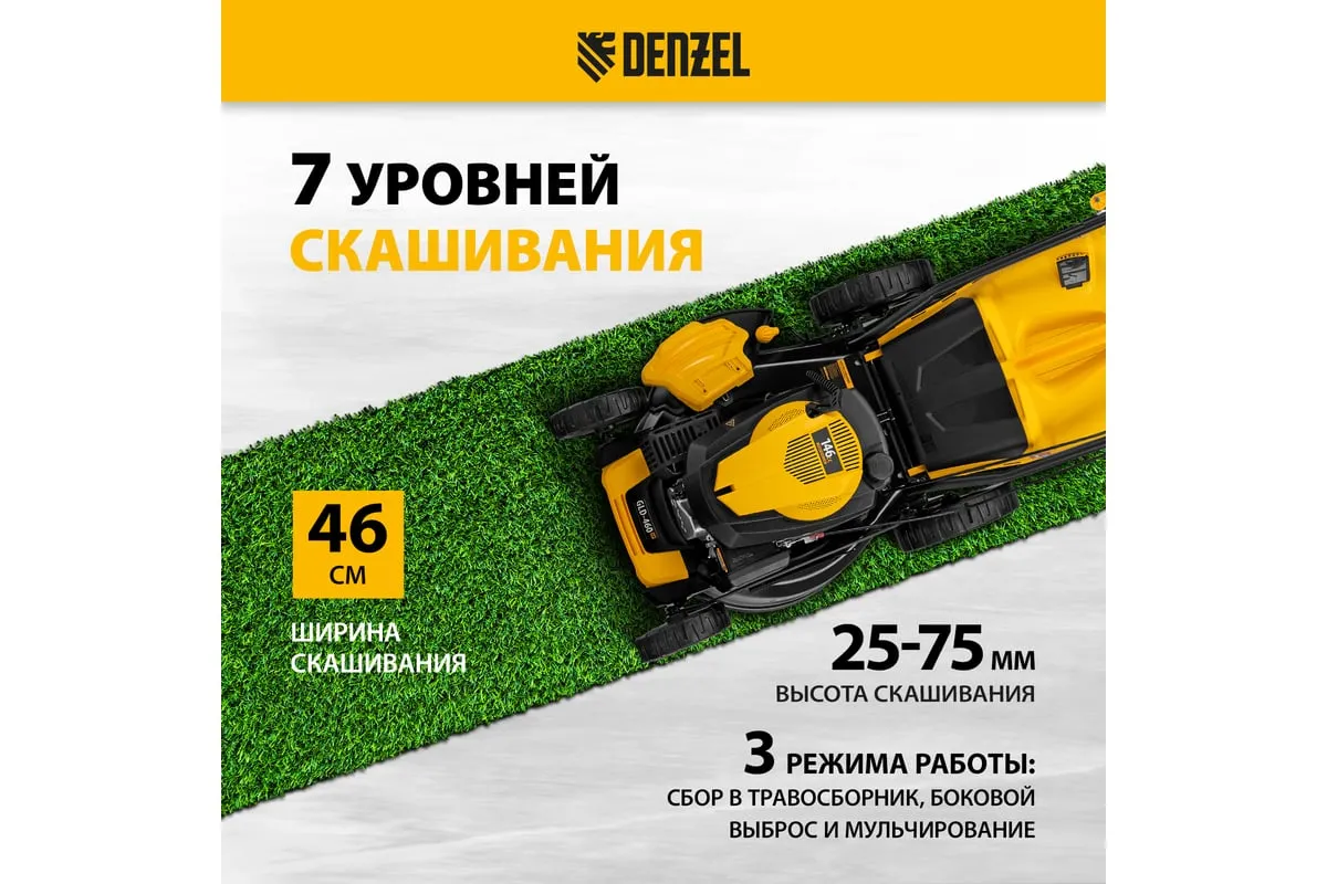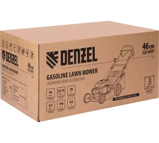 Двигатель Denzel обеспечивает высокую скорость вращения ножа в 3000 об/мин, разумно потребляя топливо. Одного бака хватает на 40-60 минут работы. Ширина скашивания травы за один проход составляет 46 см — таким образом, за 1,5 часа Вы обработаете около 2500 кв. м. Косилка формирует газон высотой от 25 до 75 мм. Всего доступно 7 уровней скашивания, поэтому можно создать как спортивную площадку, так и элитный партерный газон.