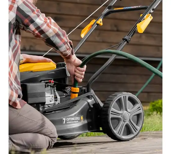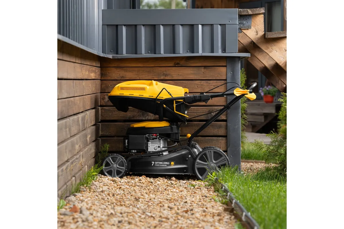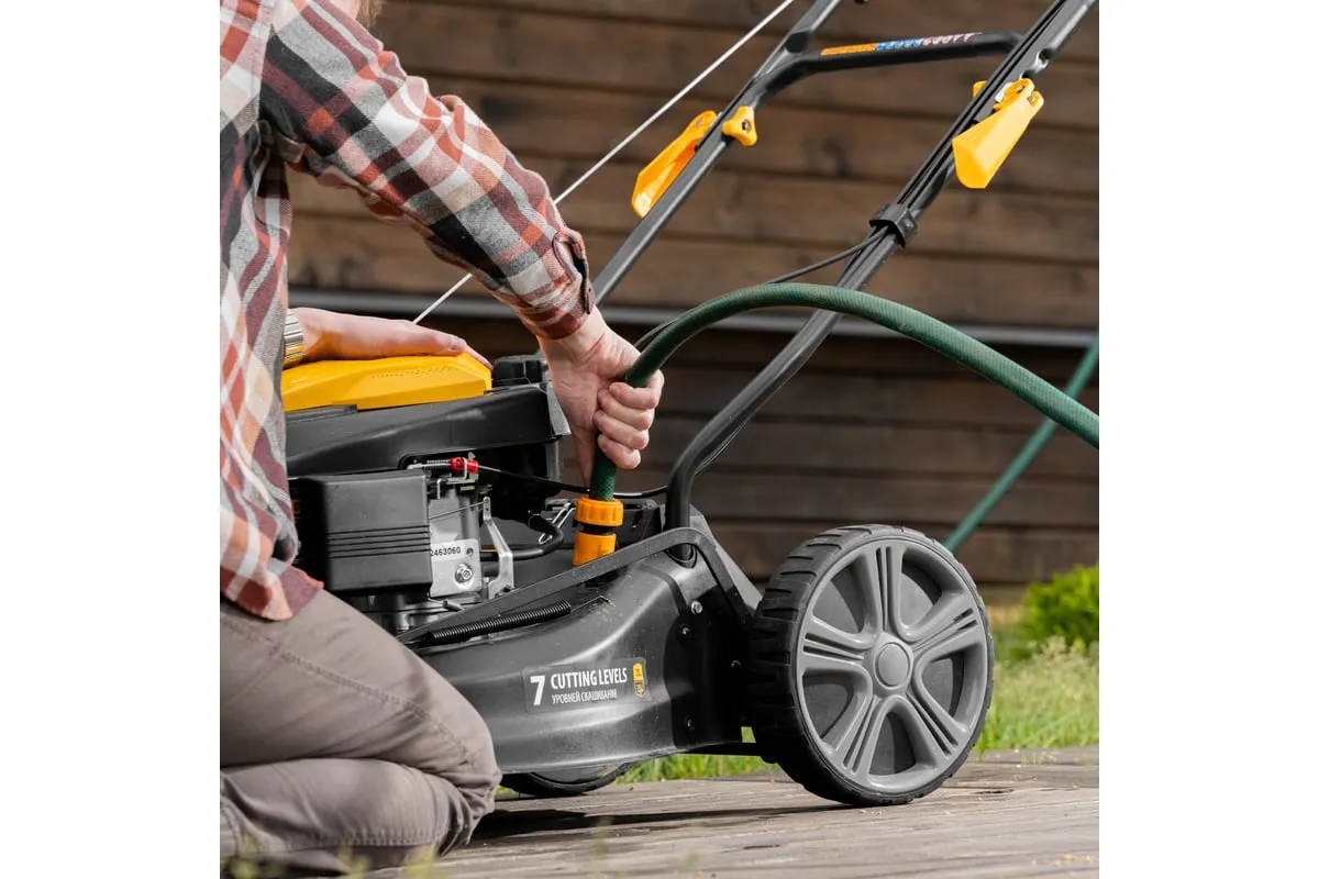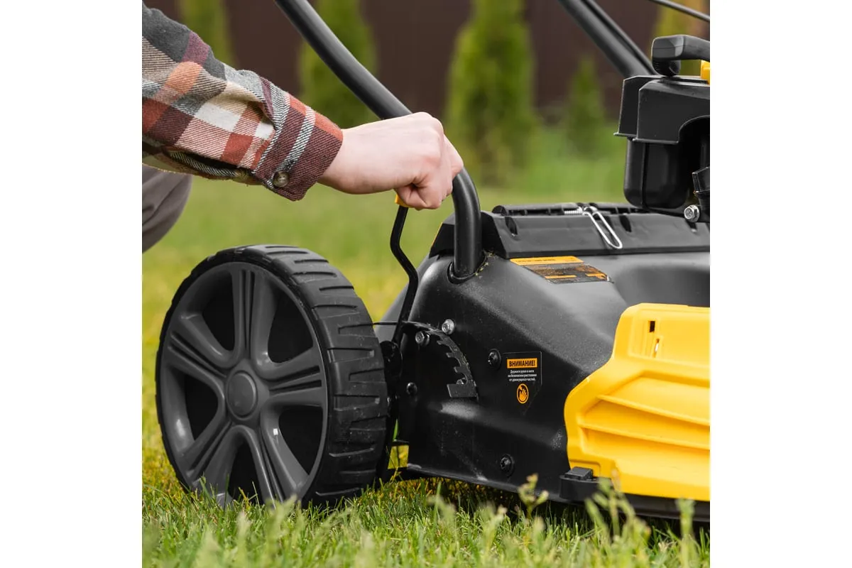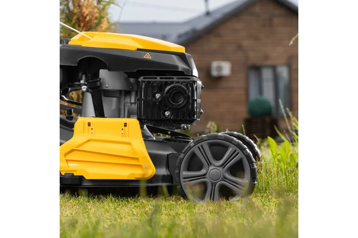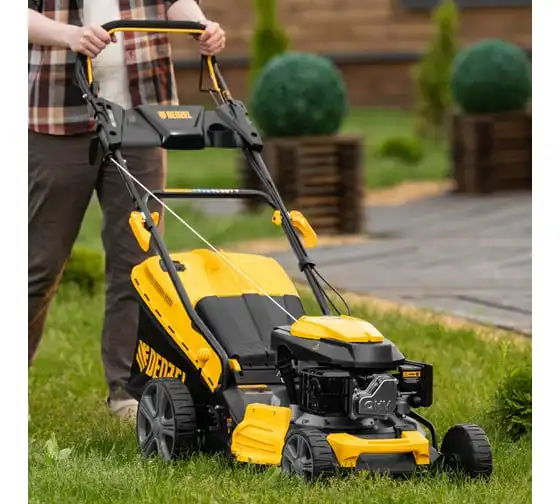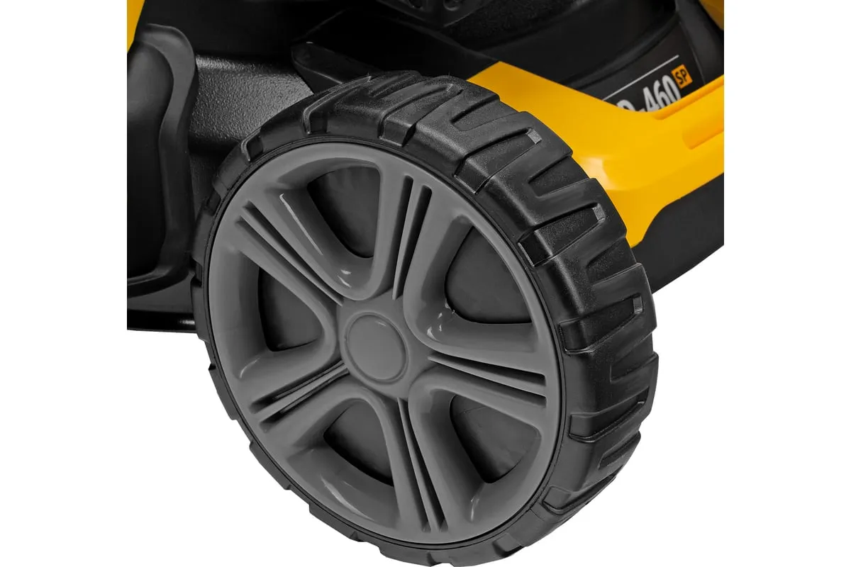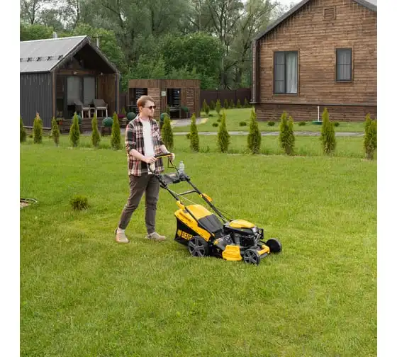 Двигатель Denzel обеспечивает высокую скорость вращения ножа в 3000 об/мин, разумно потребляя топливо. Одного бака хватает на 40-60 минут работы. Ширина скашивания травы за один проход составляет 46 см — таким образом, за 1,5 часа Вы обработаете около 2500 кв. м. Косилка формирует газон высотой от 25 до 75 мм. Всего доступно 7 уровней скашивания, поэтому можно создать как спортивную площадку, так и элитный партерный газон.