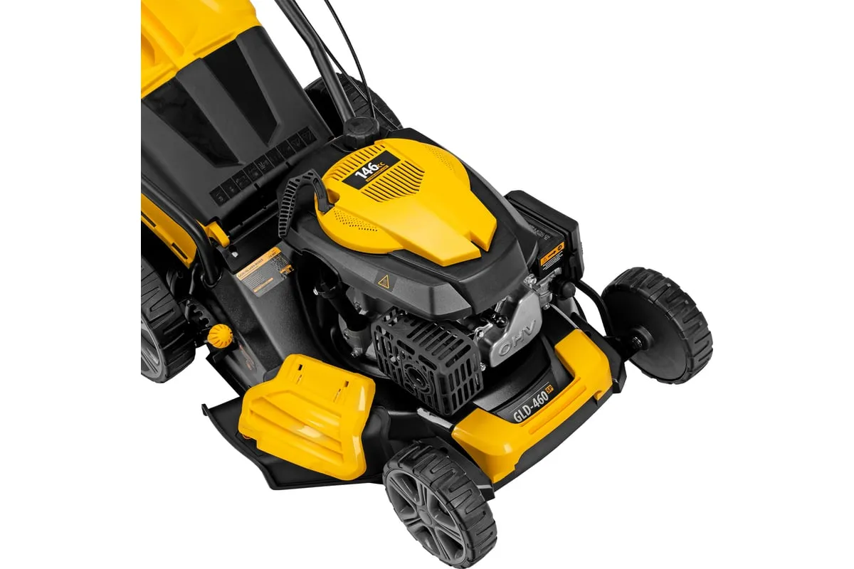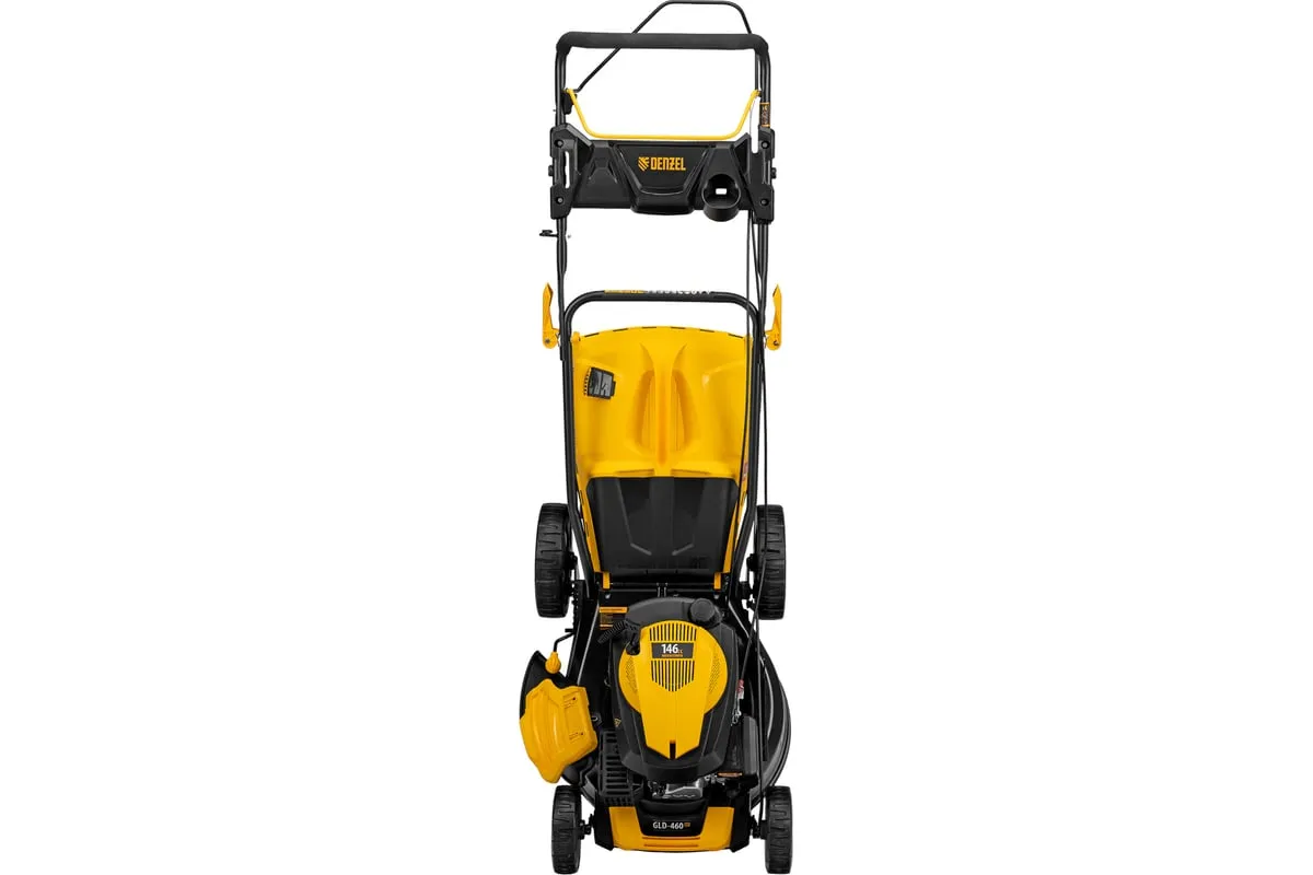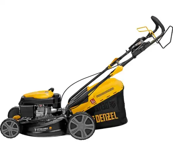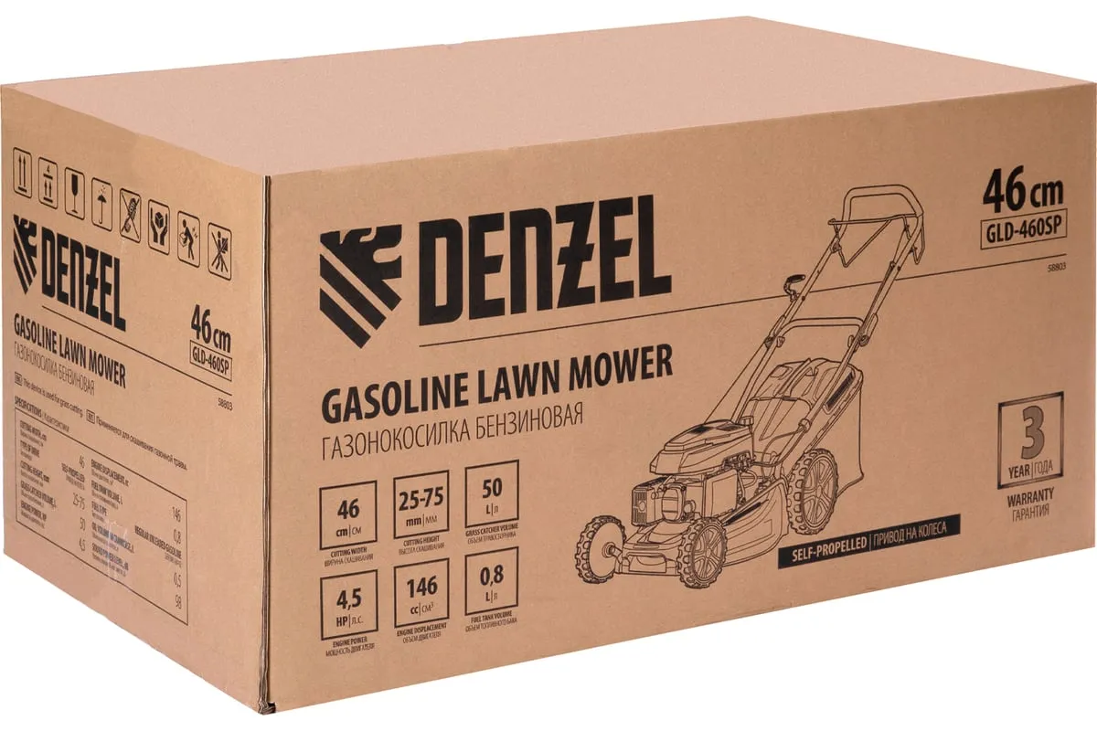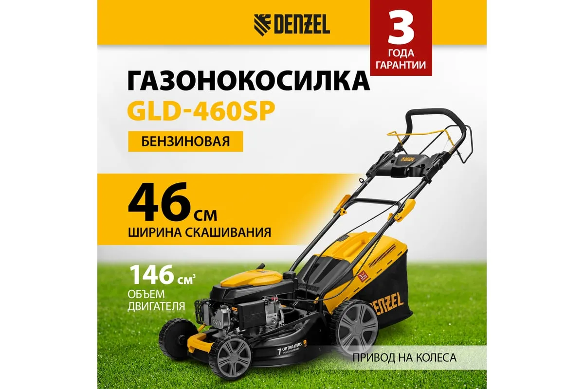 Газонокосилка бензиновая Denzel GLD-460SP 58803 с двигателем объемом 146 куб.см, с приводом, отличается шириной прохода 46 см, имеет 7 уровней скашивания и оборудована травосборником на 50 л. Предназначена для срезания и мульчирования травы на приусадебном участке. Усиленная дека, увеличенный диаметр колес и прочный нож обеспечивают эффективное окашивание сложной территории с зарослями и стеблями. При систематическом применении газонокосилка предотвращает распространение сорняков на участке.