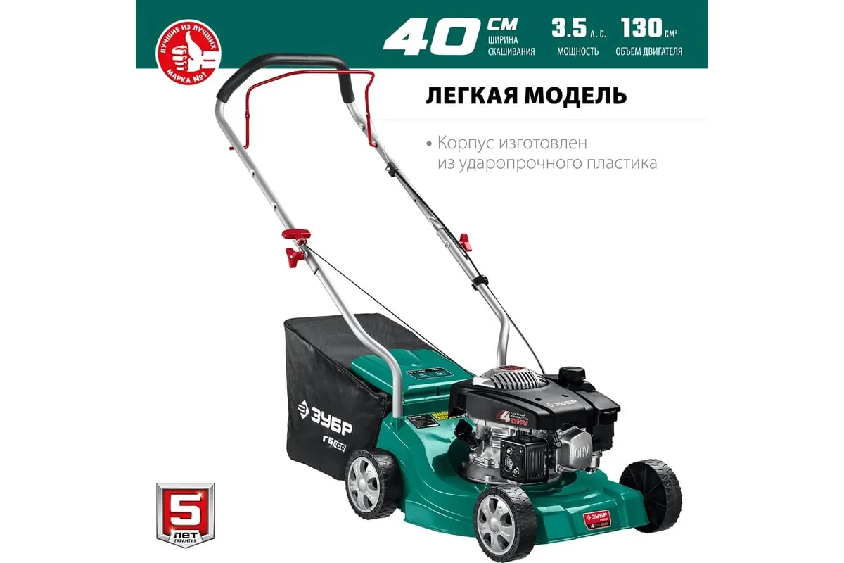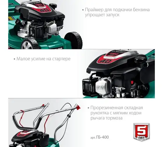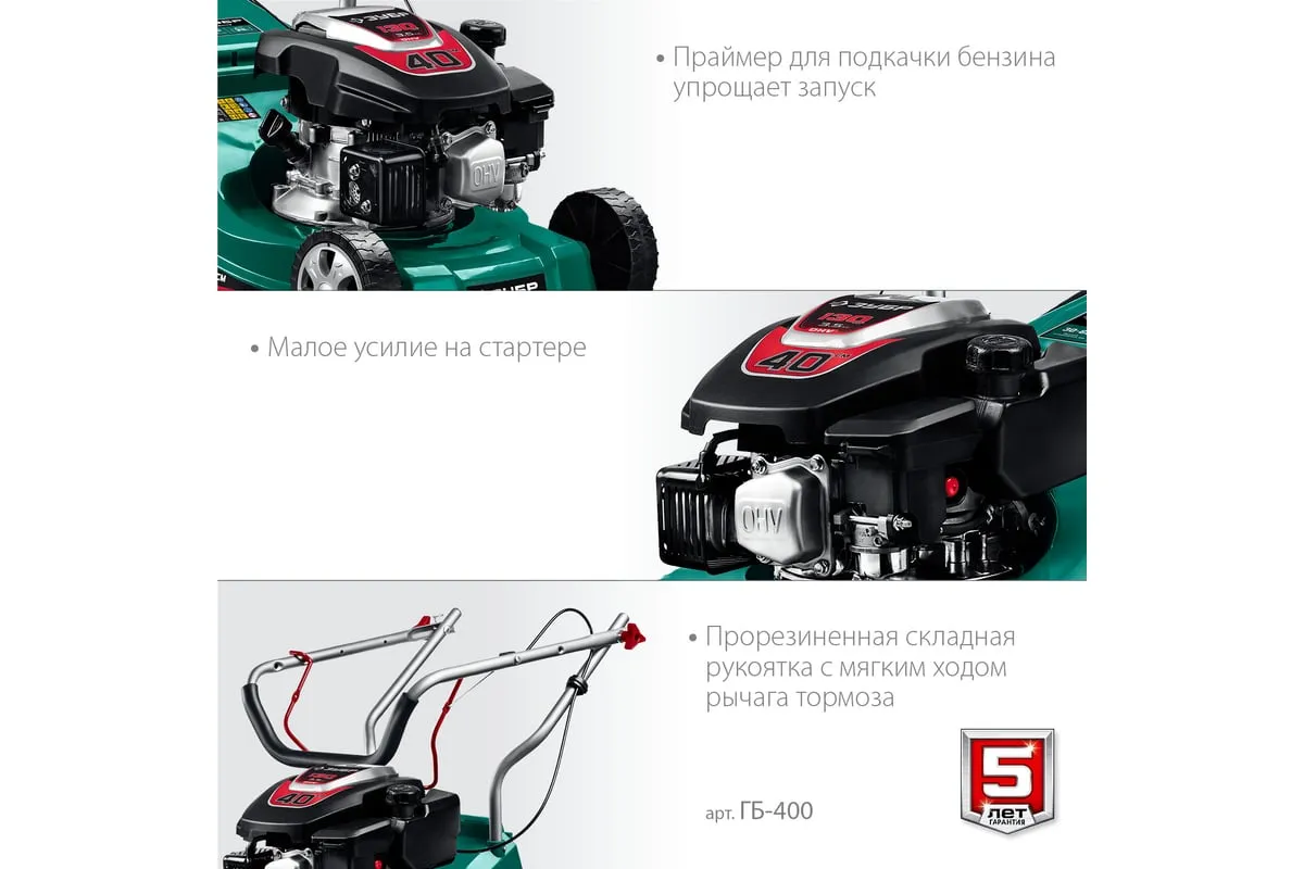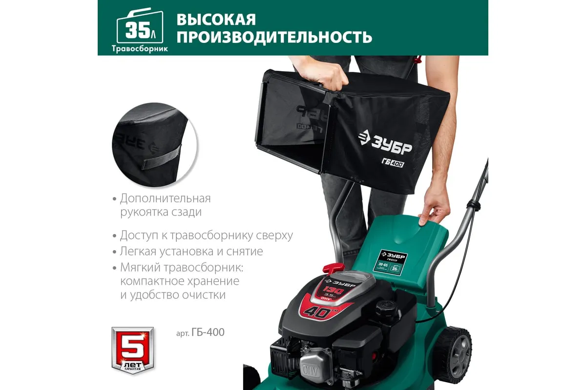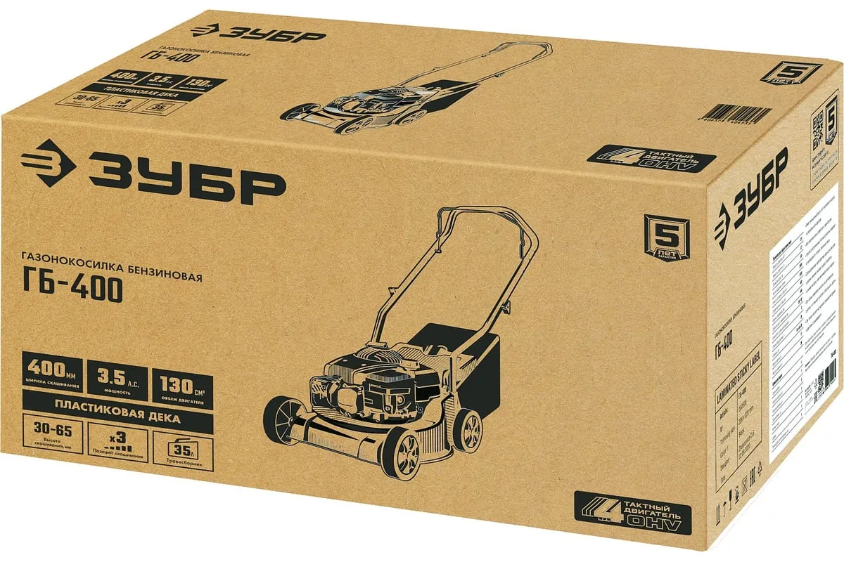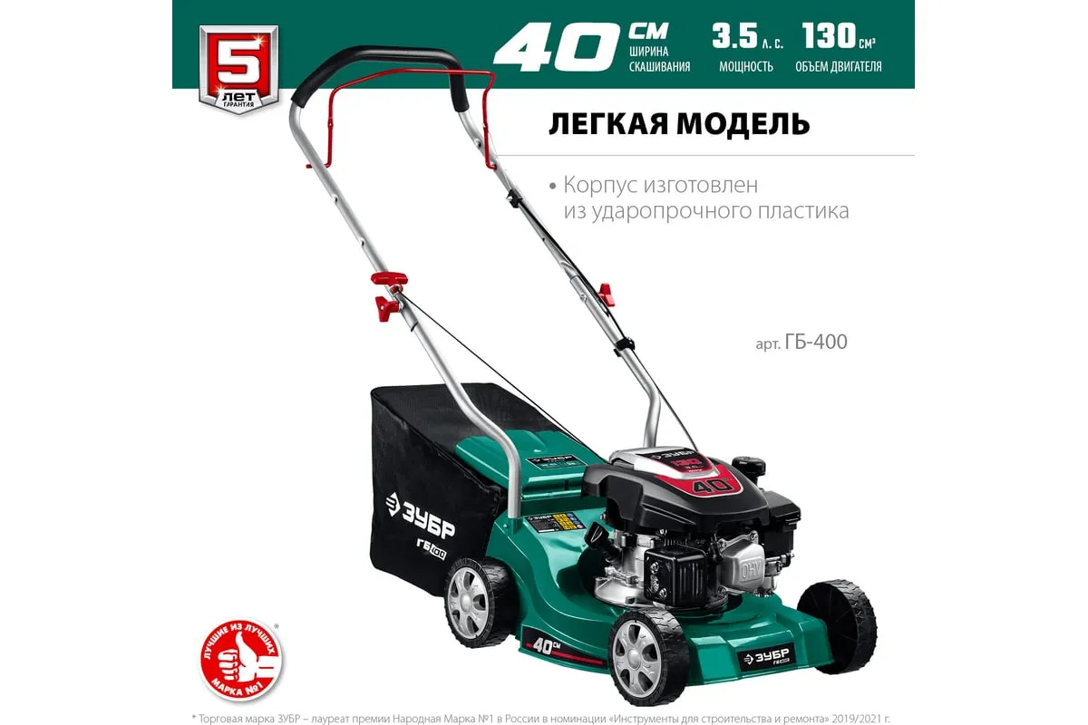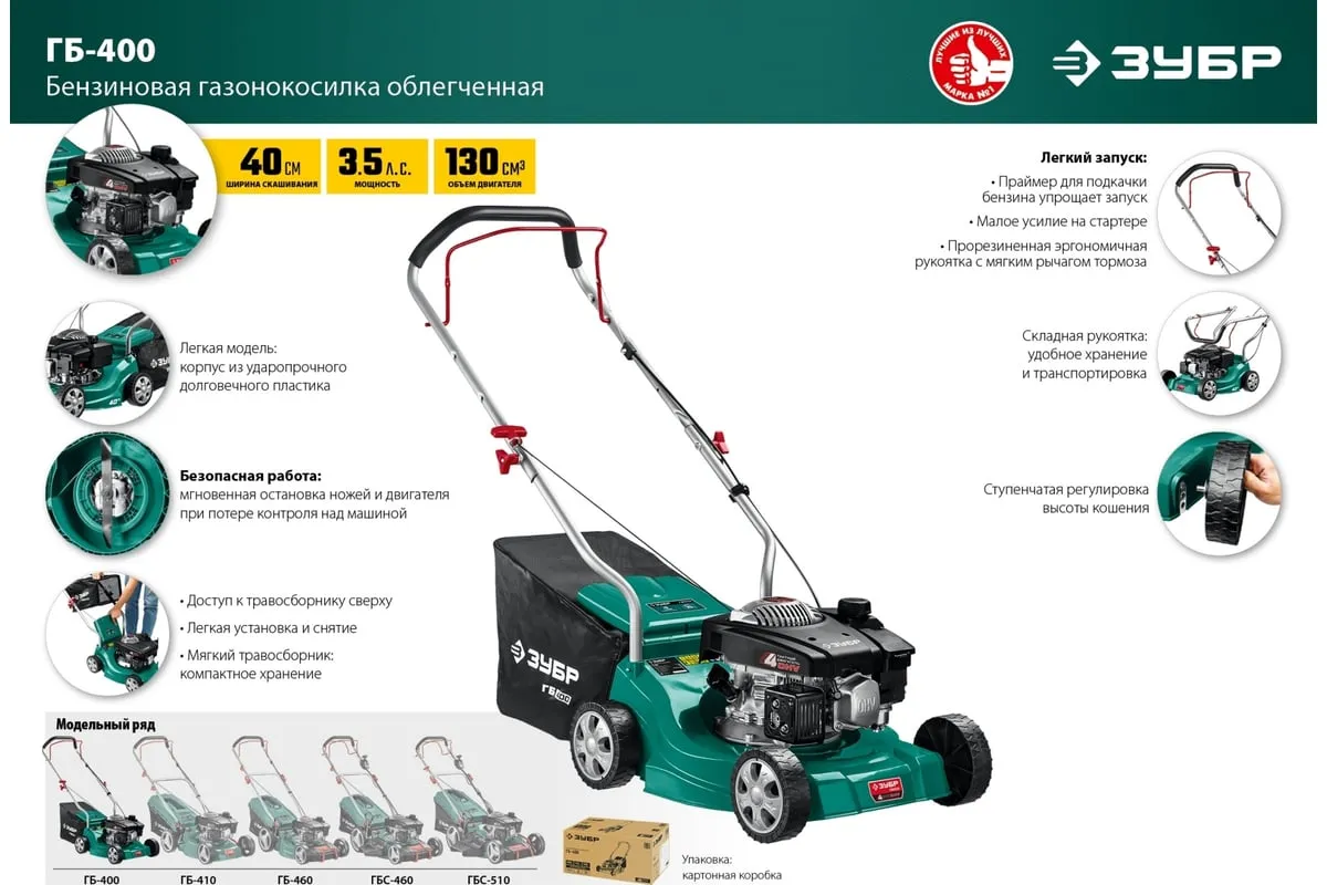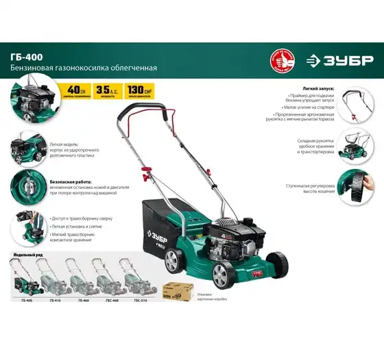 Бензиновая газонокосилка ЗУБР 400 мм, 2.5 л.с. ГБ-400 – облегченная модель для стрижки густой растительности на садовых и придомовых территориях. Модель оборудована мощным бензиновым двигателем, онобеспечивает автономную работу в любой части участка. Ручка с мягкой накладкойобеспечивает надежный хват и комфорт в процессе работы. Для экономии местапри транспортировке и хранении предусмотрена складная рукоятка.