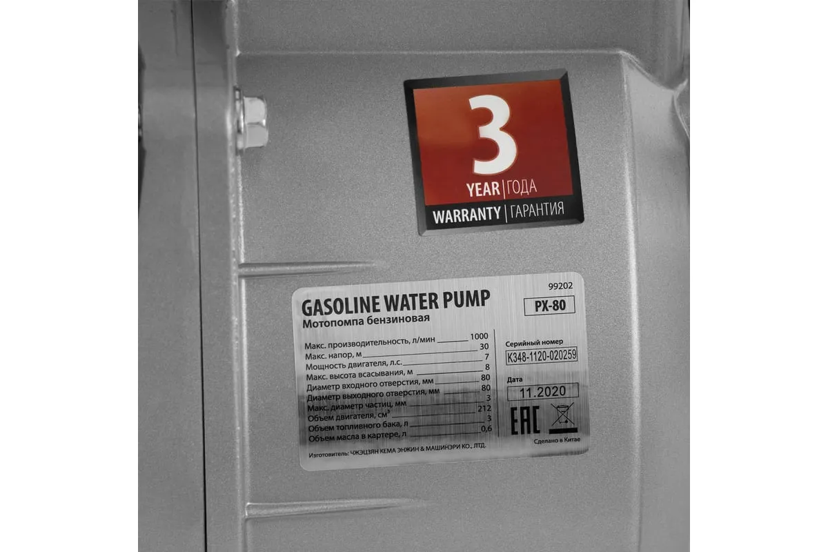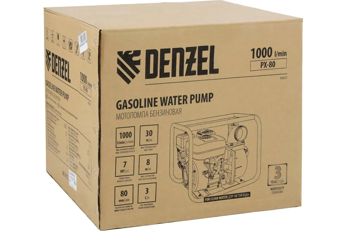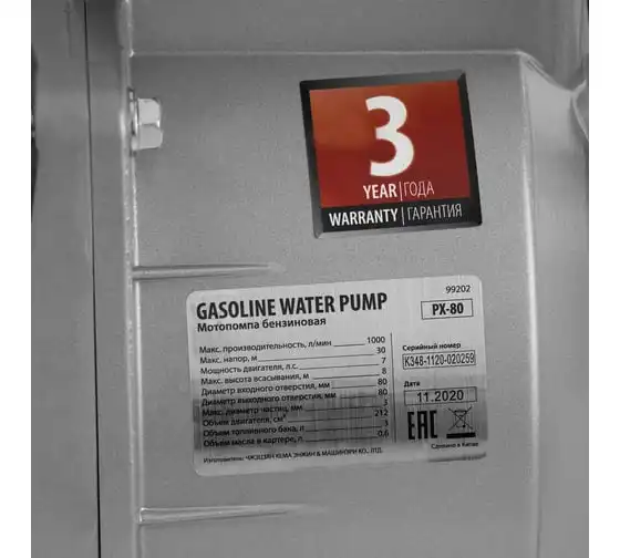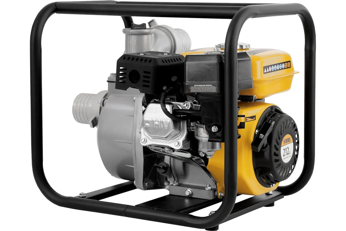 Высокая производительность. Благодаря бензиновому 4-х тактному двигателю мощностью 7 л.с. мотопомпа способна перекачивать 1000 л воды в минуту.