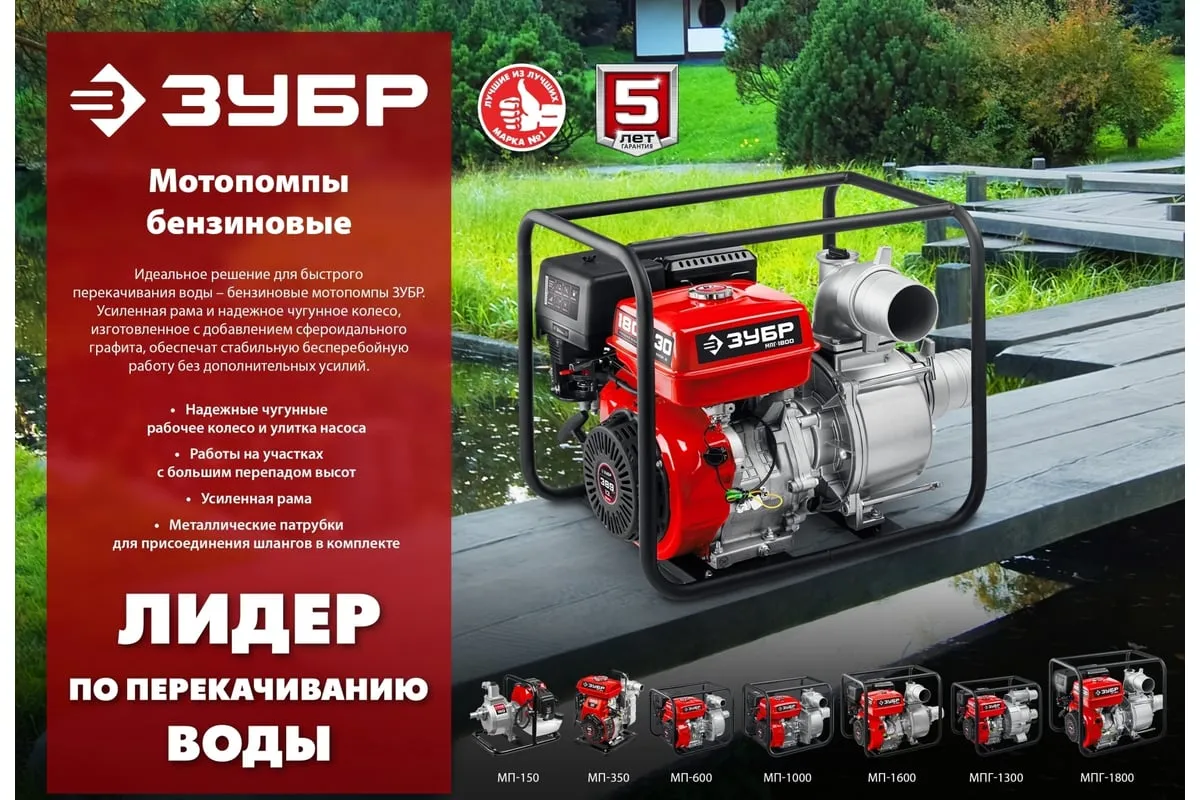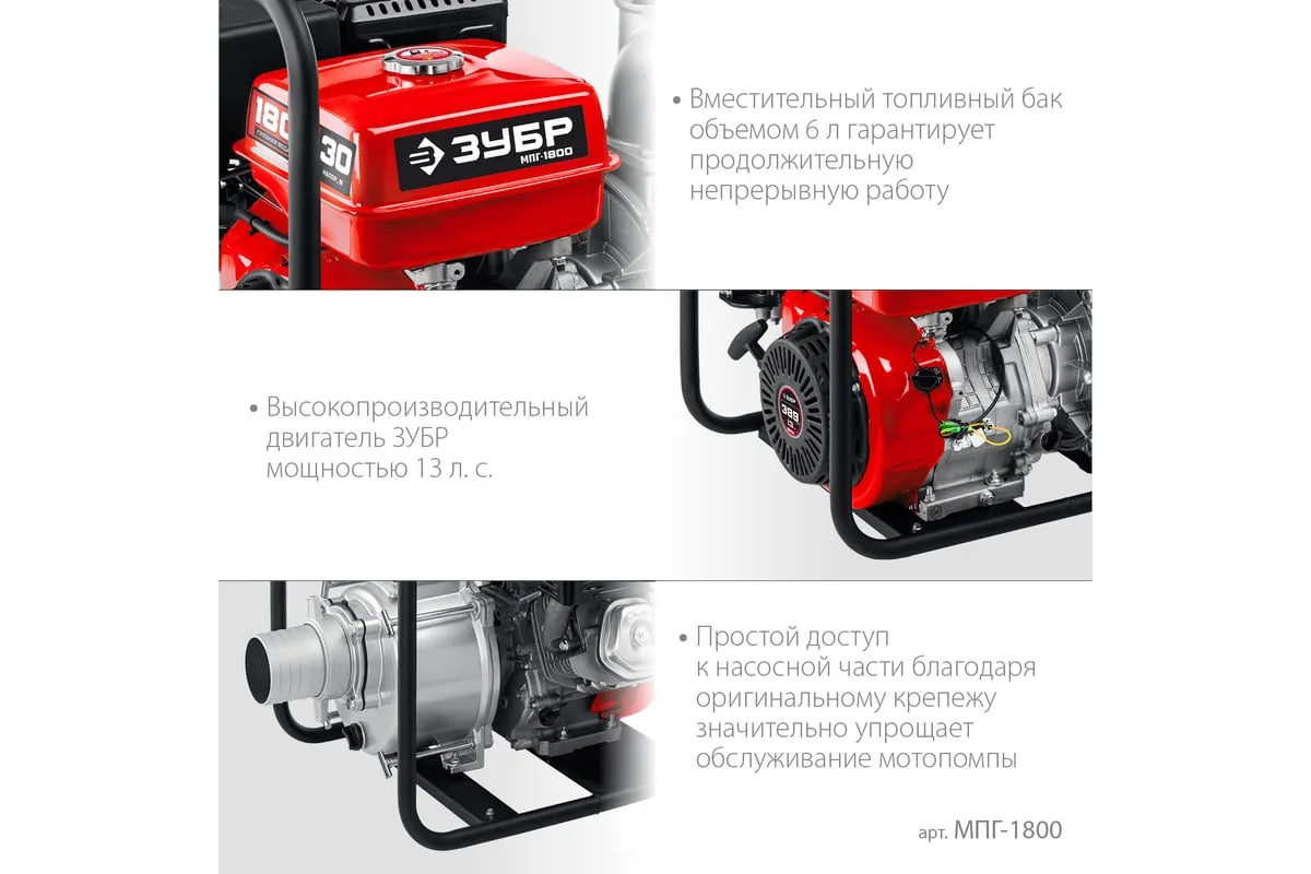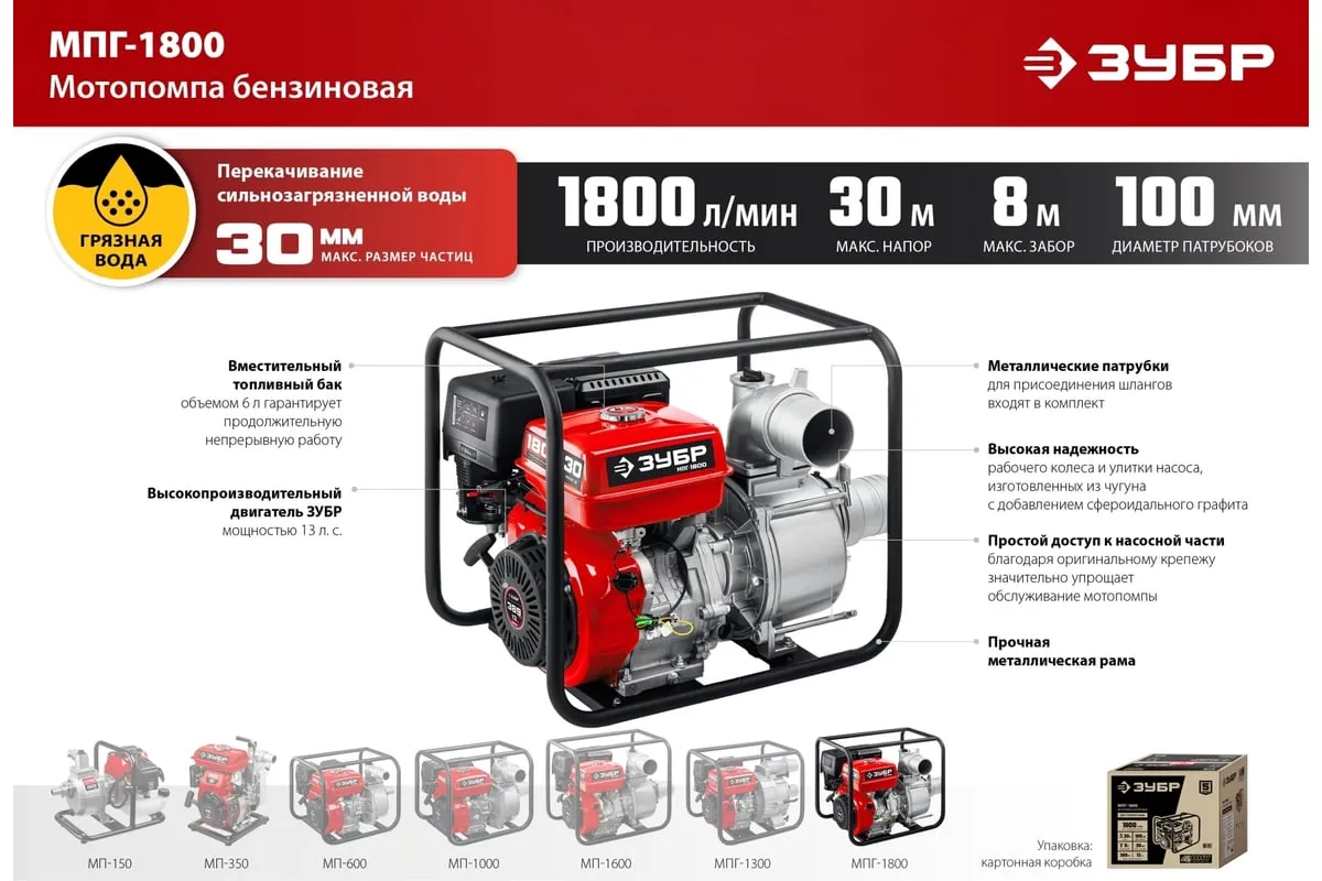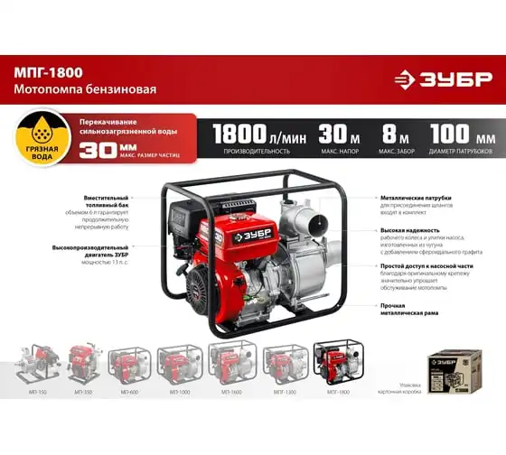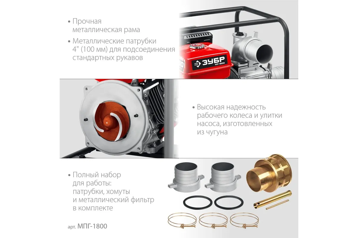 Бензиновая мотопомпа для грязной воды ЗУБР МПГ-1800 подходит для откачки (перекачки) воды из водоемов, подвалов, котлованов, емкостей. Также может использоваться в качестве нагнетающего агрегата для подачи воды при организации полива, заправки емкостей. Высокая надежностьрабочего колеса и улиты насоса, изготовленных из чугуна с добавлением сфероидального графита. Простой доступ к насосной части благодаря оригинальному крепежу значительноупрощает обслуживаниемотопомпы. Усиленная рамаобеспечивает простоту переноскии устойчивость конструкции.