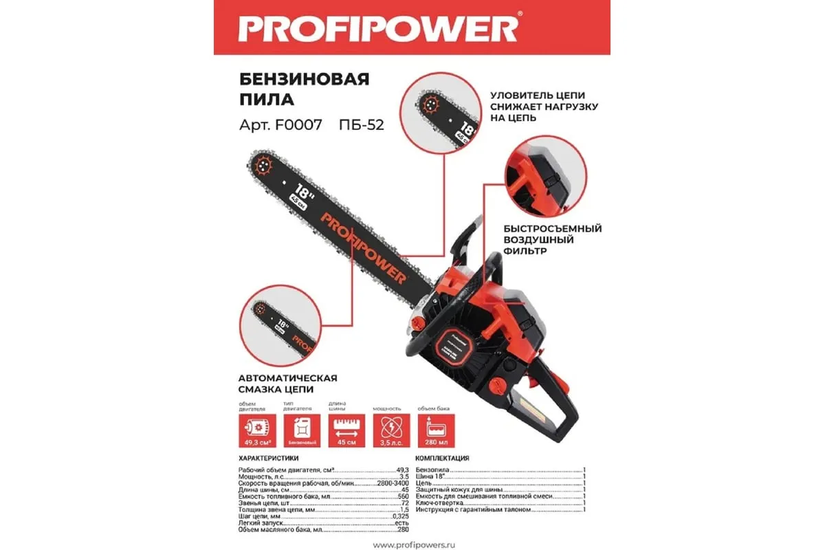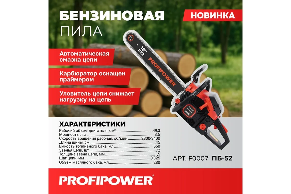 Бензиновая пила PROFIPOWER ПБ-52 мощный инструмент для бытовых нужд.