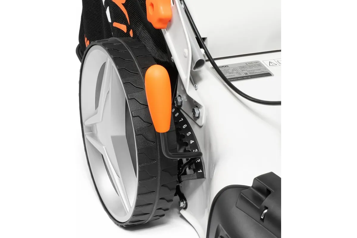 Высота кошения централизованно фиксируется одним рычагом в 10 положениях в пределах от 2.5 до 7.5 см, что позволяет привести газон к желаемому виду.