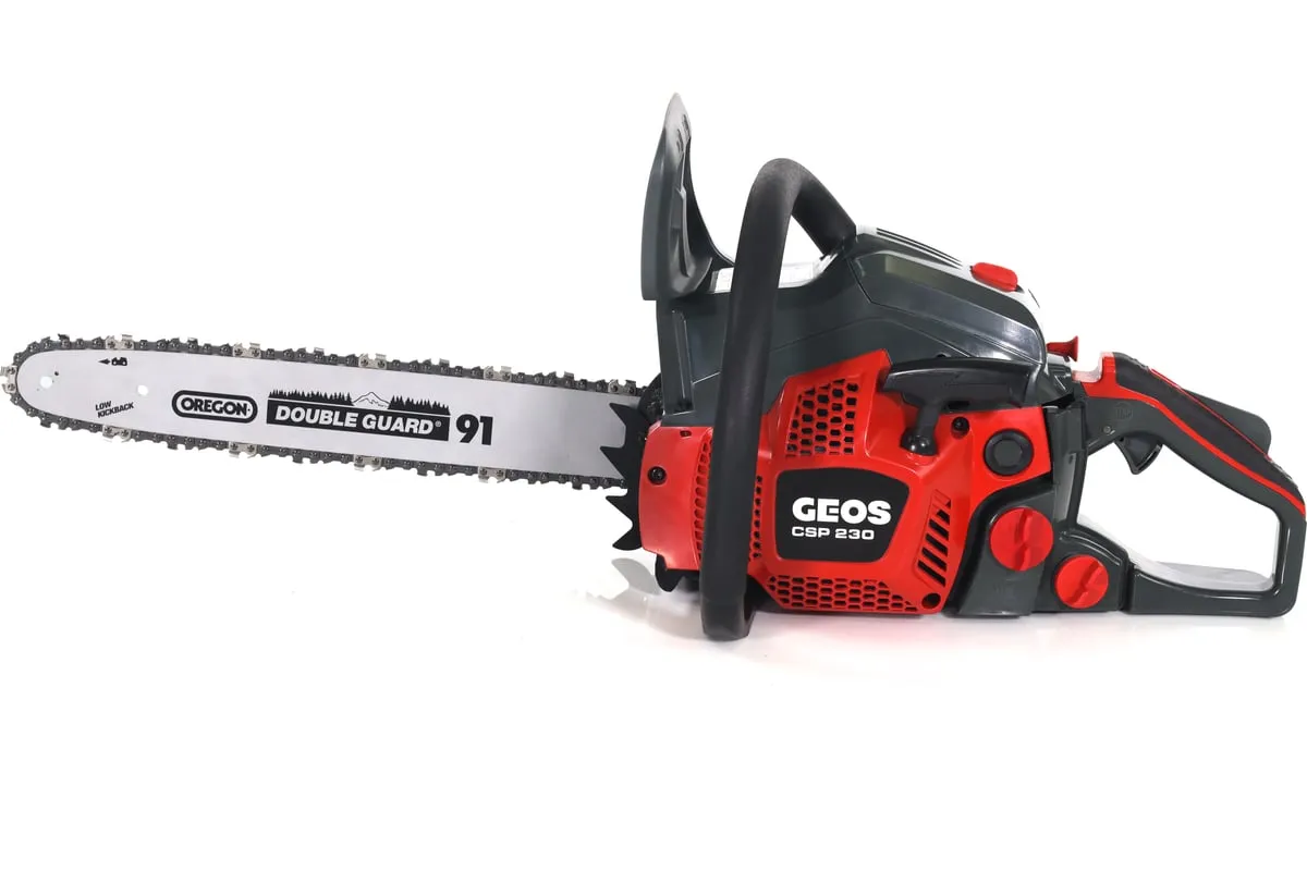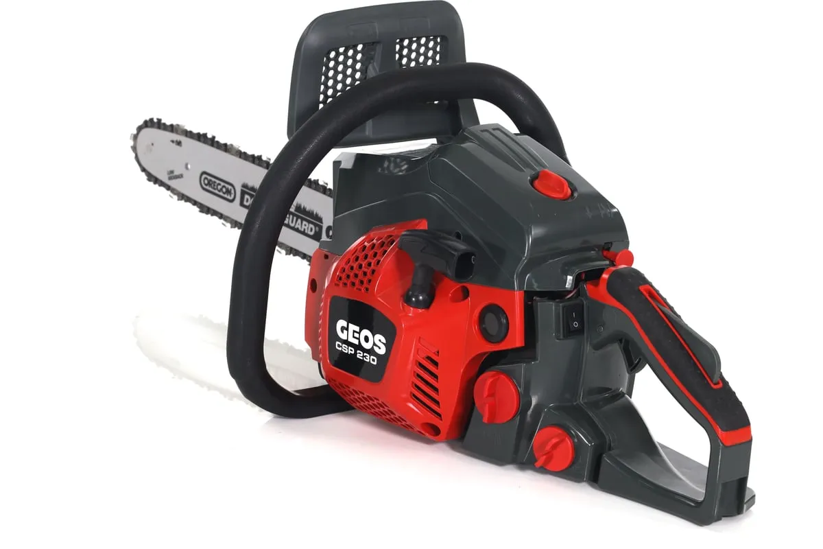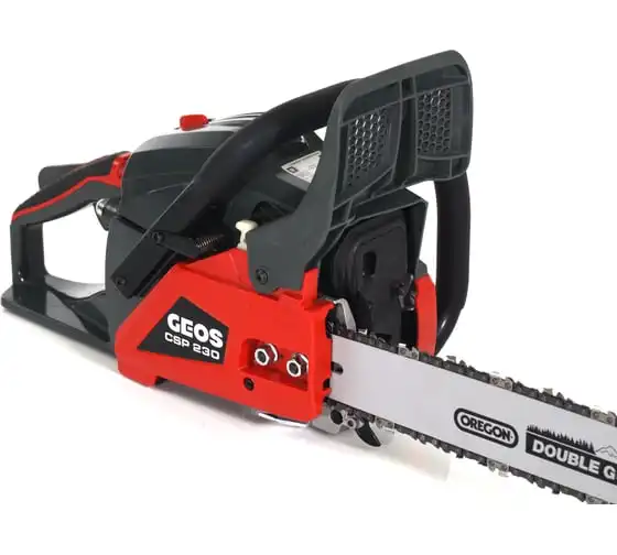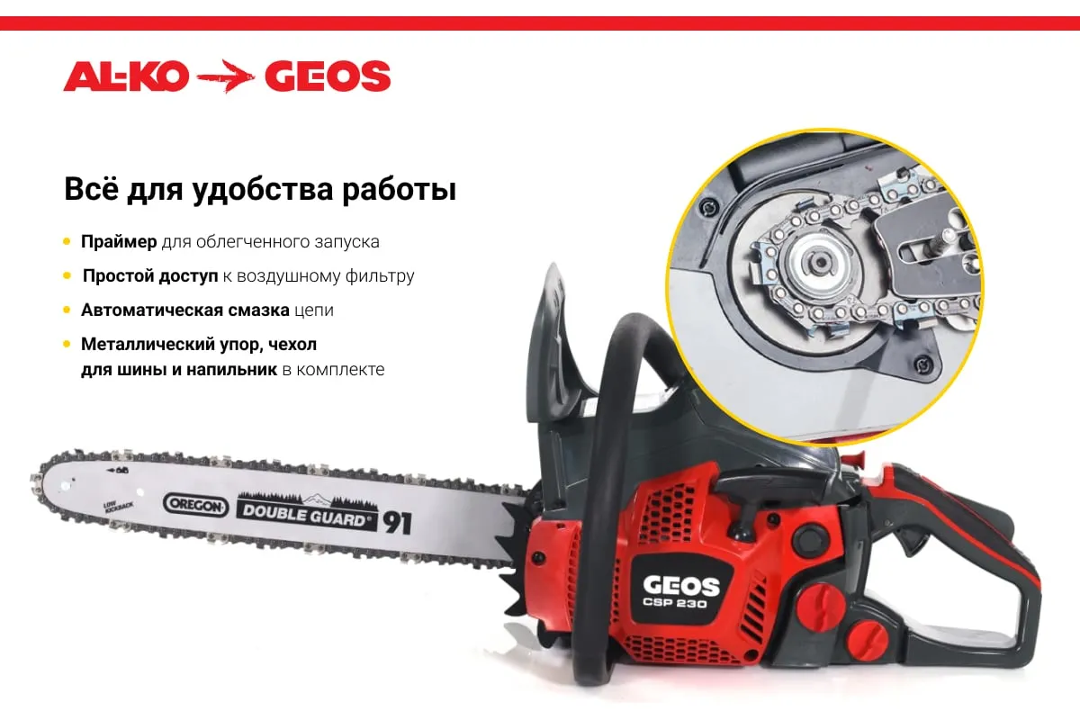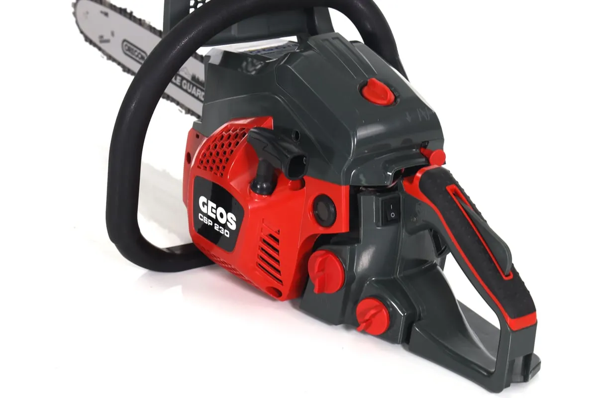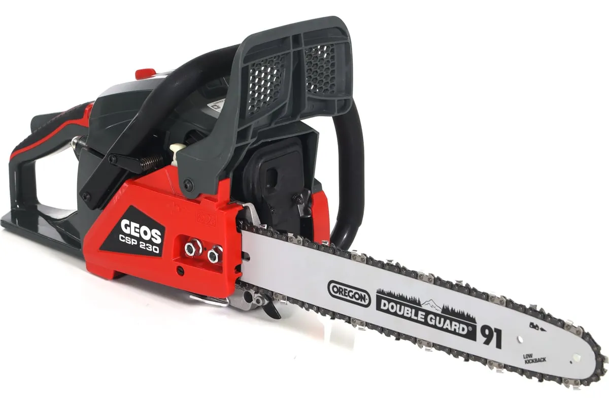 Бензиновая цепная пила GEOS by Alko Comfort CSP230 213334 c пильной шиной длиной 40 см справится с распиловкой любой древесины. Отличается идеальным распределением веса, удобно лежит в руке и ей легко управлять – все для вашего комфорта. С помощью инструмента, входящего в комплект поставки, можно быстро и без усилий отрегулировать натяжение пильной гарнитуры и цепи. Для максимальной безопасности пила оснащена системным тормозом, щитком для предотвращения повреждения рук с системой моментальной остановки цепи.