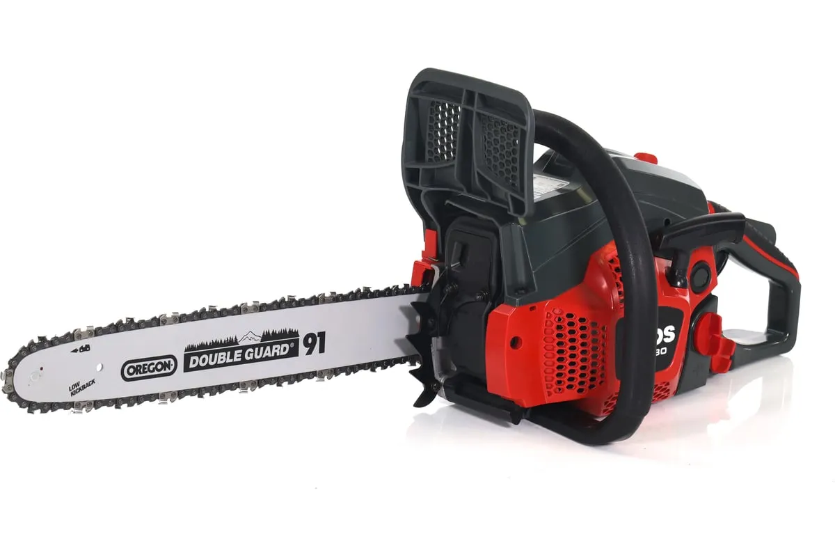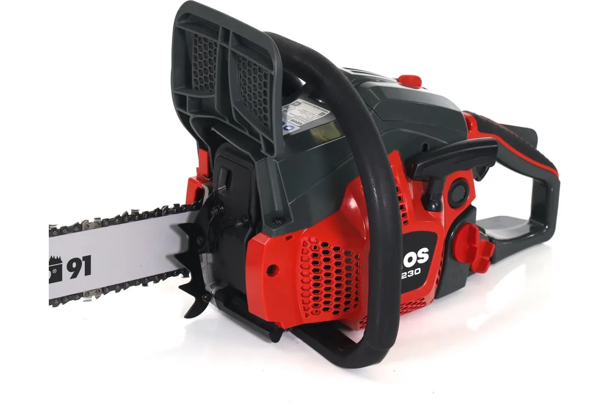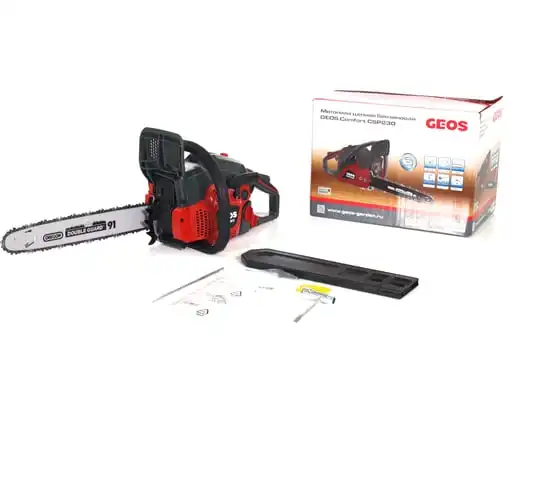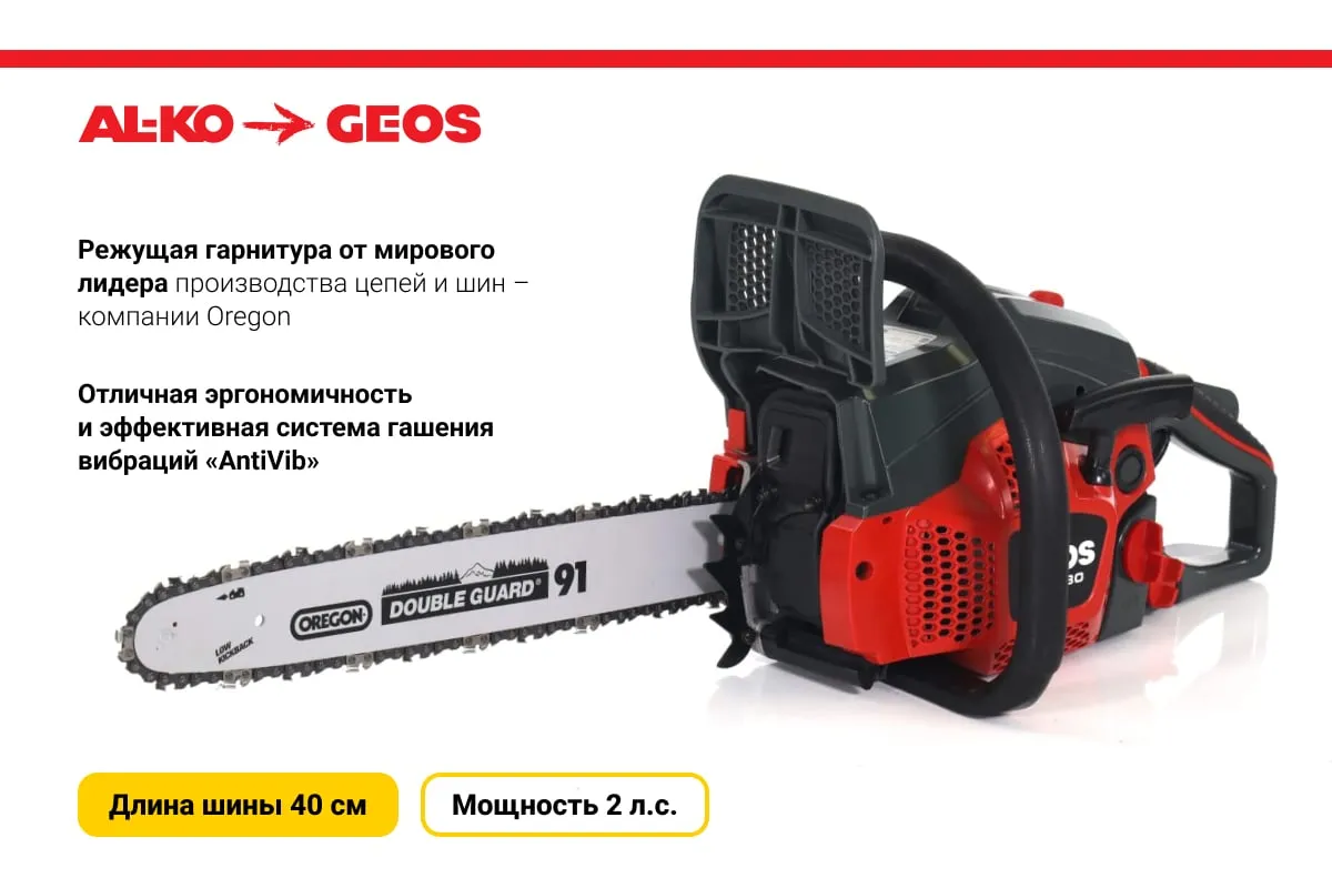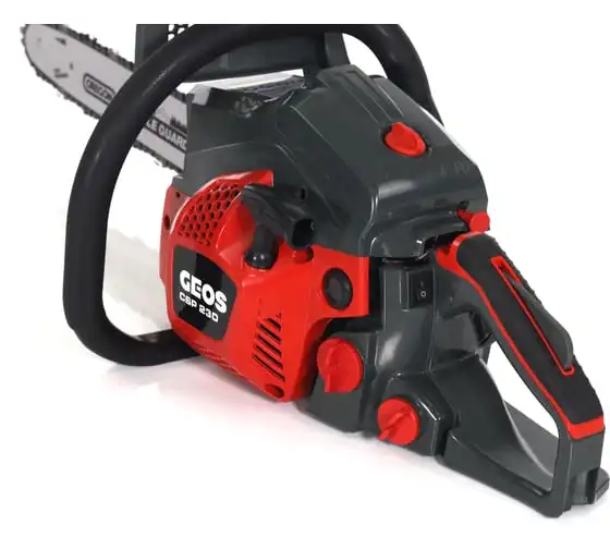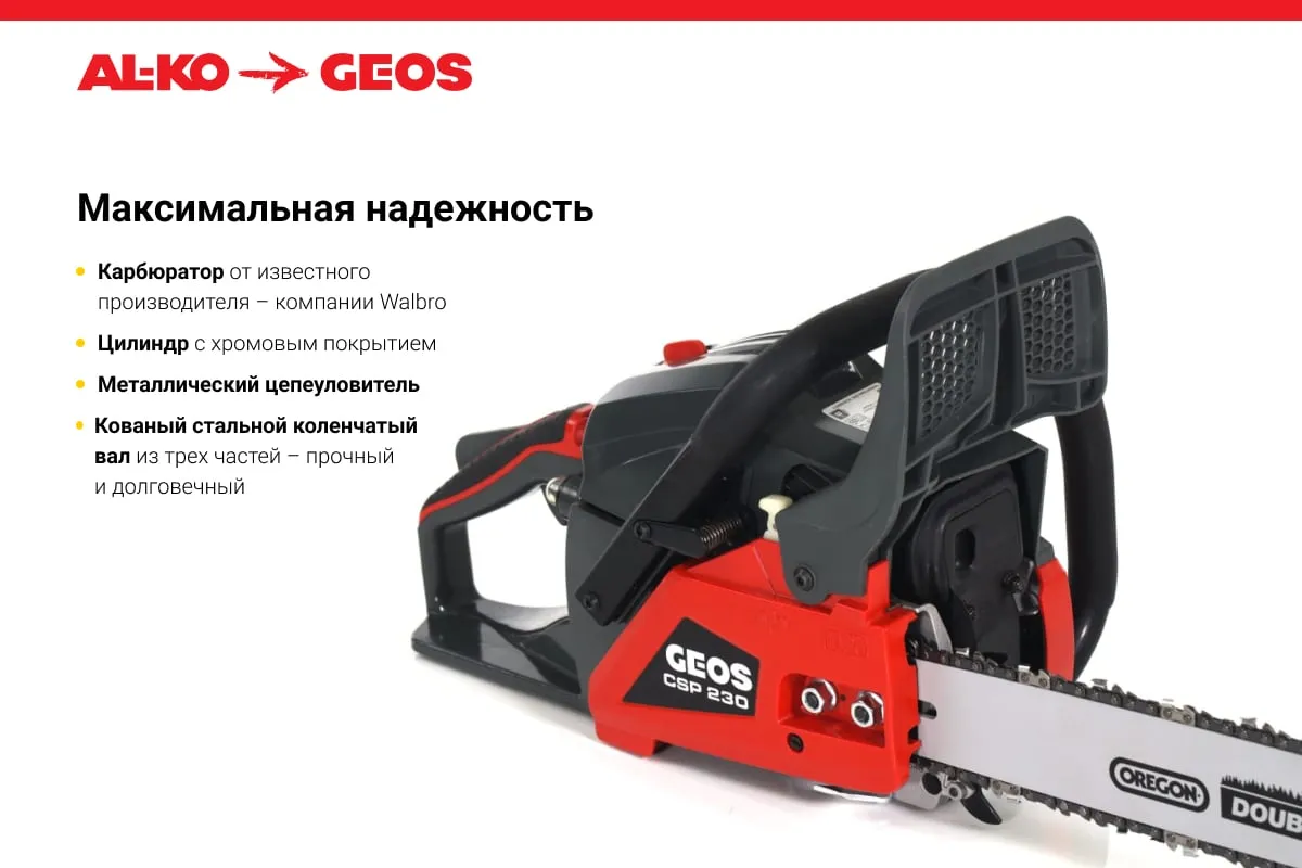 Бензиновая цепная пила GEOS by Alko Comfort CSP230 213334 c пильной шиной длиной 40 см справится с распиловкой любой древесины. Отличается идеальным распределением веса, удобно лежит в руке и ей легко управлять – все для вашего комфорта. С помощью инструмента, входящего в комплект поставки, можно быстро и без усилий отрегулировать натяжение пильной гарнитуры и цепи. Для максимальной безопасности пила оснащена системным тормозом, щитком для предотвращения повреждения рук с системой моментальной остановки цепи.