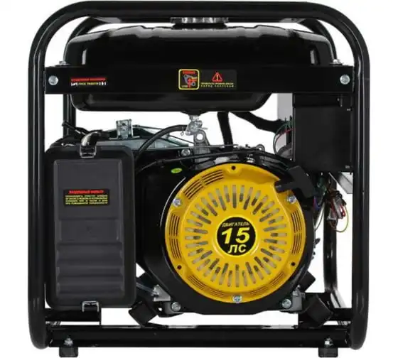 Генератор оснащен 4Т одноцилиндровым двигателем с воздушным охлаждением мощностью 15 л. с. В качестве топлива используется бензин АИ-92, вместительность бака составляет 25 л. Включение агрегата производится вручную. Модель оснащена системой стабилизации рабочего тока. Это позволяет бензогенератору формировать чистую синусоиду, необходимую для безопасной работы компьютеров, климатической и другой чувствительной к перепадам напряжения техники. В случае короткого замыкания, критически низкого уровня масла, перегрузки, перегрева срабатывает система защиты, агрегат автоматически отключается. В комплектации предусмотрено наличие ключа с воротком для замены свечи, штепселей для подключения, амортизирующих опор для снижения вибраций. Электростанция поставляется в открытом исполнении на раме. Для более комфортного перемещения раму можно доукомплектовать колесами.