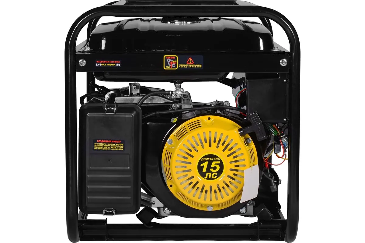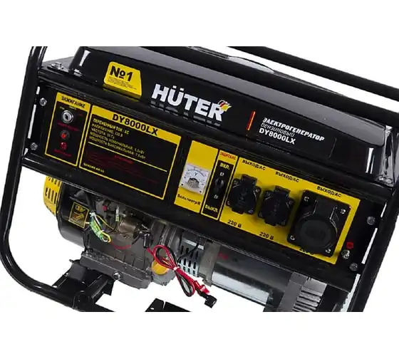 Электрогенератор HUTER DY8000LX имеет надёжную защиту от перегрузок и коротких замыканий. В его конструкции также реализована система блокировки пуска при недостаточном уровне масла. Стартер генератора ручной и электрический от АКБ, что позволяет быстро «стартовать» в любых погодных условиях. Имеется вольтметр для контроля величины напряжения. Для удобства транспортировки агрегат может комплектоваться колёсами (в базовую комплектацию не входят). В целом эта модель зарекомендовала себя как устойчиво работающая, с вместительным бензобаком – 25 л и с экономичным расходом топлива.