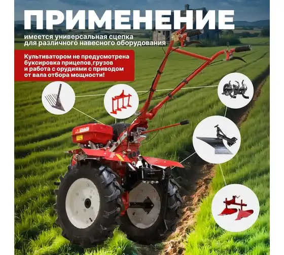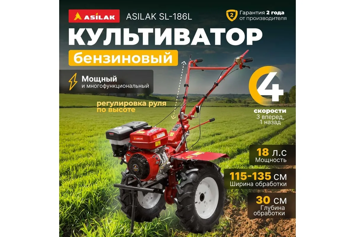 Бензиновый культиватор оснащен универсальной сцепкой для присоединения навесного оборудования. Ширина обработки фрезами 135 см (фрезы в комплекте), съемные секции фрез позволяют сократить ширину обработки до 115 см. Рукоятка управления с регулировкой по высоте и возможностью поворота на 360 градусов обеспечивает комфортную работу. Номинальная скорость культивации 9 соток/ч - расчетная величина для подготовленной равномерной почвы средней твердости без отсутствия препятствий и на максимальной скорости, в зависимости от условий эксплуатации величина может варьироваться.