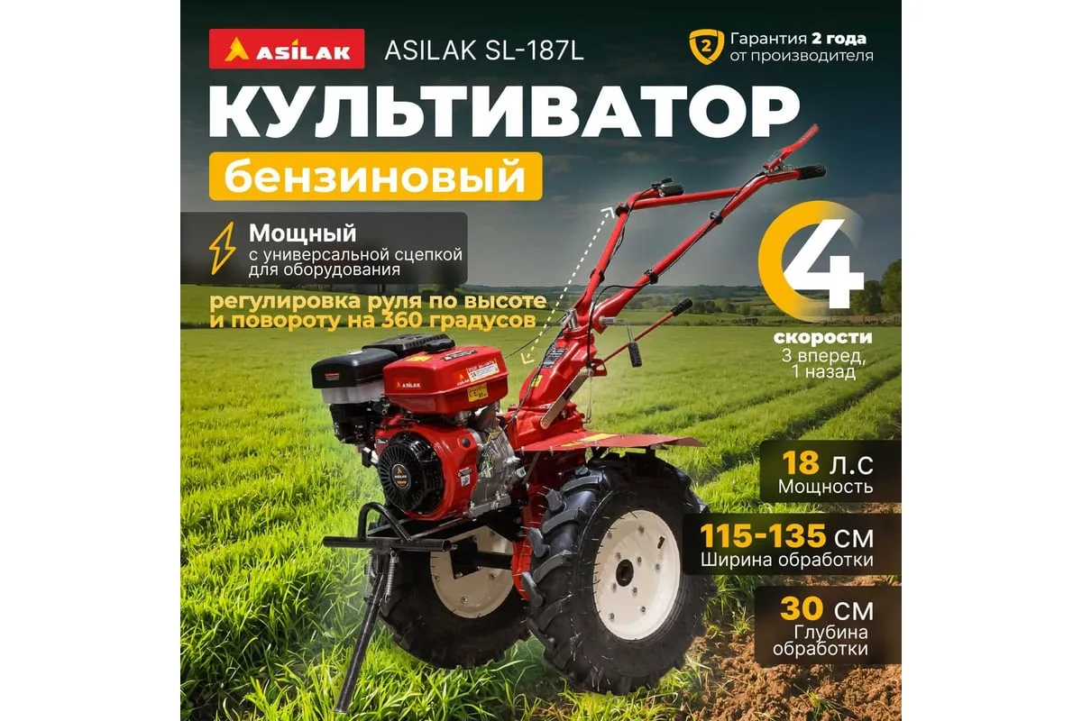 Бензиновый культиватор ASILAK SL-187L AS1556-2 - сельскохозяйственная машина для обработки и рыхления почвы в садах и на приусадебных участках. Имеет мощный бензиновый двигатель 18 л.с. Возможности выбора скорости делает машину более маневренной и эффективной, а наличие реверса поможет вытащить её в случае застревания в земле.