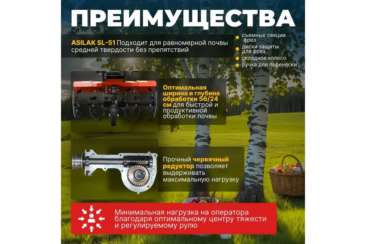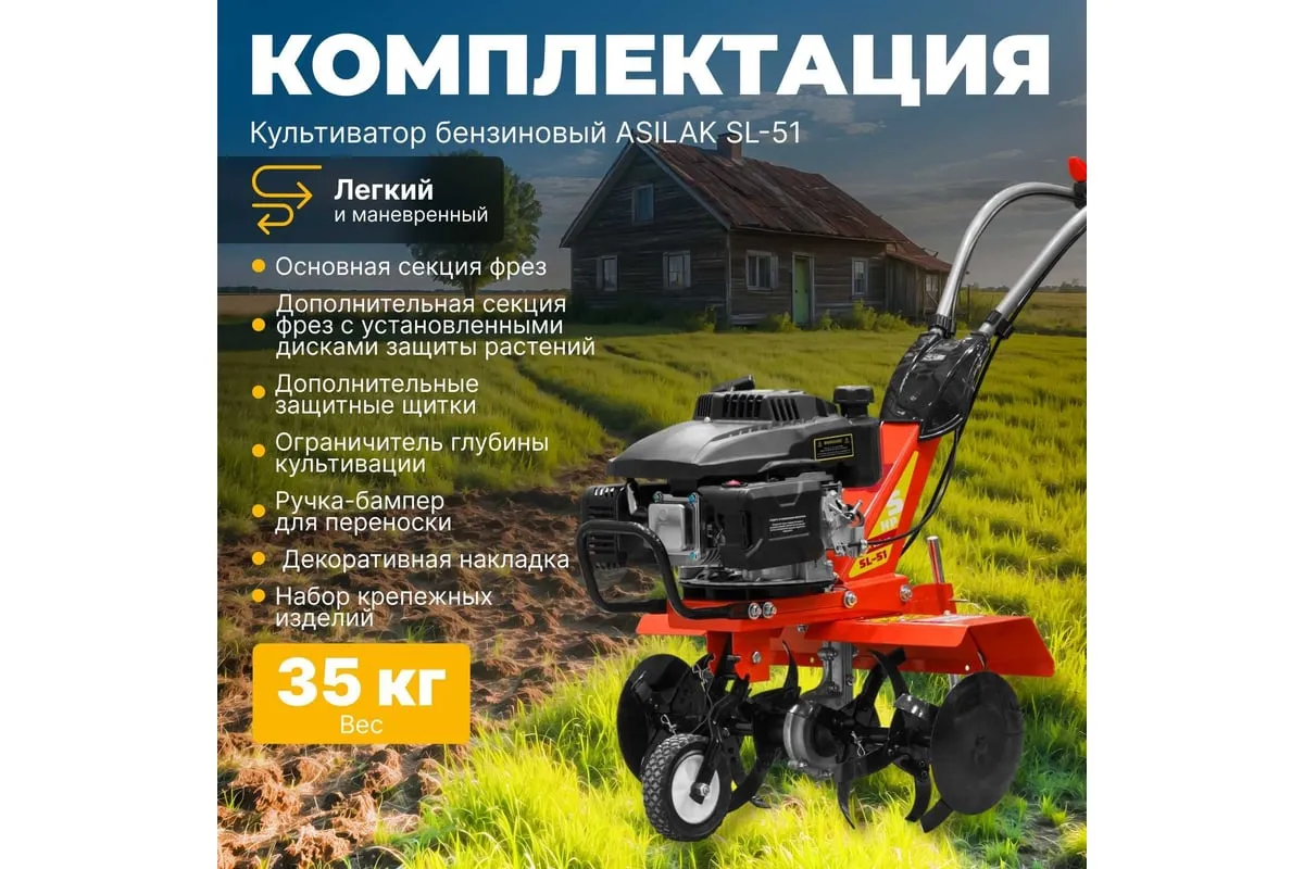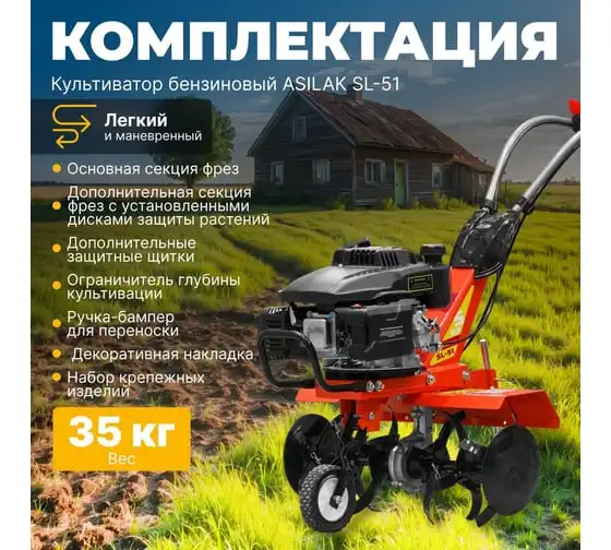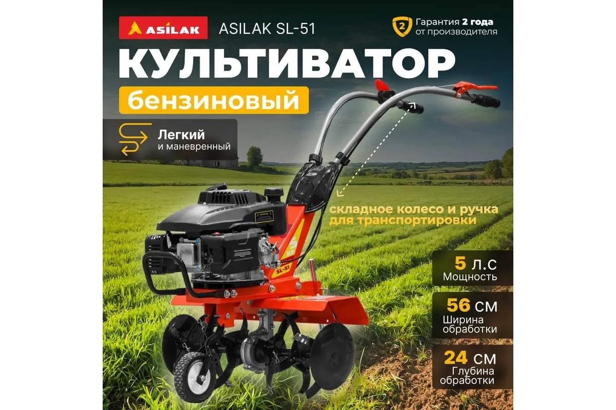 Бензиновый культиватор ASILAK SL-51 предназначен для обработки или культивации почвы на приусадебных участках, огородах. Регулируемый сошник дает возможность подобрать глубину культивации до 24 см. Легкая транспортировка. На корпусе культиватора расположен металлический кронштейн для удобной переноски. Резиновые накладки на рукояткахобеспечивают крепкий хвати удобство при управлении.