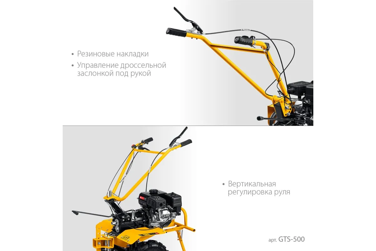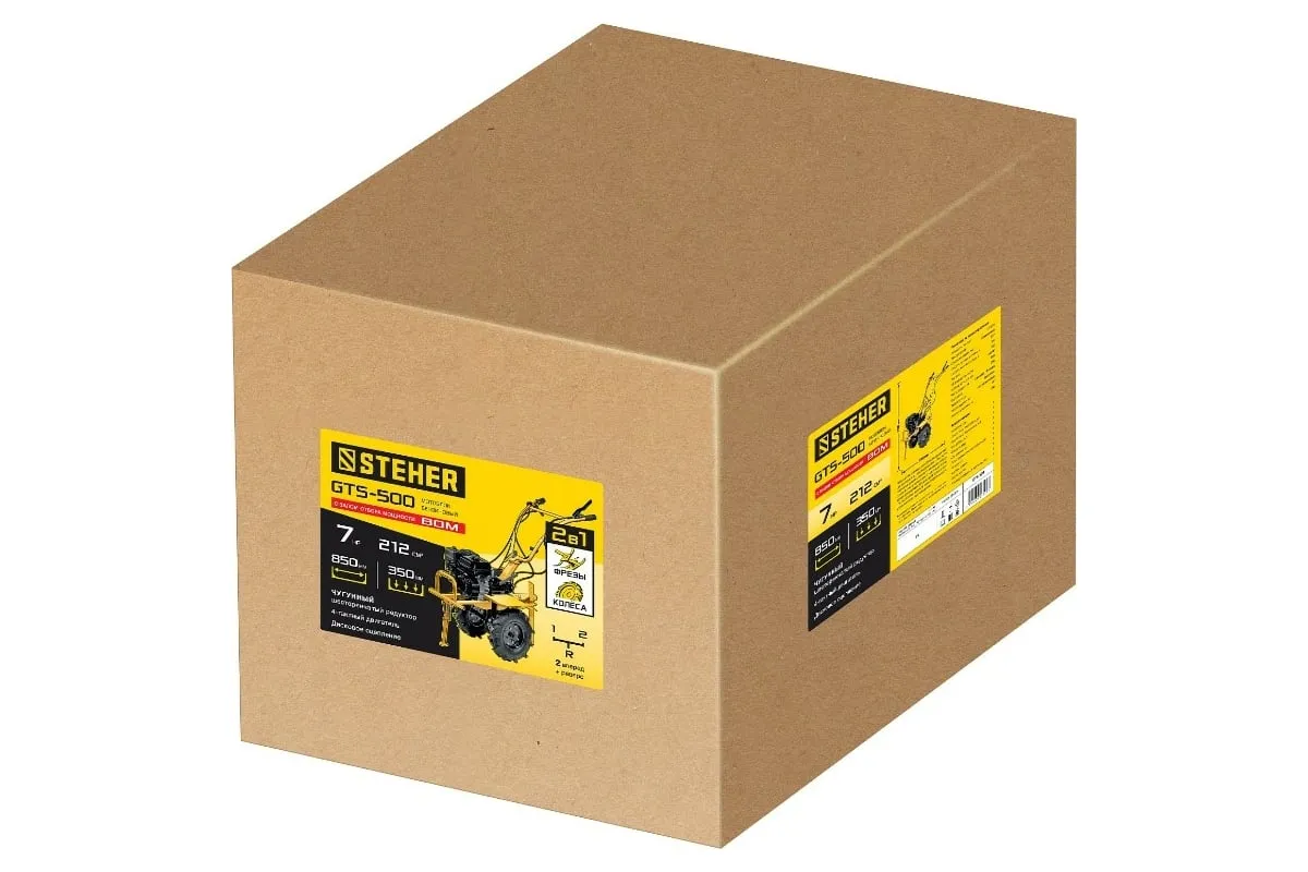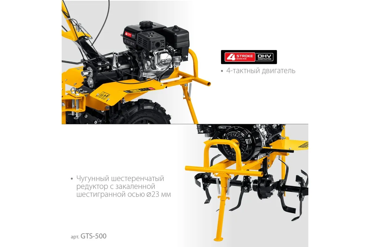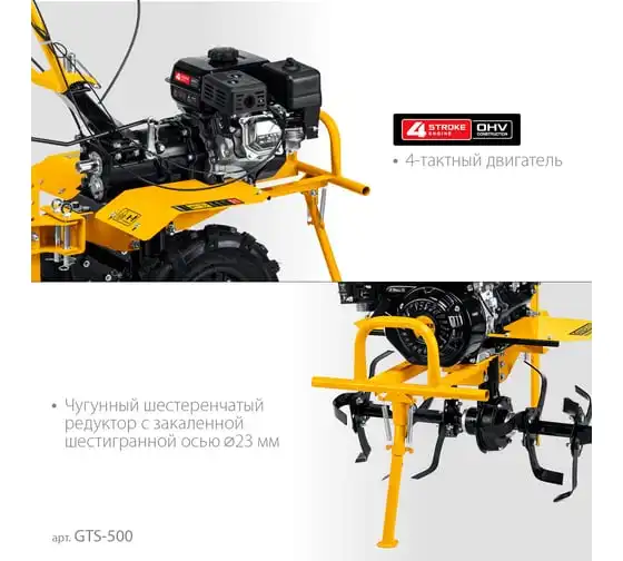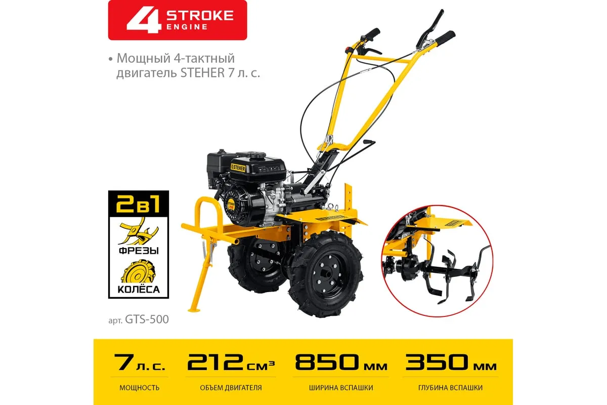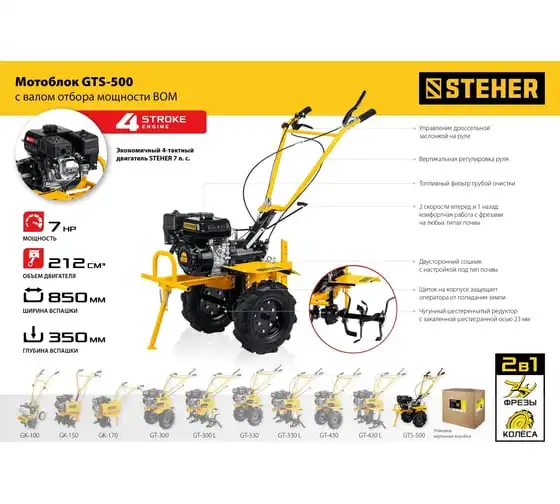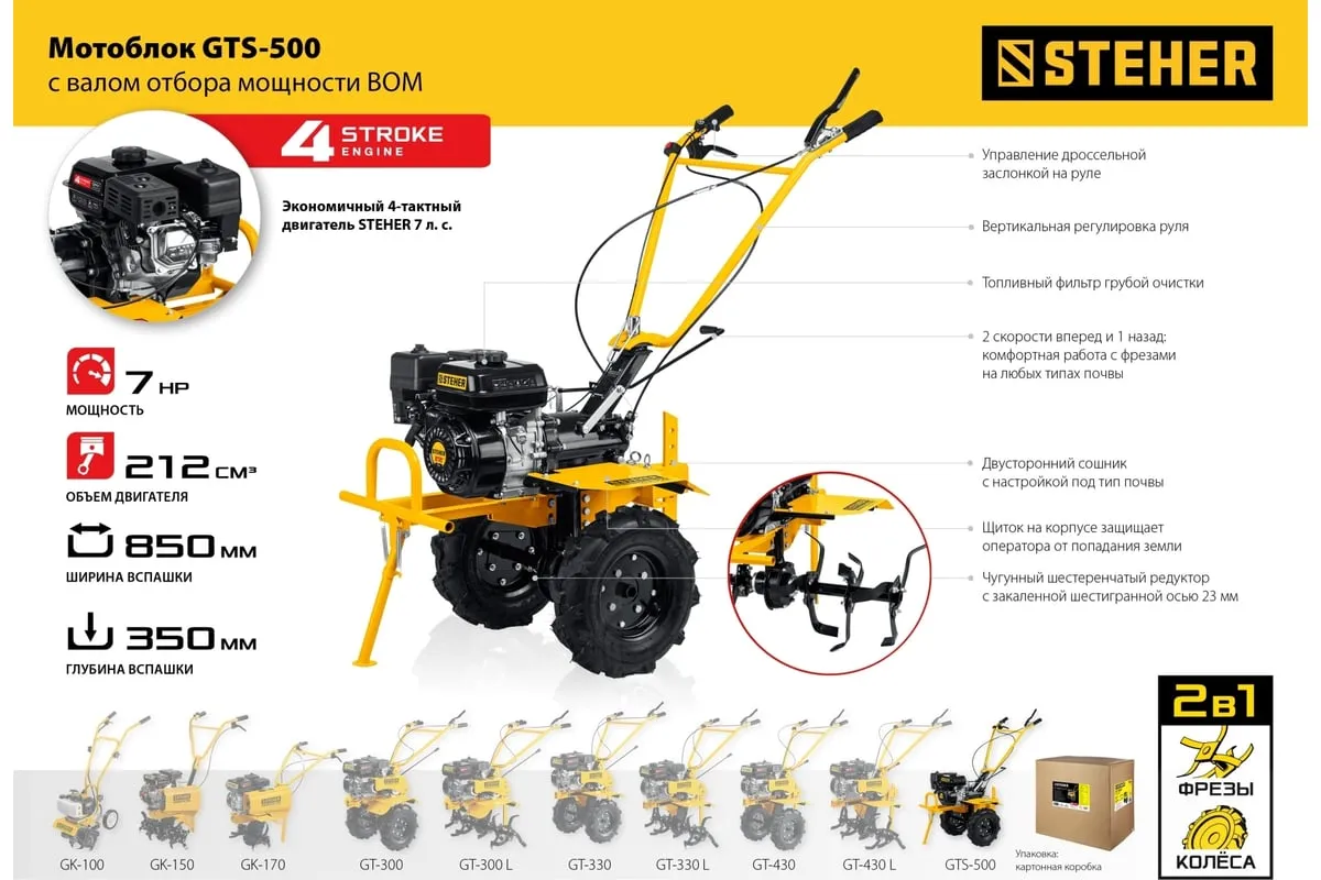 Бензиновый мотоблок с ВОМ STEHER GTS-500 предназначендля рыхления и культивации почвы на приусадебном участке.Мощный четырехтактный двигатель STEHER надежен в эксплуатации. Конструкция мотоблокапозволяет использовать его с различным навесным оборудованием.Две скорости вперед (понижающая, основная) и одна назад позволяют комфортно работать на любых типах почвы. Рукоять мотоблока с возможностью регулировки по вертикали и горизонтали делает управление более комфортным. Регулируемый сошник надежно фиксируется к раме мотоблока и отвечает за регулировку глубины вспашки. Закаленные фрезы прекрасно закапываются на полную глубину и способствуют продвижению мотоблока вперед.