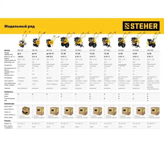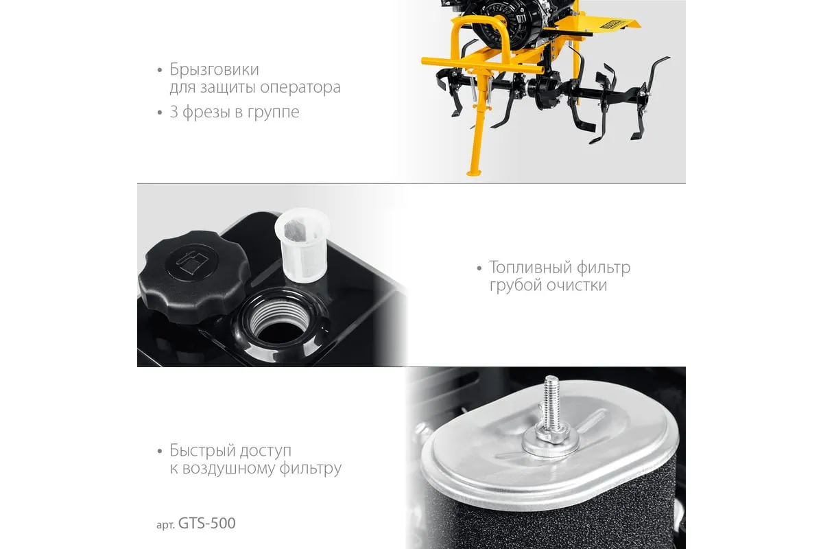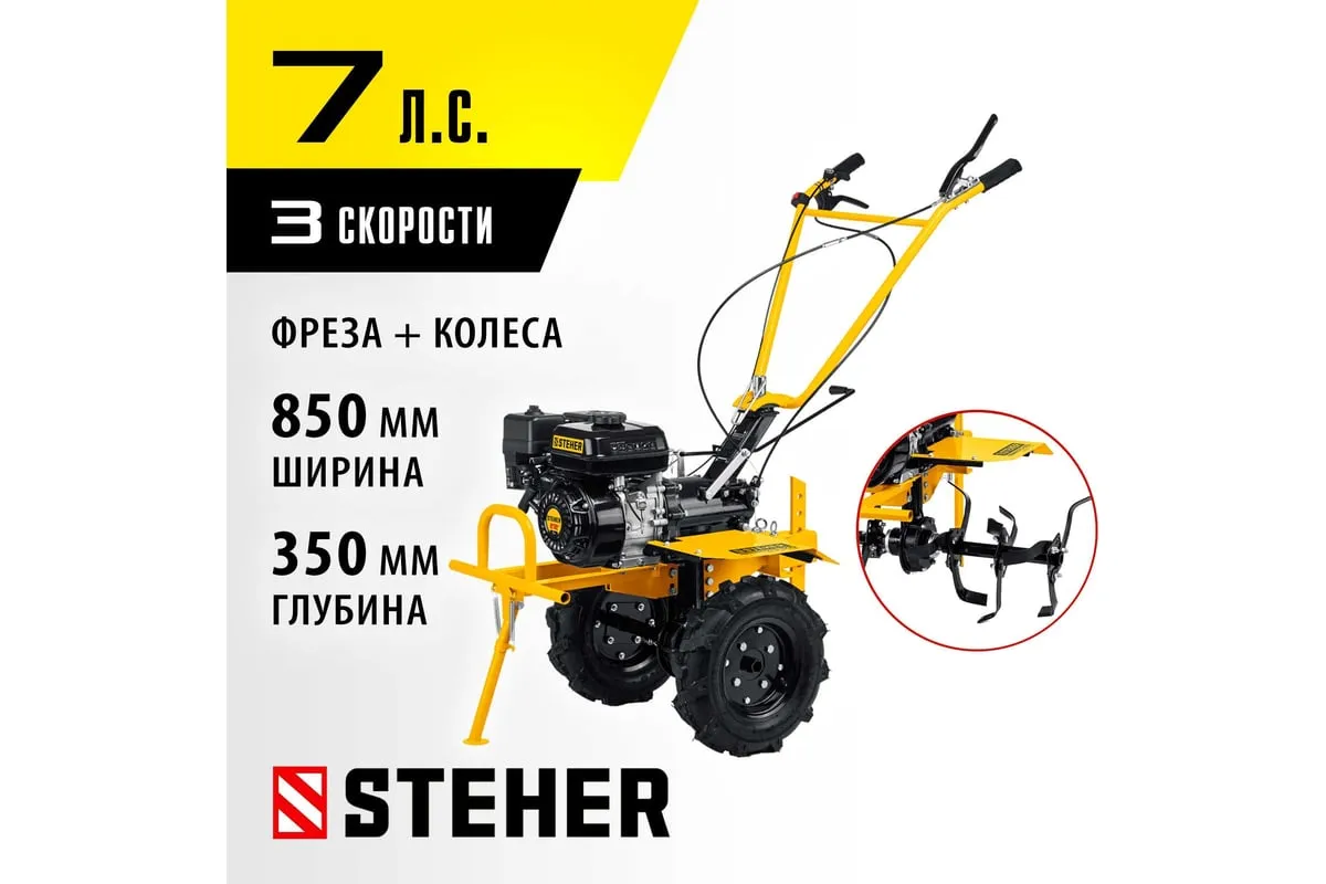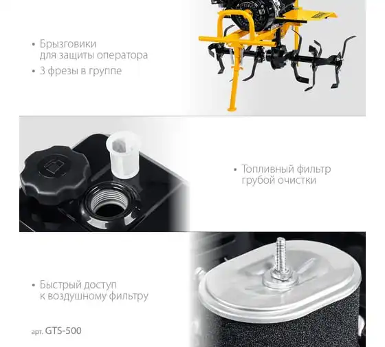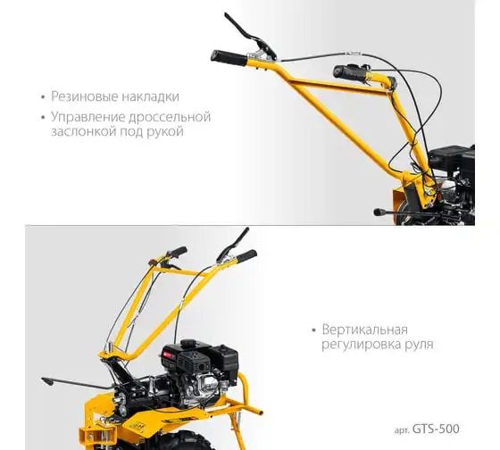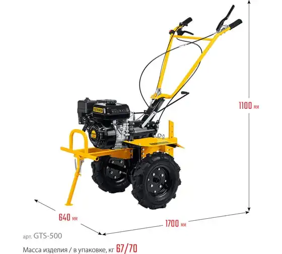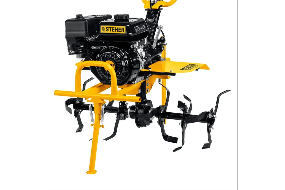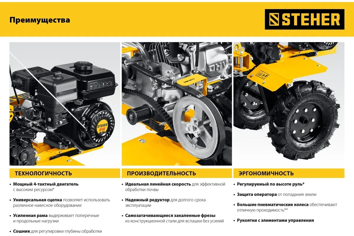 Бензиновый мотоблок с ВОМ STEHER GTS-500 предназначендля рыхления и культивации почвы на приусадебном участке.Мощный четырехтактный двигатель STEHER надежен в эксплуатации. Конструкция мотоблокапозволяет использовать его с различным навесным оборудованием.Две скорости вперед (понижающая, основная) и одна назад позволяют комфортно работать на любых типах почвы. Рукоять мотоблока с возможностью регулировки по вертикали и горизонтали делает управление более комфортным. Регулируемый сошник надежно фиксируется к раме мотоблока и отвечает за регулировку глубины вспашки. Закаленные фрезы прекрасно закапываются на полную глубину и способствуют продвижению мотоблока вперед.