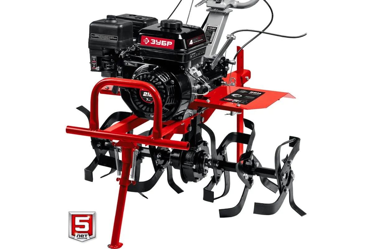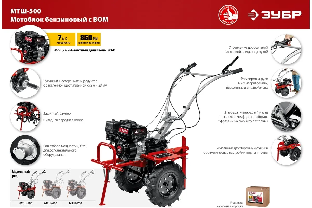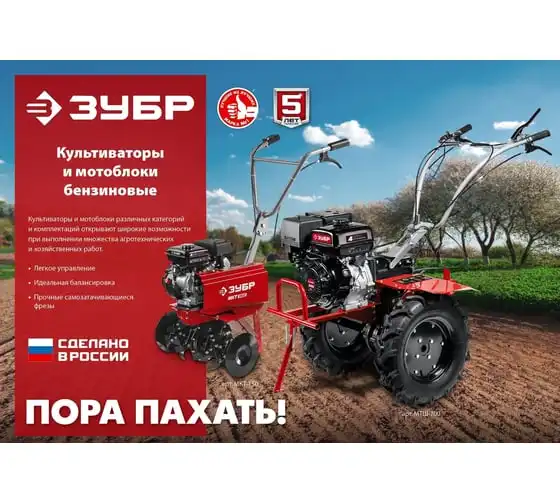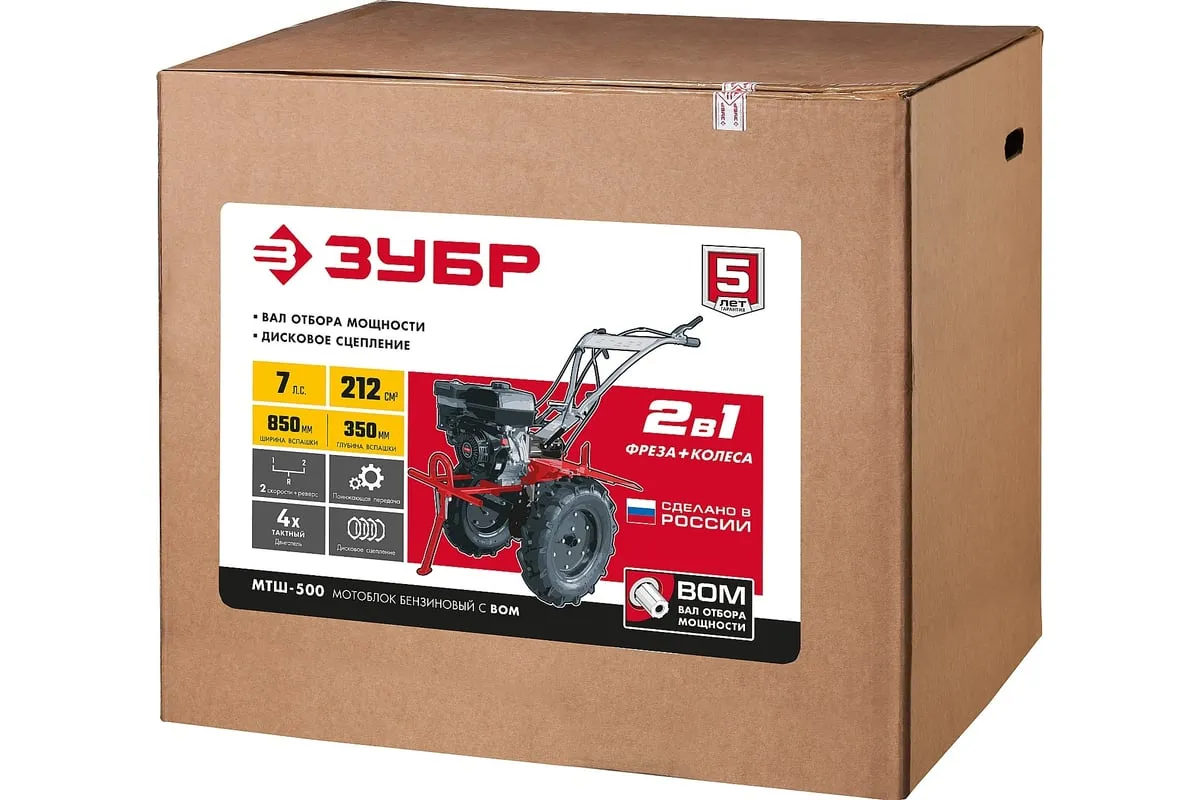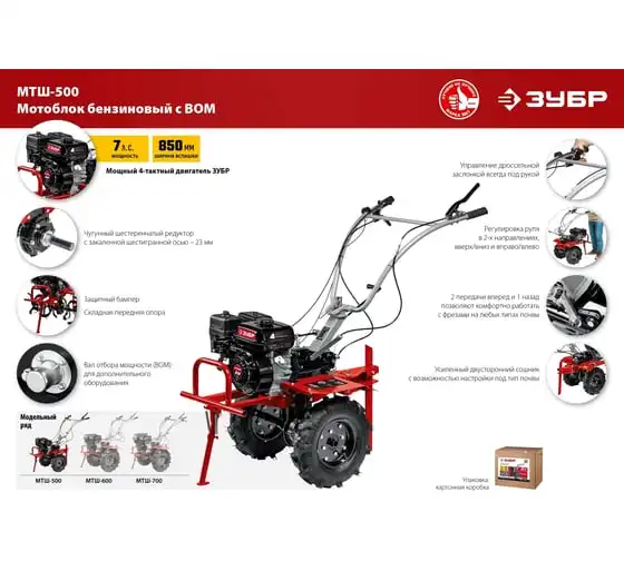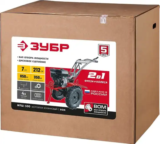 Бензиновый мотоблок с ВОМ ЗУБР 212 см3 МТШ-500 – мощная модель для обработки и возделывания земли. Благодаря наличию вала отбора мощности мотоблокобладает широким спектром применения. Вместительный топливный бакобеспечивает продолжительную работуи позволяет сократить частоту перерывов для дозаправки. Для устойчивости машины в нерабочем состояниипредусмотренна складная передняя опора. Колеса большого диаметра с глубоким рисунком протектораобеспечивают отличную проходимостьпо любой поверхности, в том числе, и с неровным ландшафтом. 2 скорости вперед (понижающая, основная) и 1 назад позволяют комфортно работать на любых типах почвы.