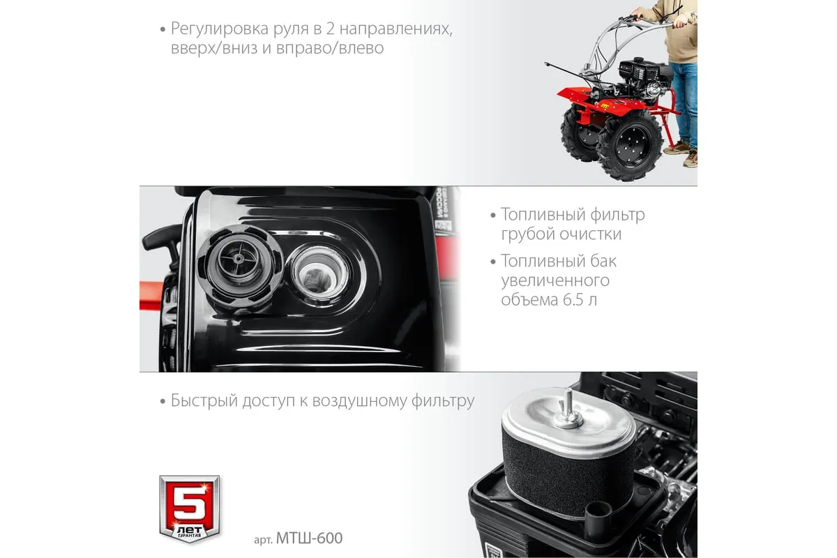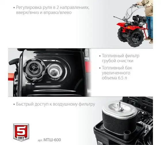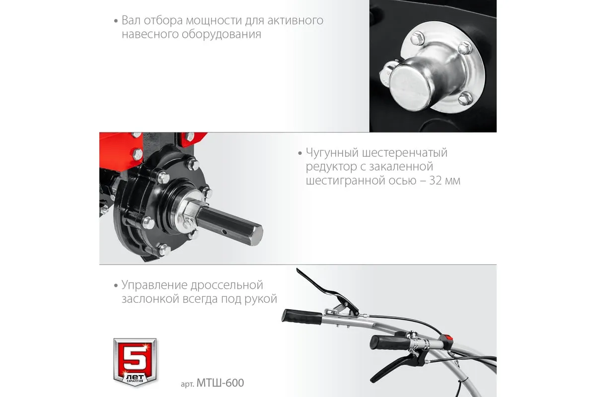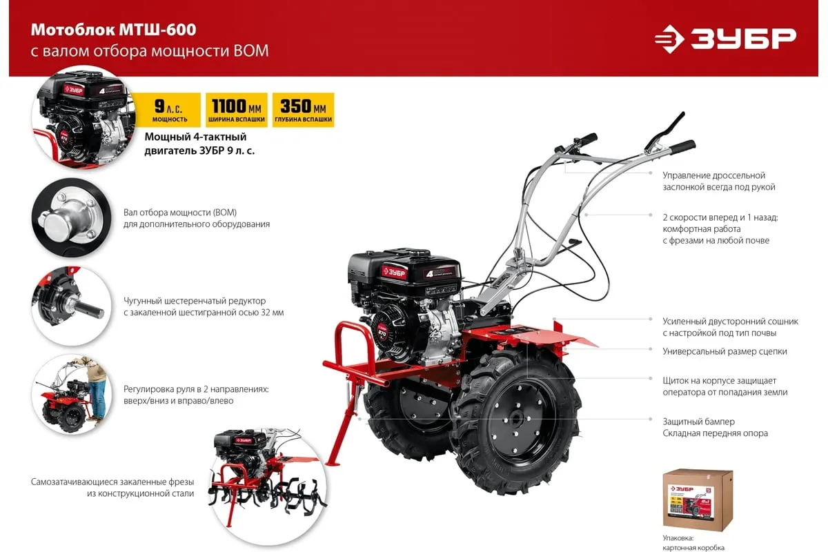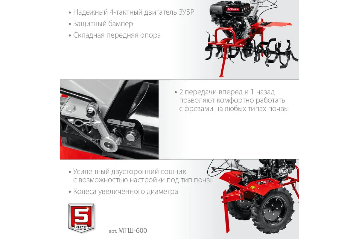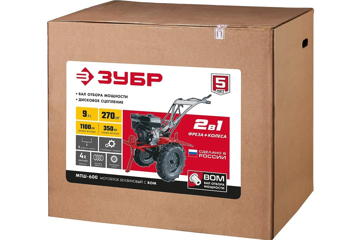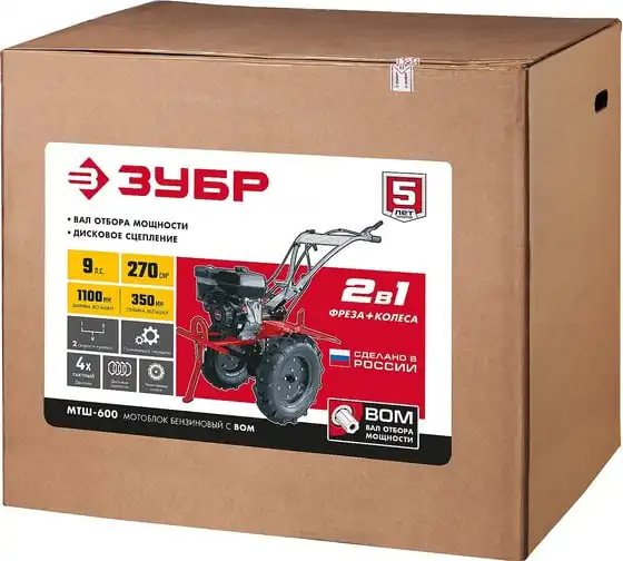 Бензиновый мотоблок с ВОМ ЗУБР 270 см3 МТШ-600 – высокопроизводительная машина,отличается надежностью и хорошей управляемостью. Предназначен для возделывания любого типа почвы. Вал отбора мощности позволяет использовать модель совместно с различным дополнительным оборудованием, чтообеспечивает широкий спектр применения мотоблока. Колеса увеличенного диаметра с глубоким протекторомгарантируют отличную проходимостьпо любой поверхности, в том числе, и с неровным ландшафтом. 2 скорости вперед (понижающая, основная) и 1 назад позволяют комфортно работать на любых типах почвы.