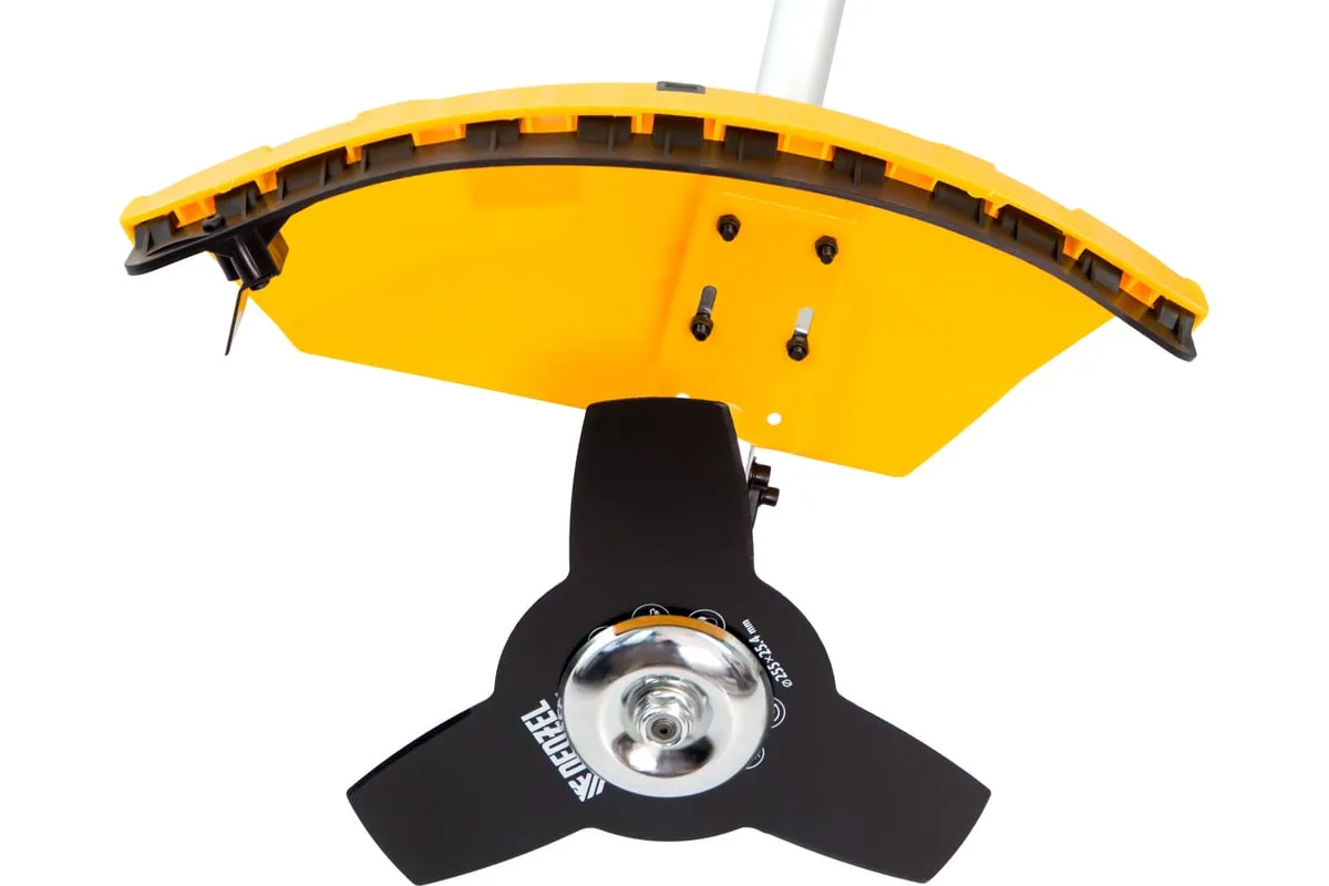 В комплект поставки входит 2 насадки: трехлопастной нож и леска, ширина скашивания составляет 25.5 см и 42 см.