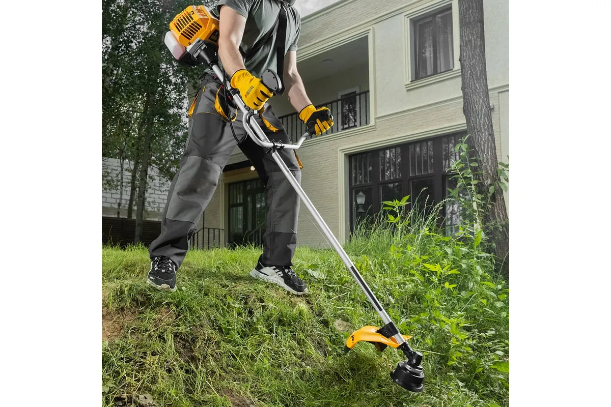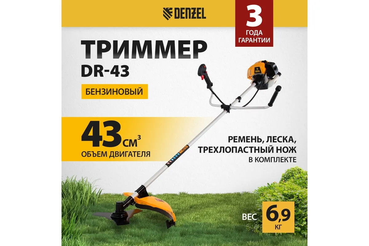 Бензиновый триммер Denzel DR-43 96273 предназначен для скашивания мелкой, густой и слежавшейся травы, формирования границ газона, подравнивания молодого кустарника и спиливания побегов деревьев. Им удобно пользоваться в самых труднодоступных местах: на овражках, вокруг деревьев, вдоль стен и заборов.
