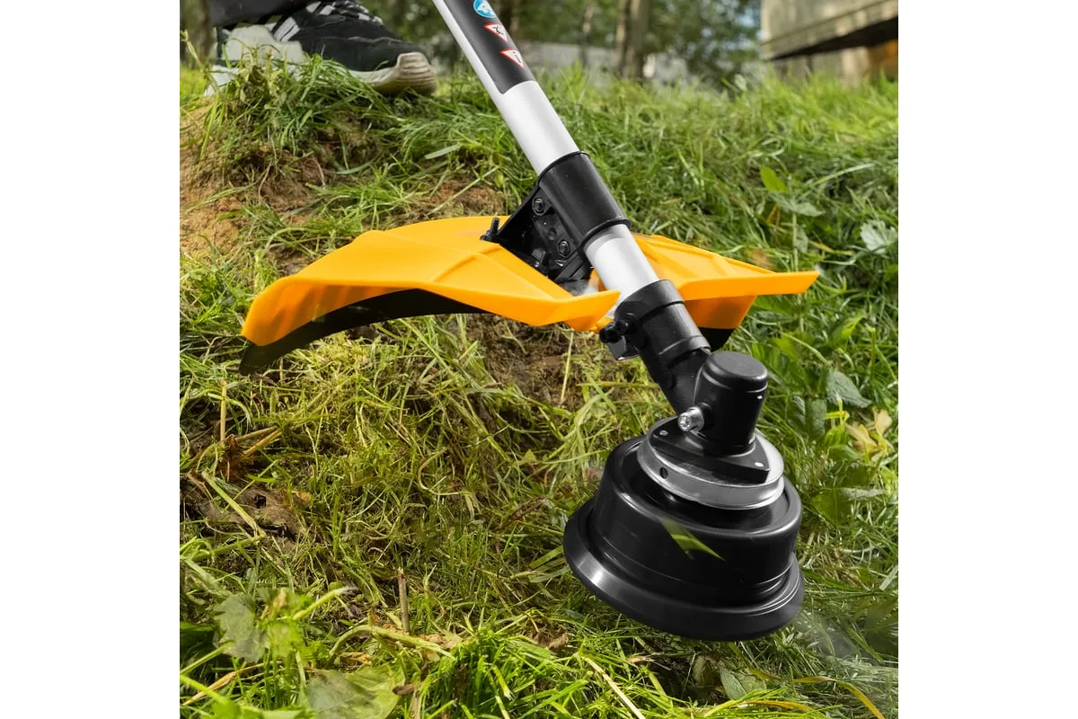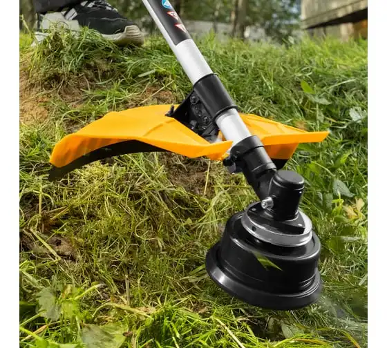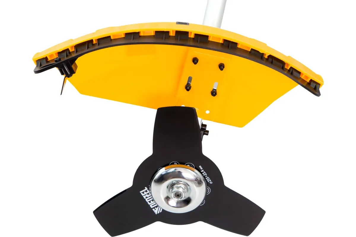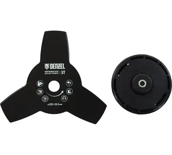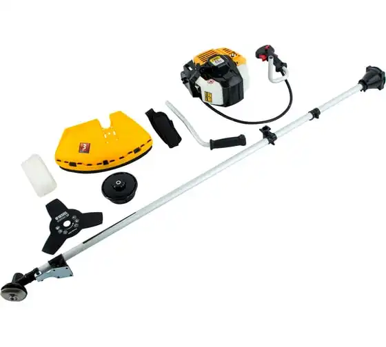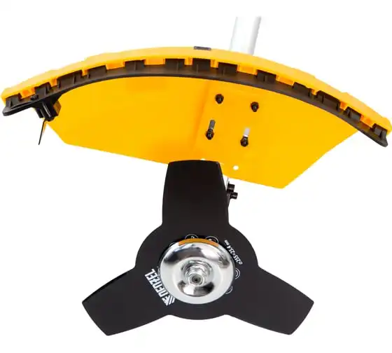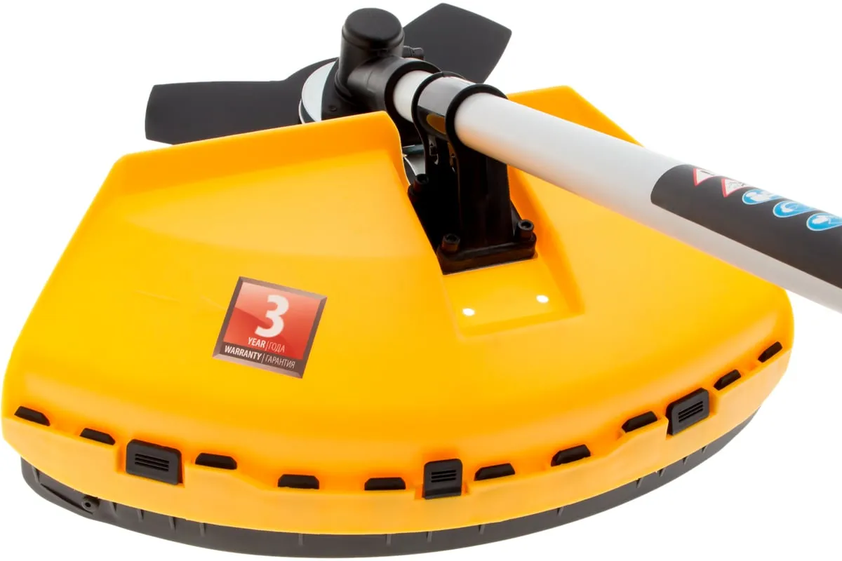 Благодаря мощности 2.5 л.с. частота вращения оснастки составляет 9500 об/мин. К триммеру прилагаются две насадки: трехлопастной нож (ширина скашивания 25.5 см) и катушка с леской (42 см).