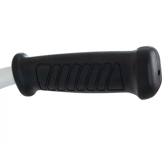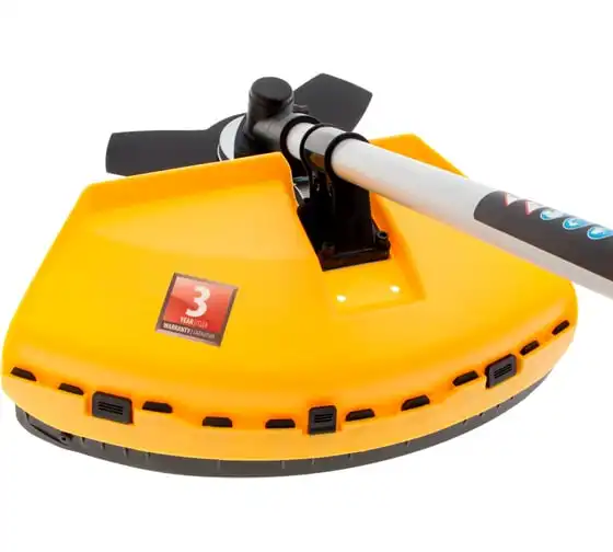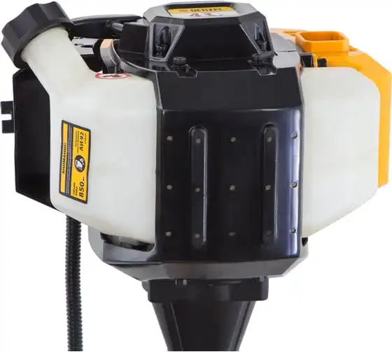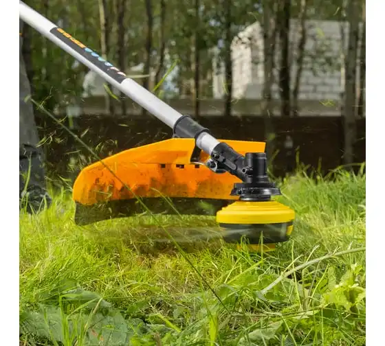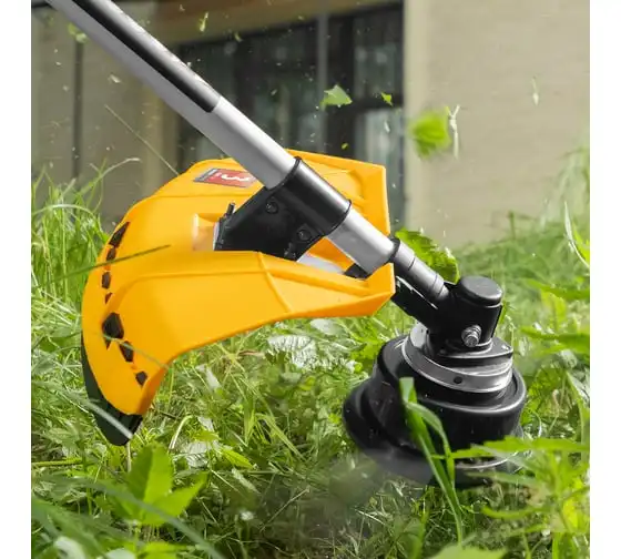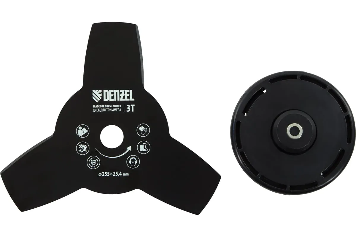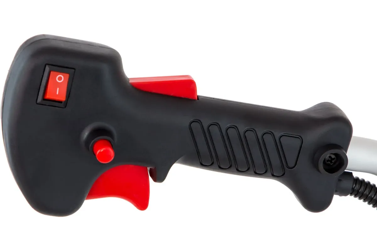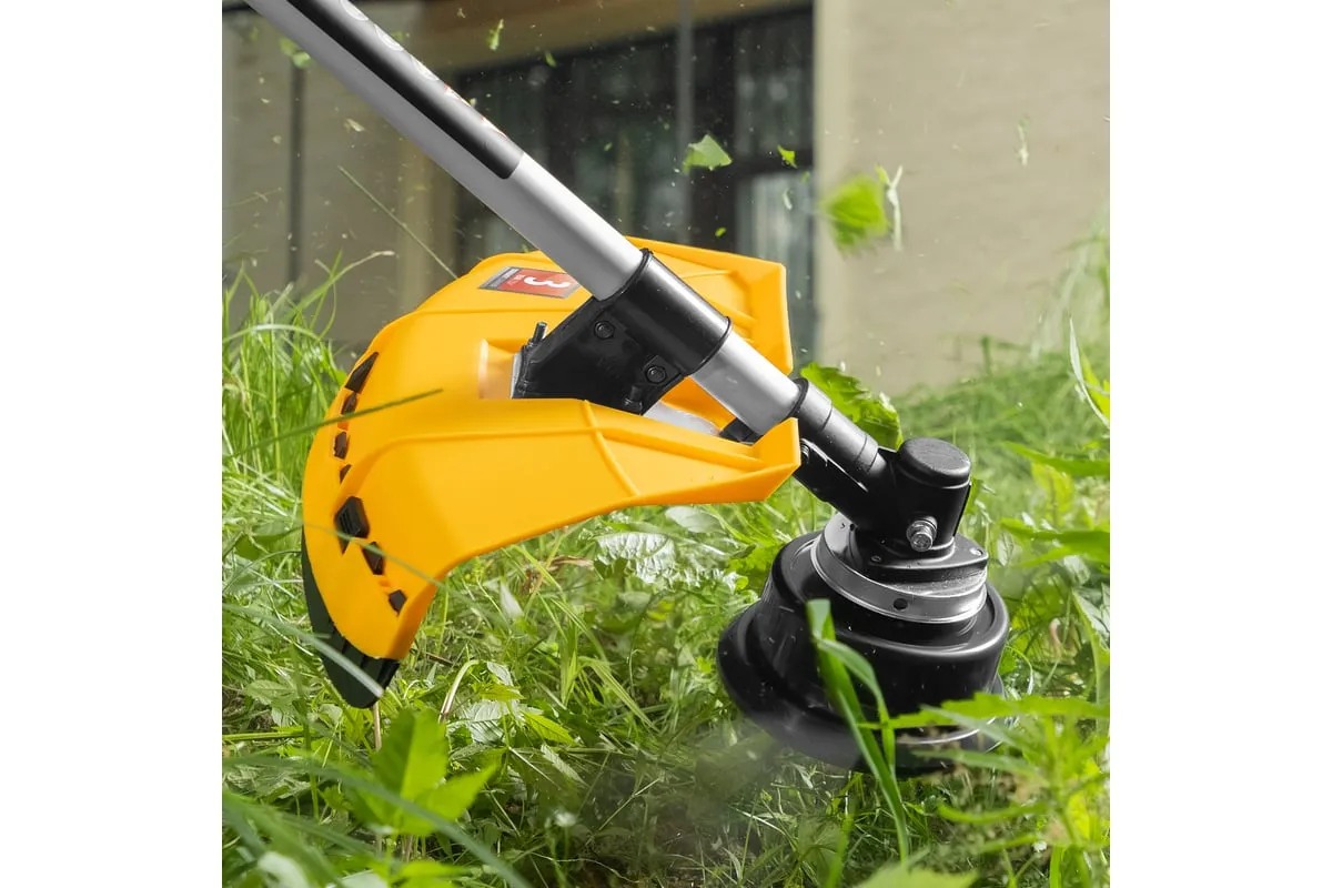 Благодаря мощности 2.5 л.с. частота вращения оснастки составляет 9500 об/мин. К триммеру прилагаются две насадки: трехлопастной нож (ширина скашивания 25.5 см) и катушка с леской (42 см).