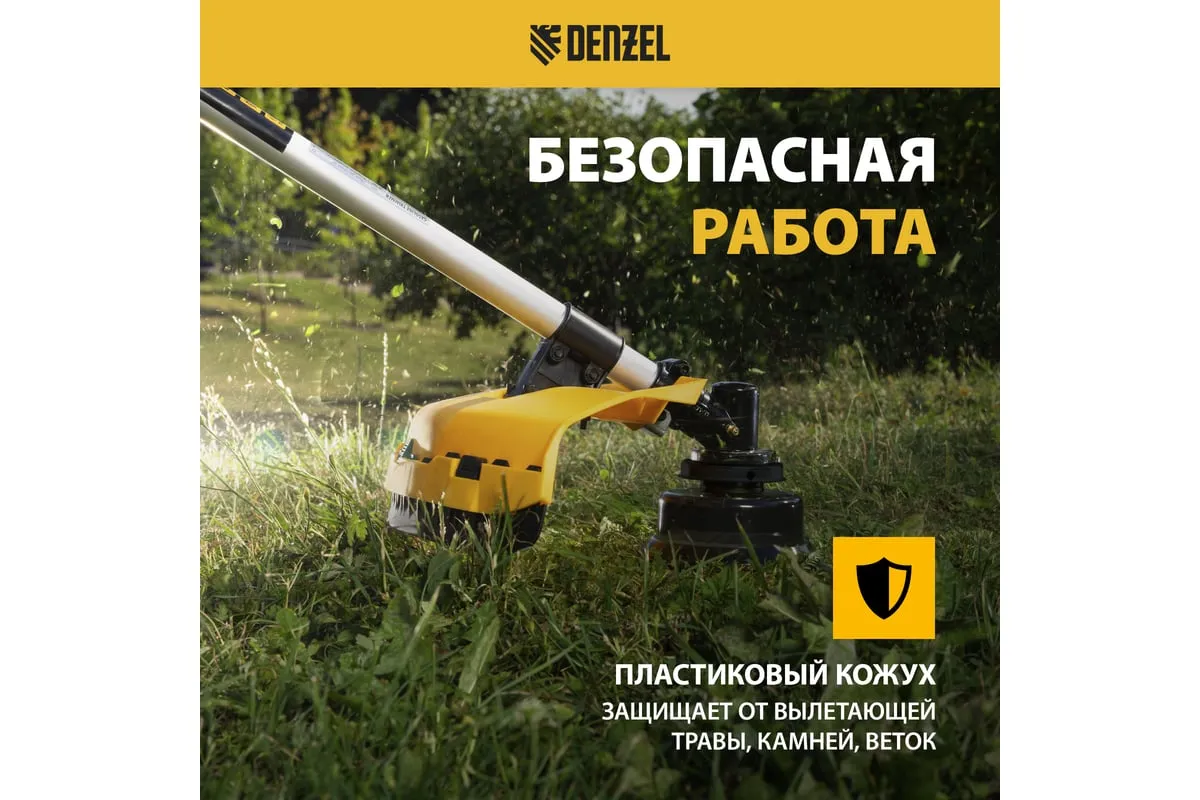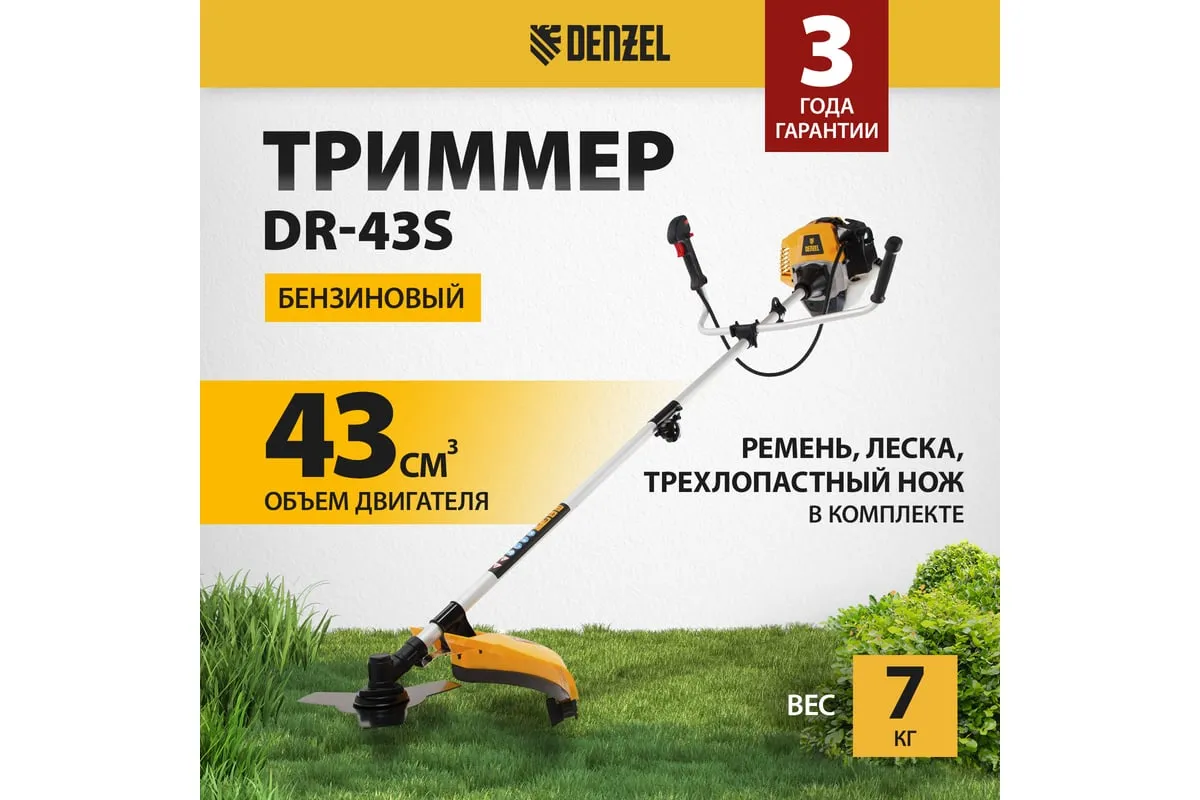 Бензиновый триммер Denzel DR-43S 96274 идеально подходит для бытового применения: скашивания бурьяна, редкой травы и сорняков, облагораживания газонов, подравнивания молодых кустарников. Им удобно работать в местах, недоступных для газонокосилки: вдоль заборов и стен дома, вокруг деревьев, на холмистой поверхности. А также его можно использовать сразу после дождя.
