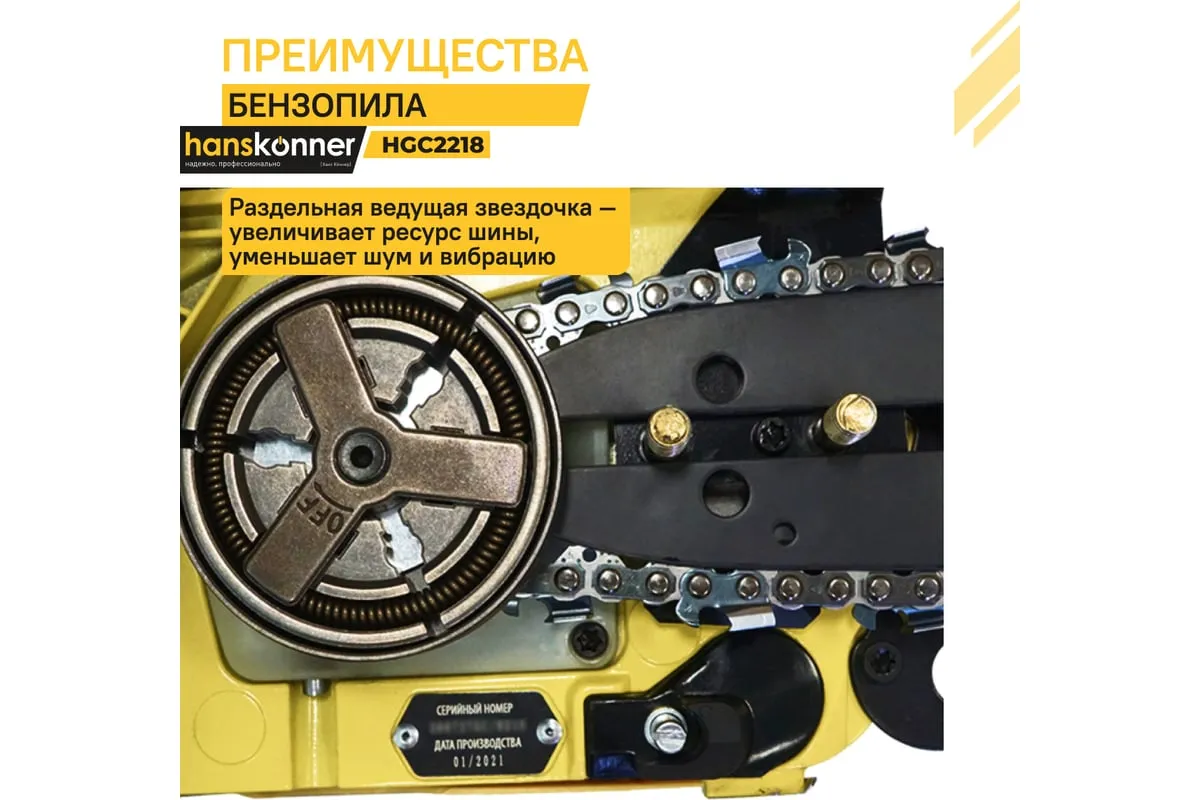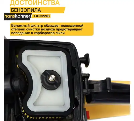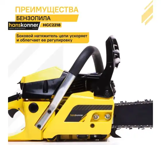 Бензопила Hanskonner 18" HGC2218 используется для заготовки дров, валки деревьев, а также распиловки древесины при проведении строительных и ремонтных работ. Система стабилизации двигателяобеспечивает достаточную производительностьв широком диапазоне оборотов и мгновенное ускорение цепи для более эффективного пиления. При нажатии на защитный щиток срабатывает тормоз, останавливающий пильную цепь практически моментально, чтогарантирует безопасность в процессе работы.