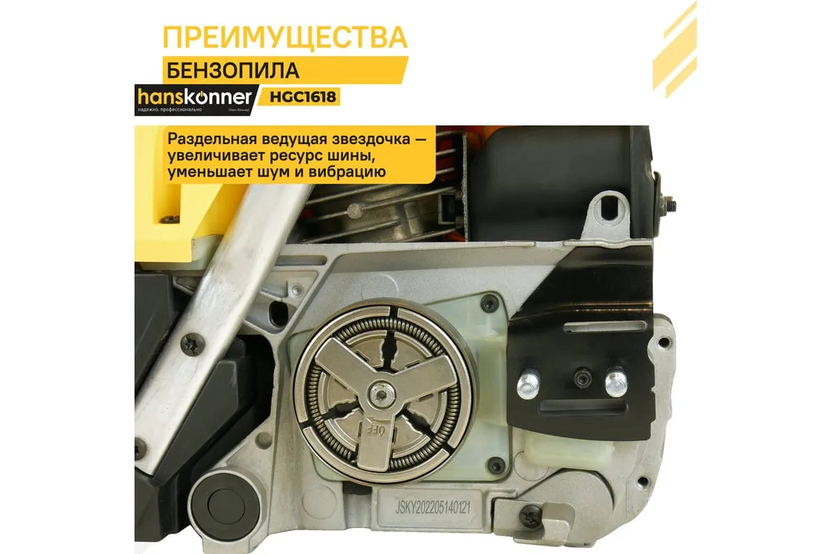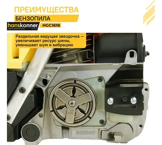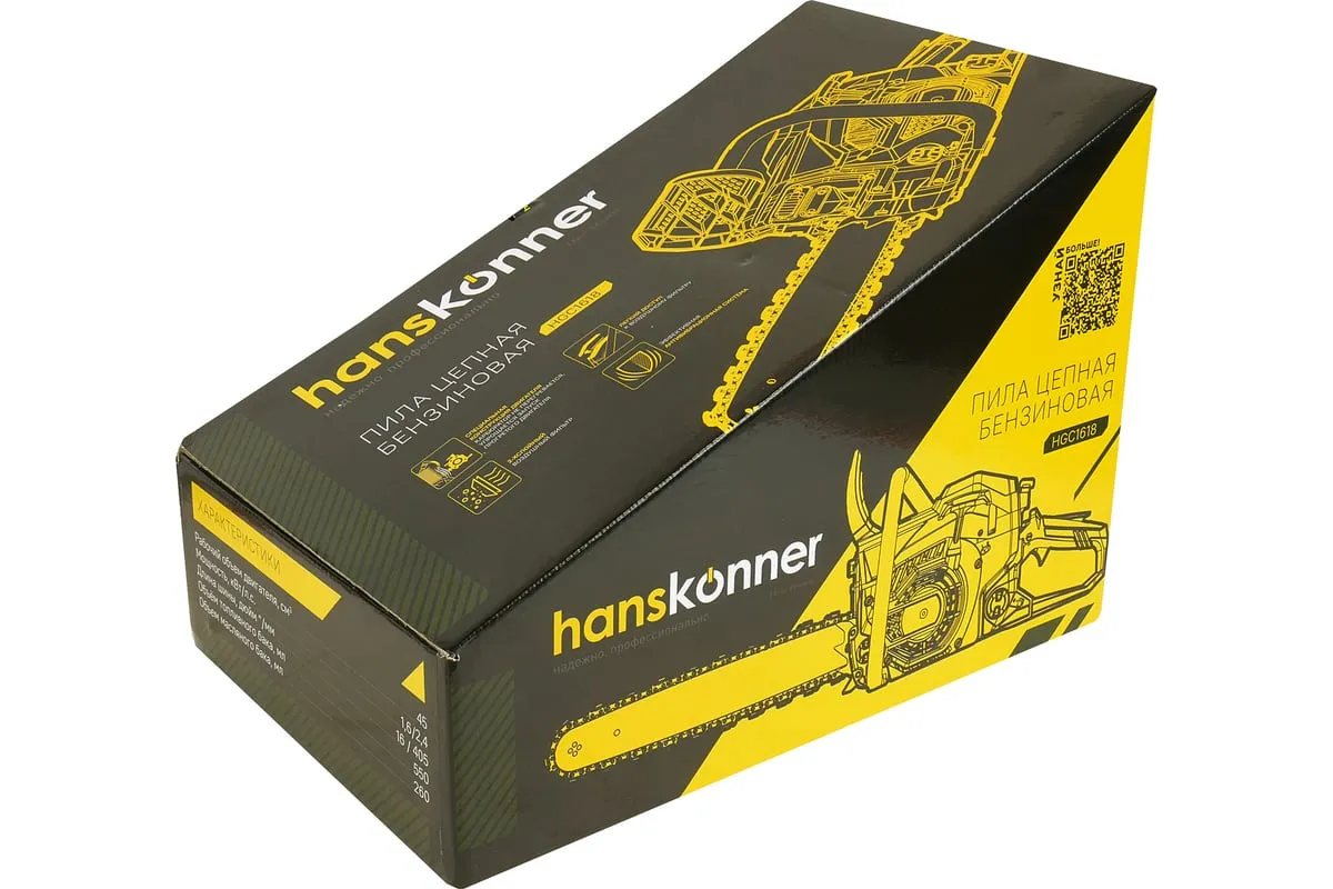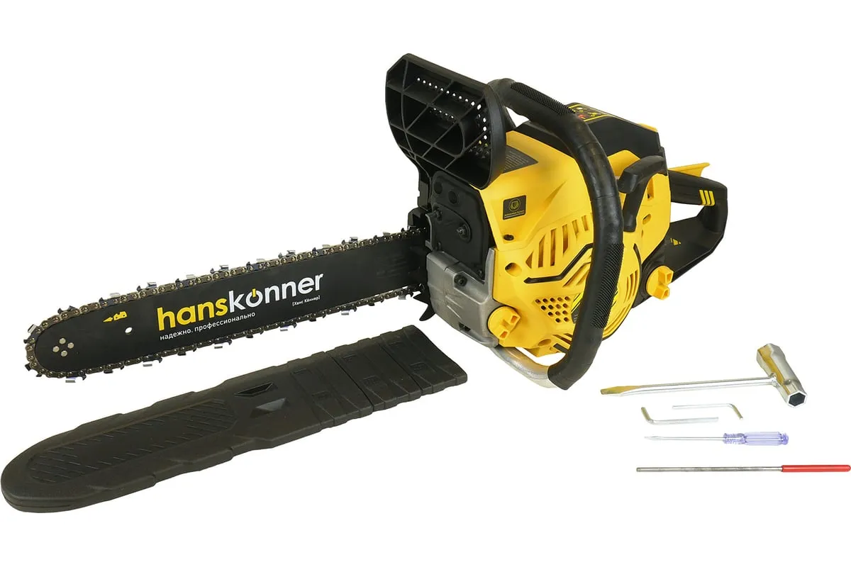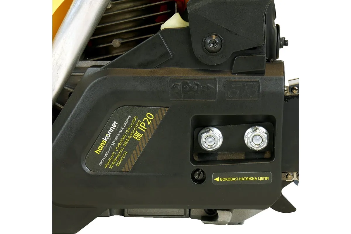 Бензопила Hanskonner HGC1618 подходит для выполнения внутрихозяйственных работ и удобна для ухода за деревьями. Верхнее расположение основной ручки позволяет оператору легко управлять бензопилой даже находясь на высоте. Эргономичное расположение рукояток относительно центра тяжести делает инструмент удобным и хорошо сбалансированными, чтопозволяет комфортно контролироватьего в любых ситуациях. Безопасность работыобеспечивается предохранительной клавишей, предотвращающей случайное нажатие газа, ограничителем цепи, защитным щитком для правой руки, а также цепным тормозом, активируемым принудительно либо силой инерции. Два способа активации тормоза цепи повышают безопасность труда. Дополнительно предусмотрен праймер подкачки топлива, чтобы обеспечить возможность завести холодный мотор бензопилы в сложных условиях.