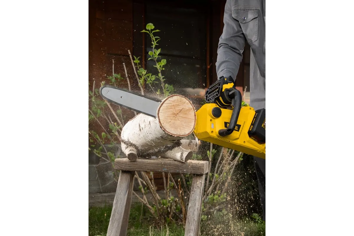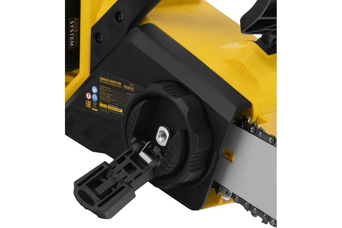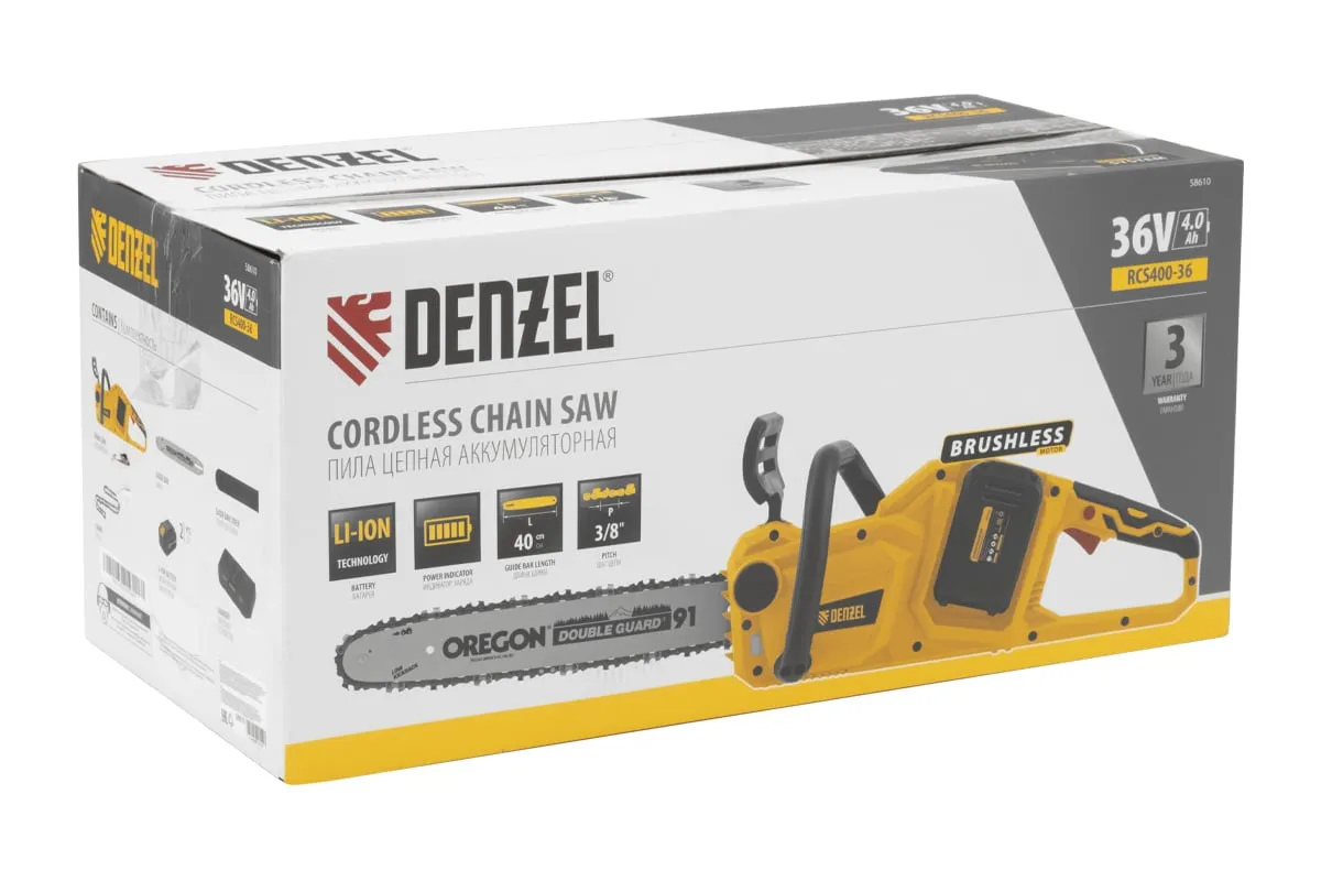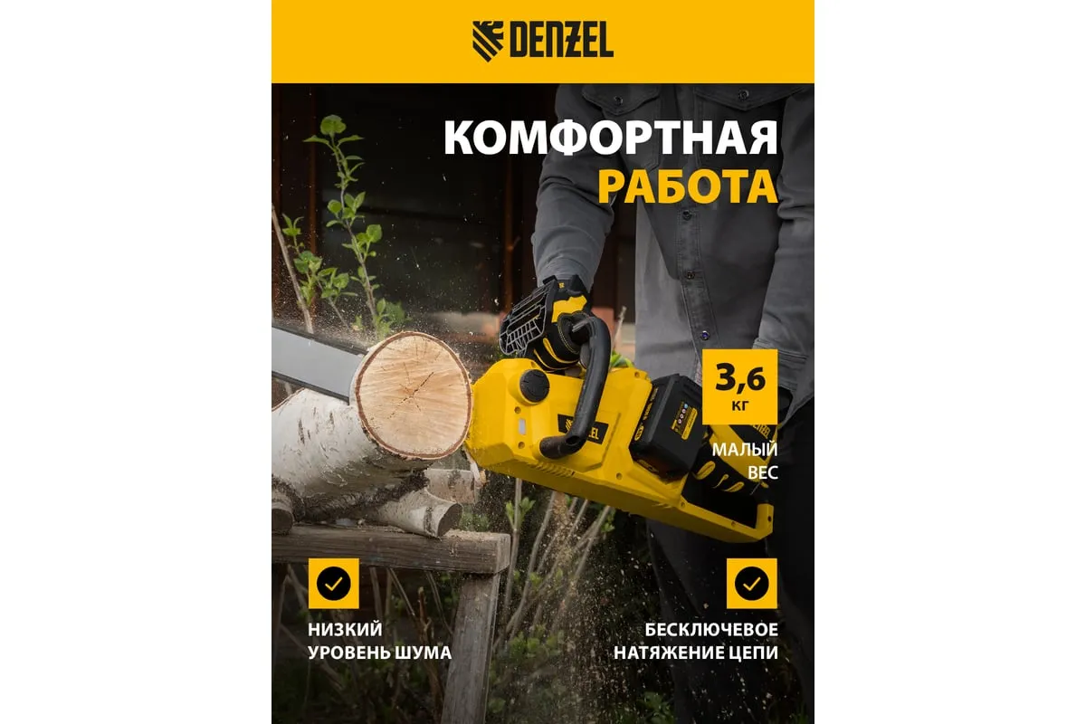 Бесщеточная цепная аккумуляторная пила DENZEL RCS400-36 58610 применяется для валки деревьев и заготовки дров.