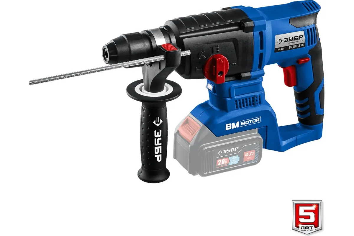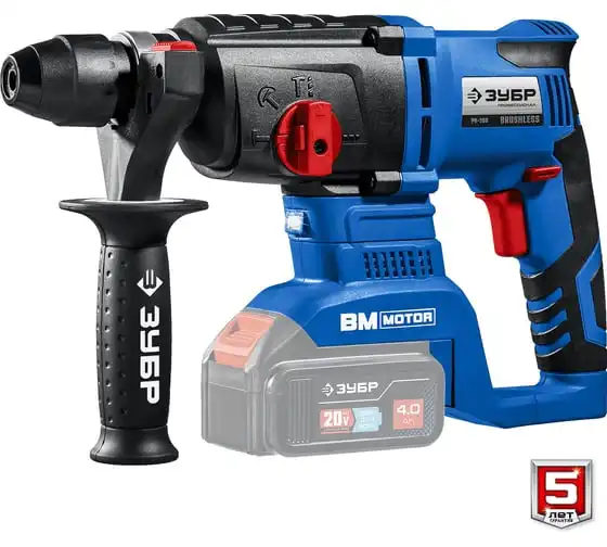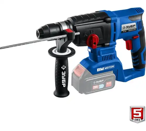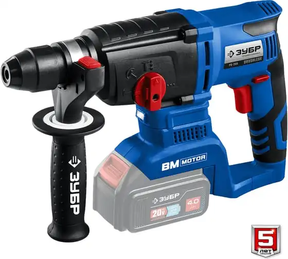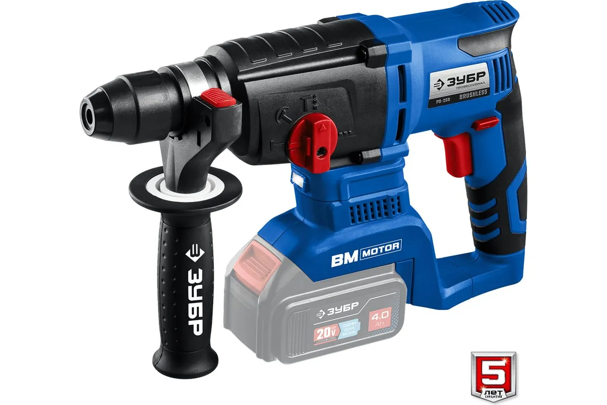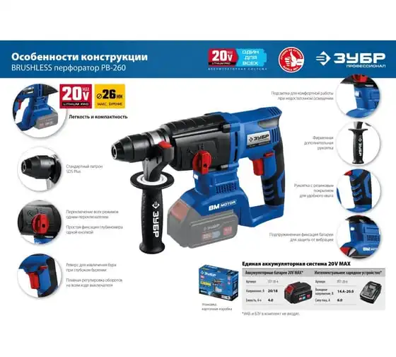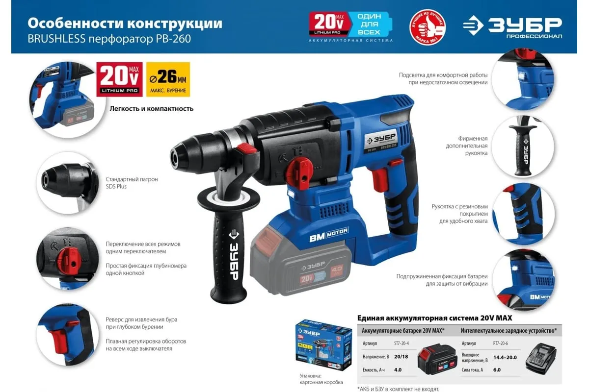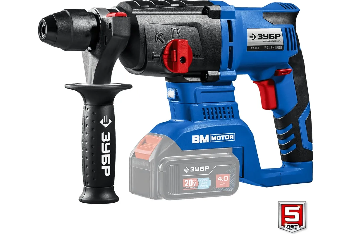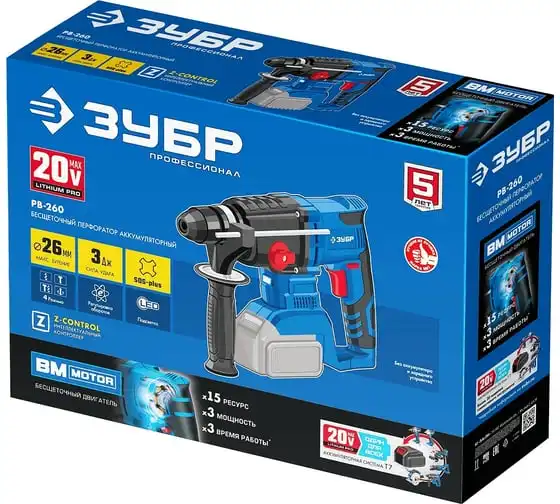Бесщеточный перфоратор ЗУБР Профессионал 20В PB-260 предназначен для сверления отверстий в различных материалах (дерево, сталь, бетон, кирпич и т. д.) в режимах сверления и сверления с ударом, а также ударного долбления при установке соответствующего инструмента. Большой диаметр и высокая скорость бурениядля максимальной производительности. Функции долбления и сверления без удара придают дополнительную функциональность. Патрон SDS-Plusдля быстрой замены расходного инструмента. Бесщеточный двигатель обладает целымрядом преимуществпо сравнению с обычным щеточным двигателем: