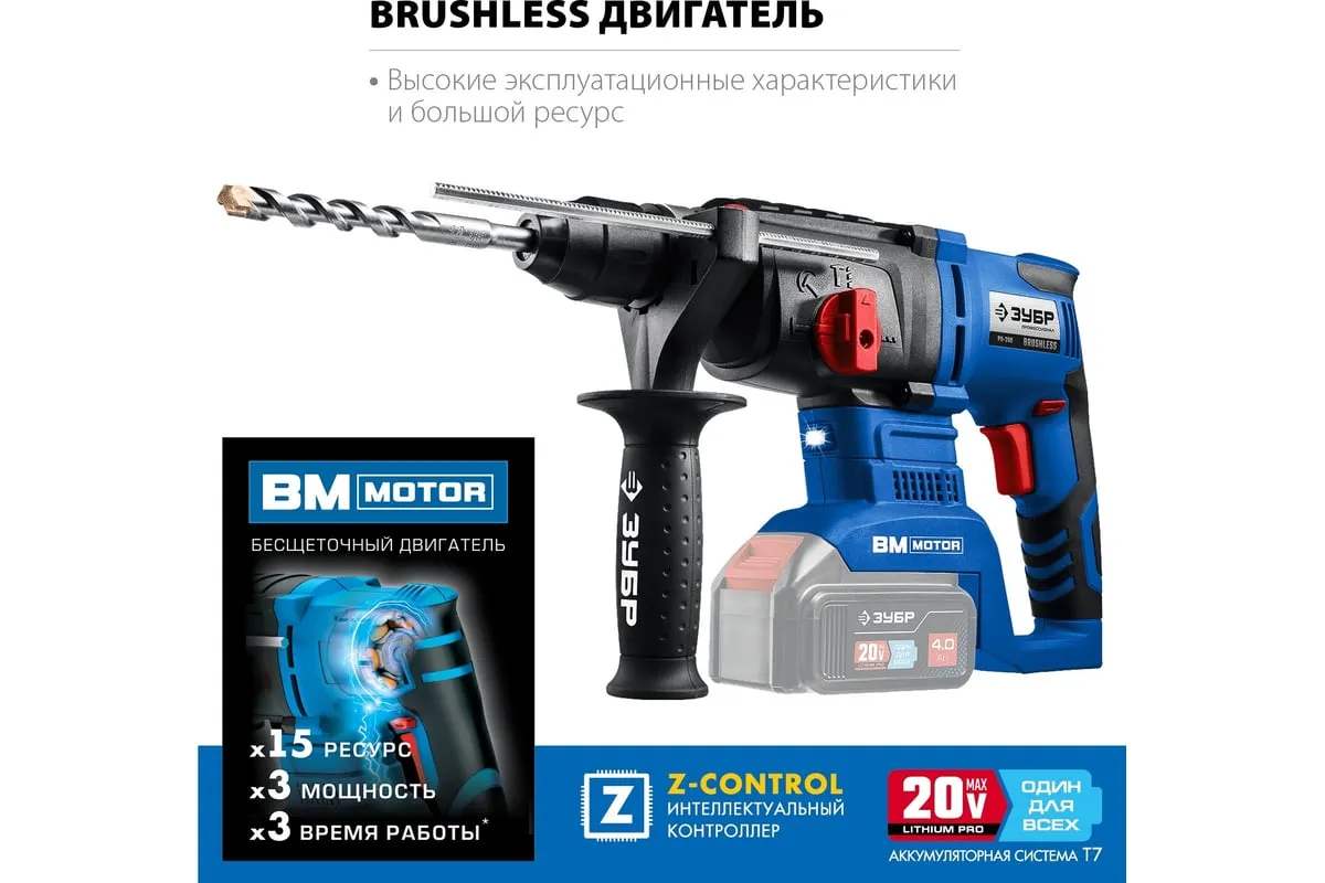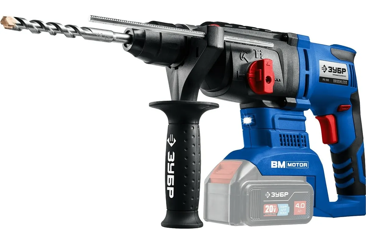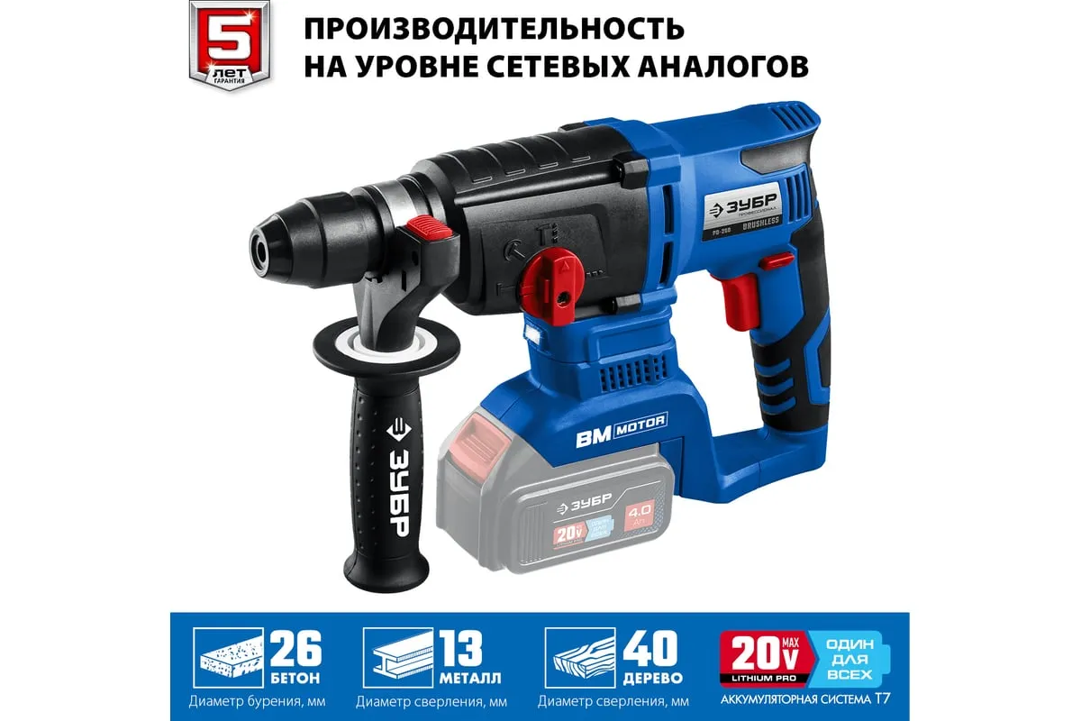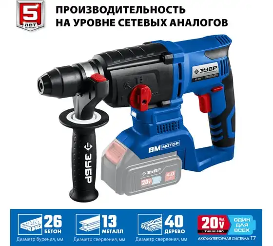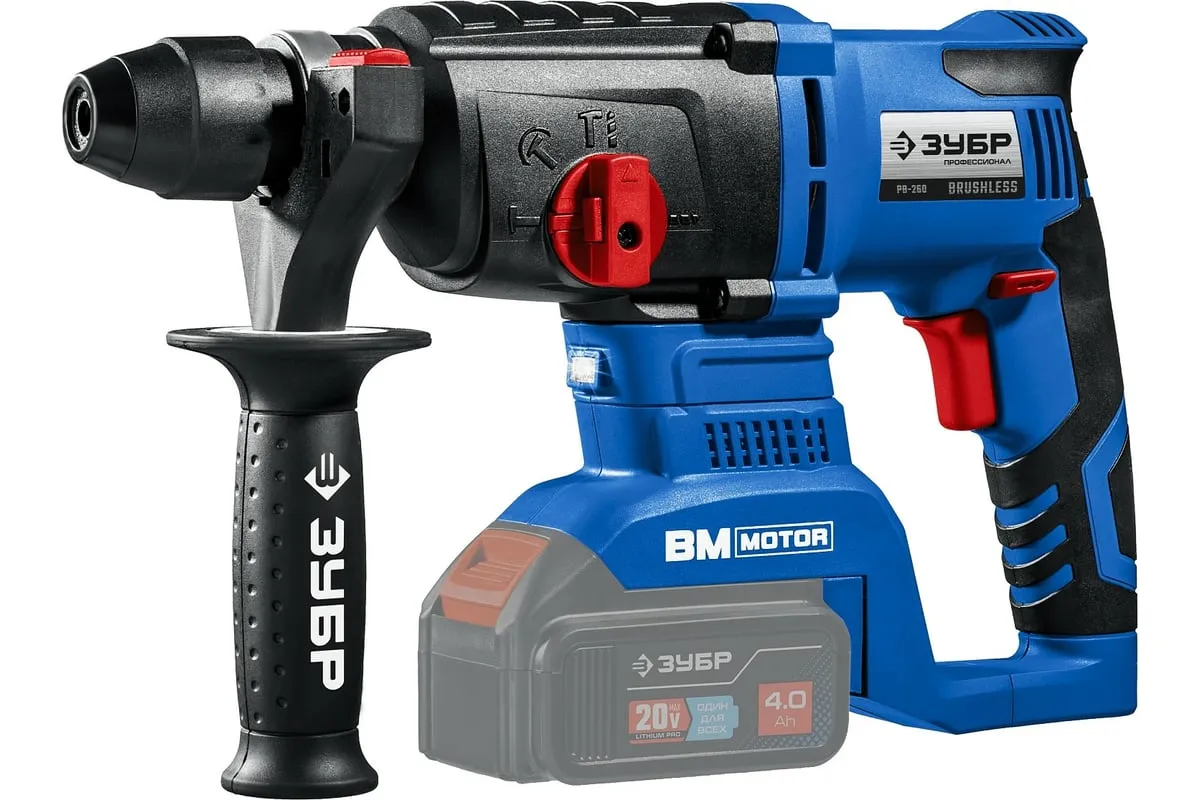Бесщеточный перфоратор ЗУБР Профессионал 20В PB-260 предназначен для сверления отверстий в различных материалах (дерево, сталь, бетон, кирпич и т. д.) в режимах сверления и сверления с ударом, а также ударного долбления при установке соответствующего инструмента. Большой диаметр и высокая скорость бурениядля максимальной производительности. Функции долбления и сверления без удара придают дополнительную функциональность. Патрон SDS-Plusдля быстрой замены расходного инструмента. Бесщеточный двигатель обладает целымрядом преимуществпо сравнению с обычным щеточным двигателем: