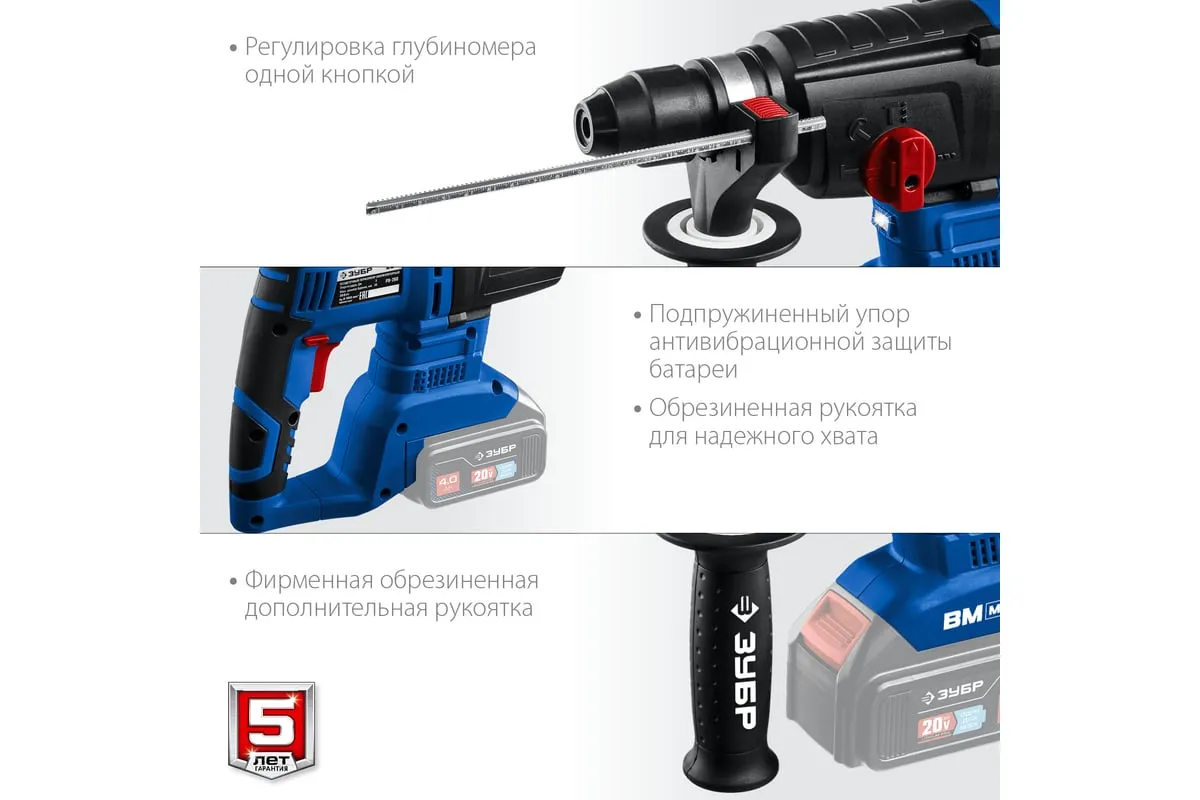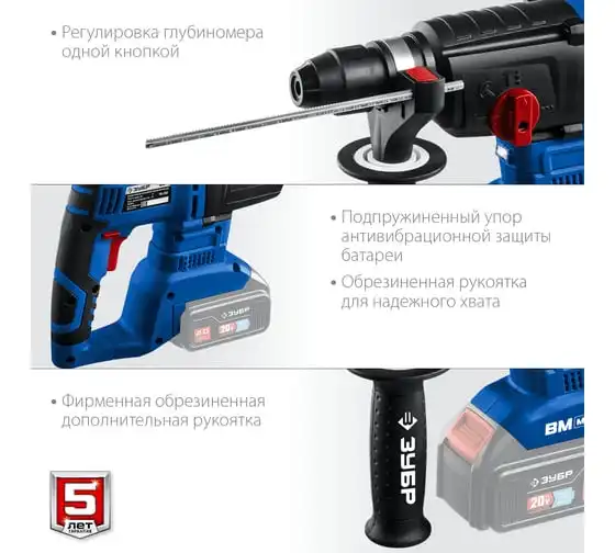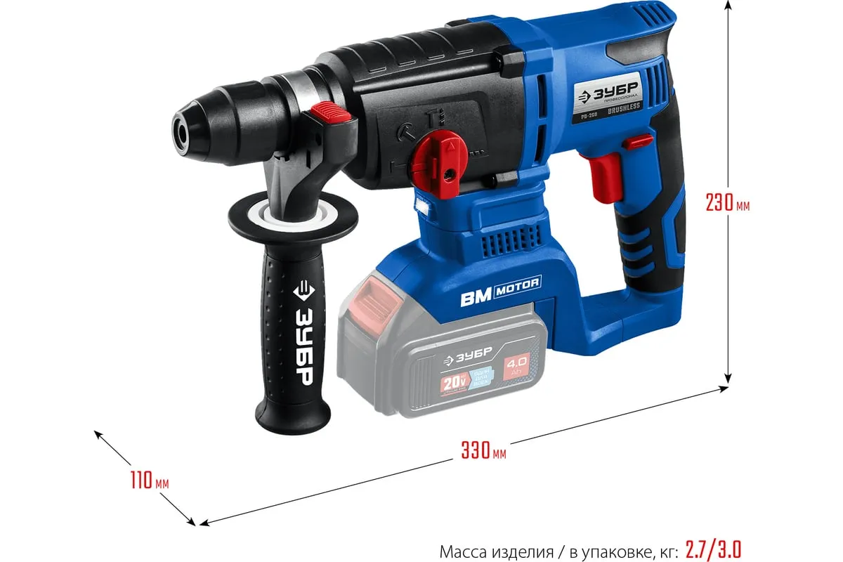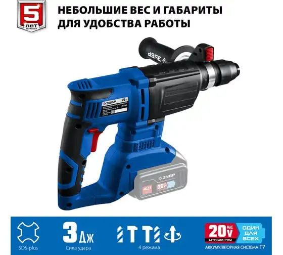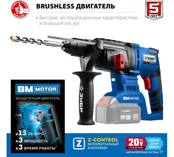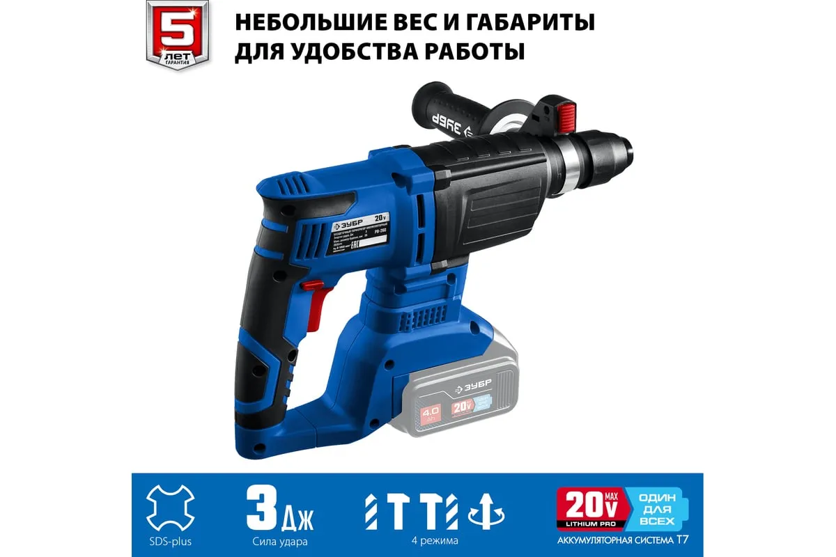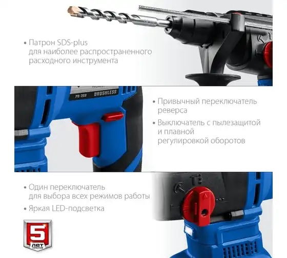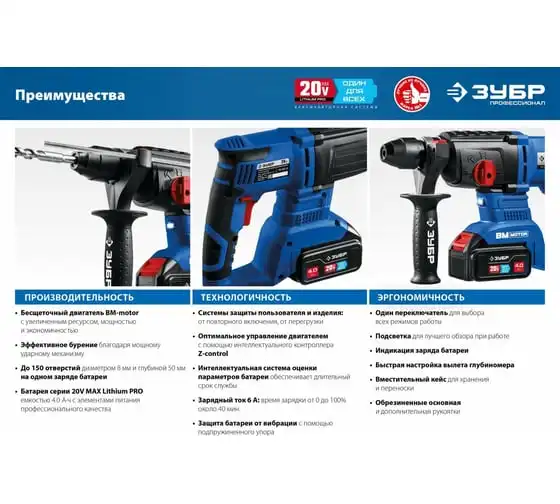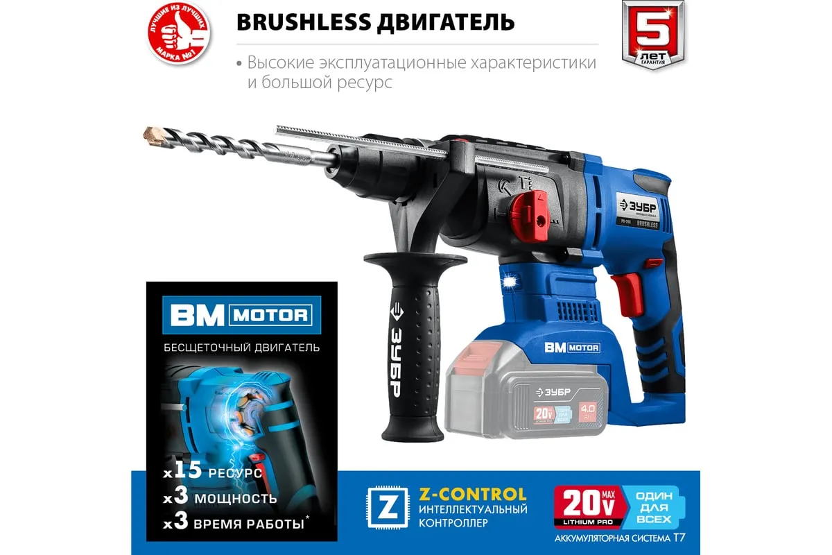 Бесщеточный перфоратор ЗУБР Профессионал 20В PB-260 предназначен для сверления отверстий в различных материалах (дерево, сталь, бетон, кирпич и т. д.) в режимах сверления и сверления с ударом, а также ударного долбления при установке соответствующего инструмента. Большой диаметр и высокая скорость бурениядля максимальной производительности. Функции долбления и сверления без удара придают дополнительную функциональность. Патрон SDS-Plusдля быстрой замены расходного инструмента. Бесщеточный двигатель обладает целымрядом преимуществпо сравнению с обычным щеточным двигателем: