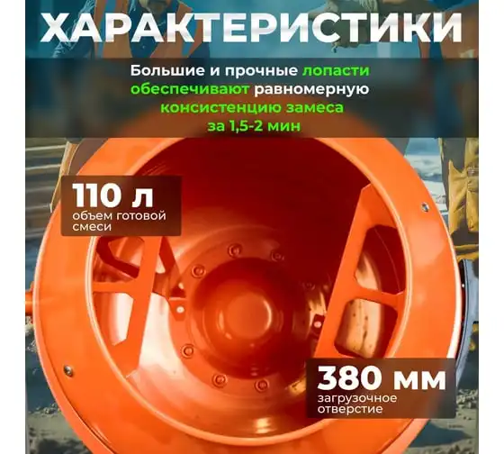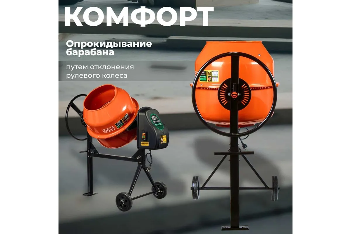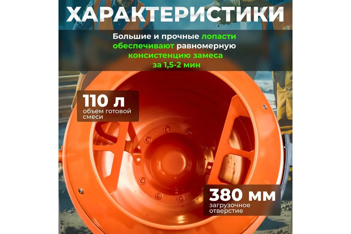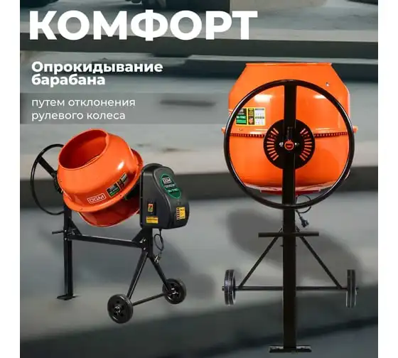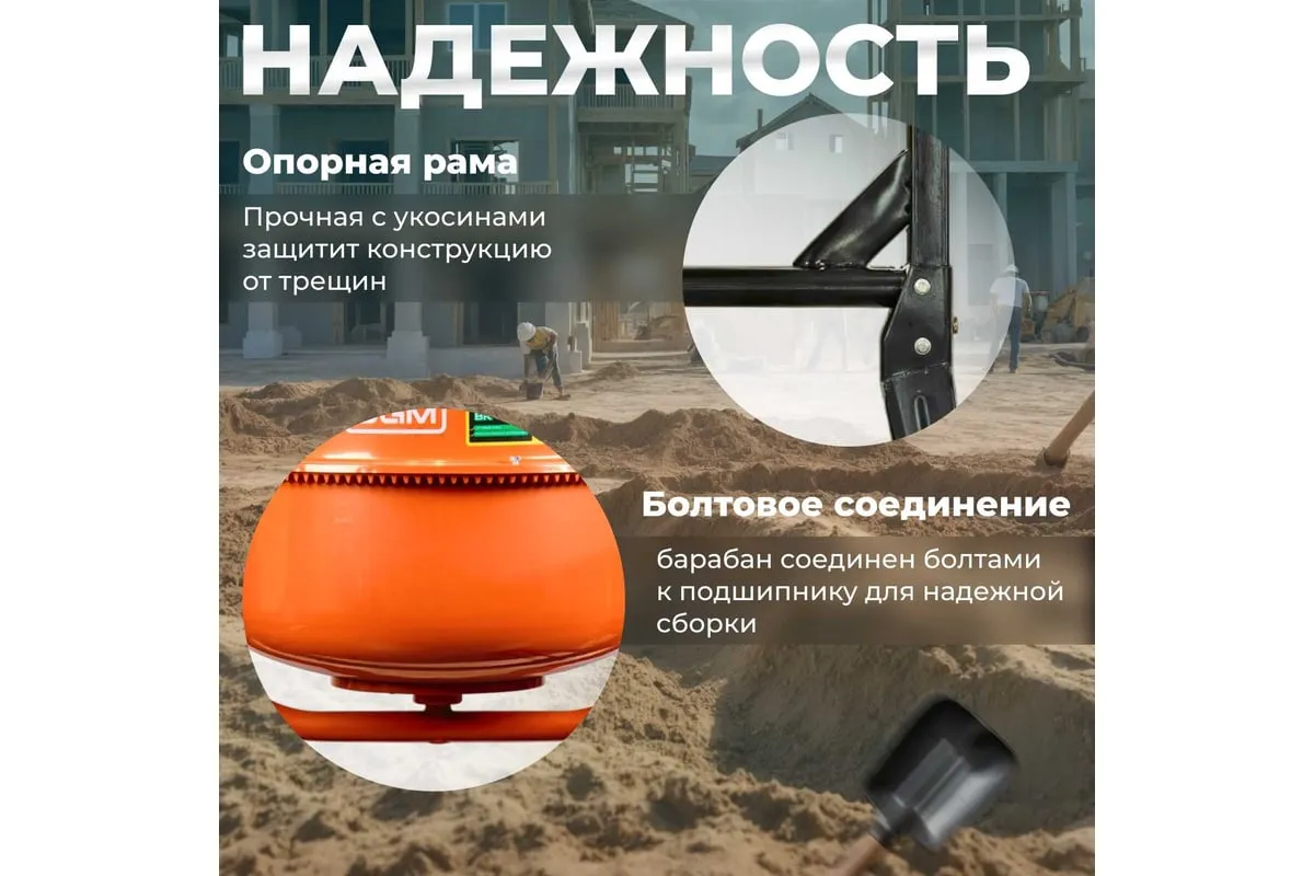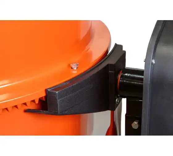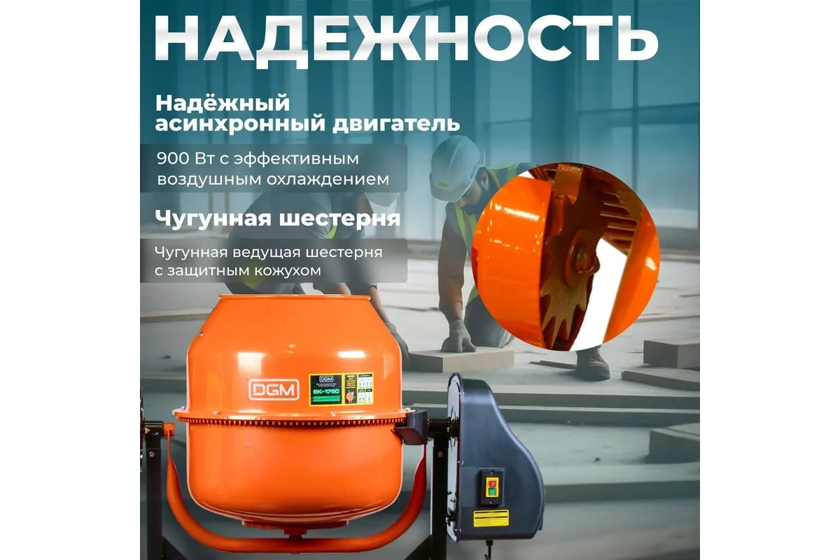 Опрокидывание барабана путем отклонения рулевого колеса. Защитный кожух на ведущей шестерне. Асинхронный двигатель с термозащитой. Болтовое соединение барабана к подшипнику. Чугунная ведущая шестерня. Чугунный зубчатый венец. Эффективное воздушное охлаждение двигателя. Высокопрочный приводной ремень ручейкового типа, усиленный синтетическим армирующим кордом.