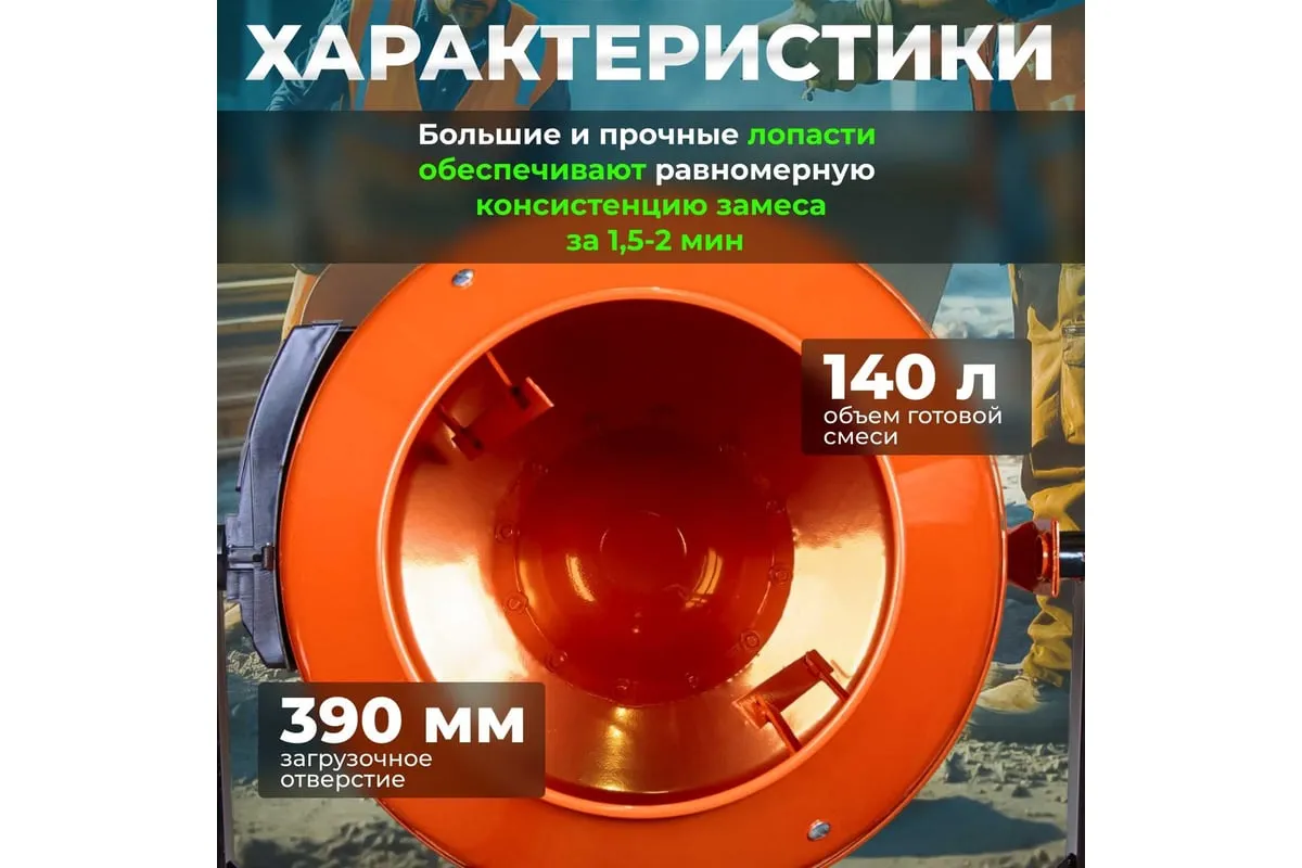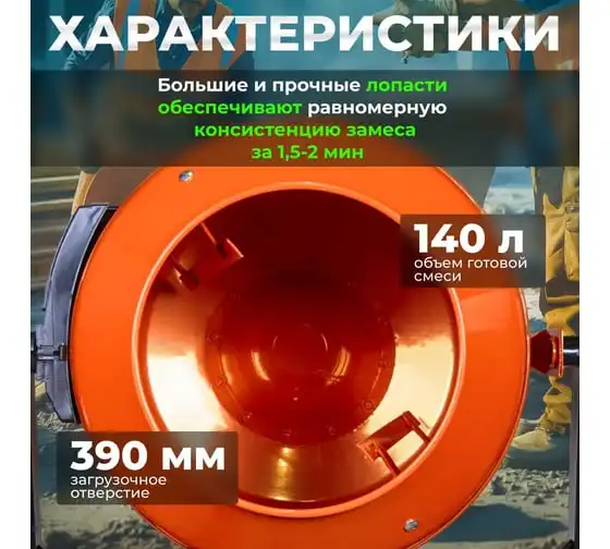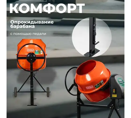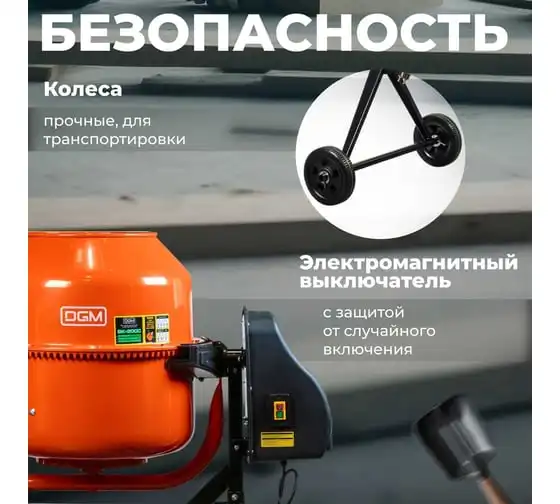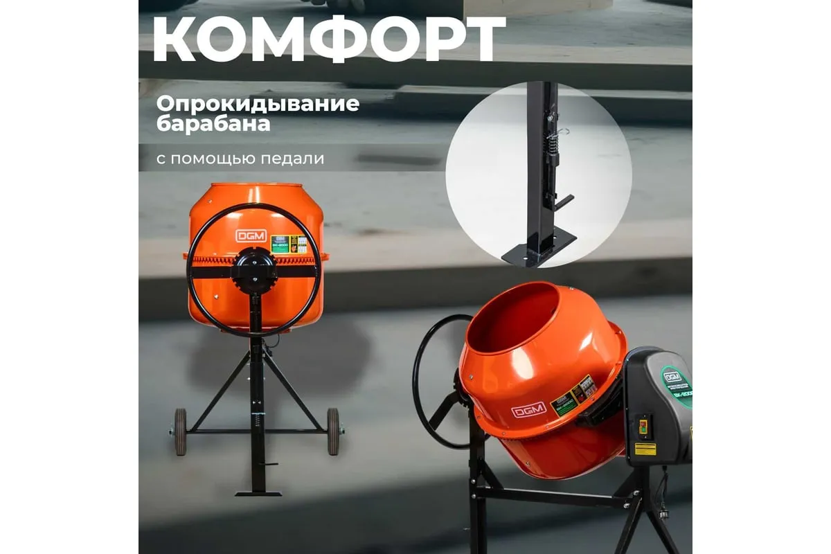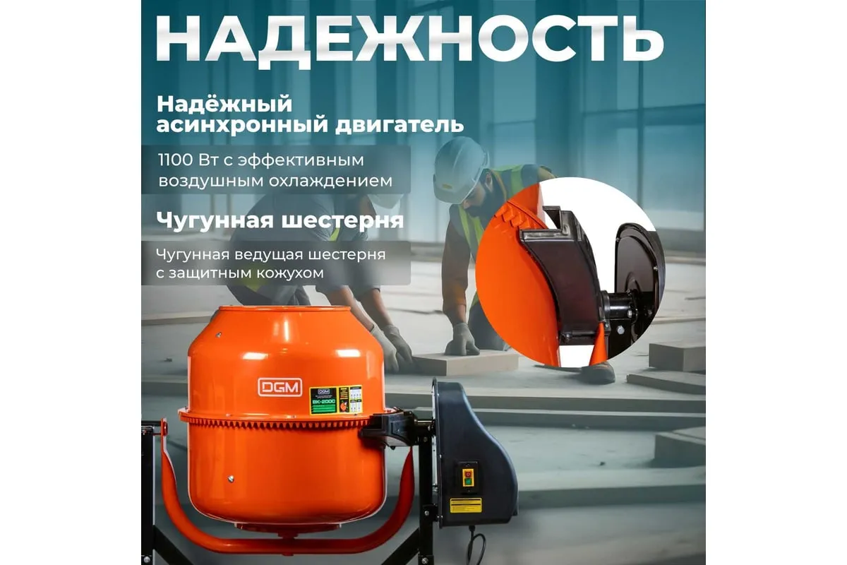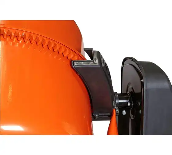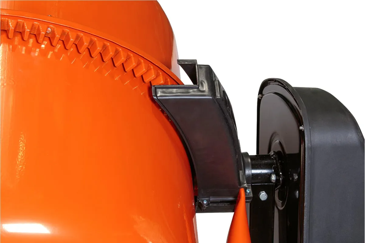 Опрокидывание барабана путем отклонения рулевого колеса. Защитный кожух на ведущей шестерне. Асинхронный двигатель с термозащитой. Болтовое соединение барабана к подшипнику. Чугунная ведущая шестерня. Чугунный зубчатый венец. Эффективное воздушное охлаждение двигателя. Высокопрочный приводной ремень ручейкового типа, усиленный синтетическим армирующим кордом.